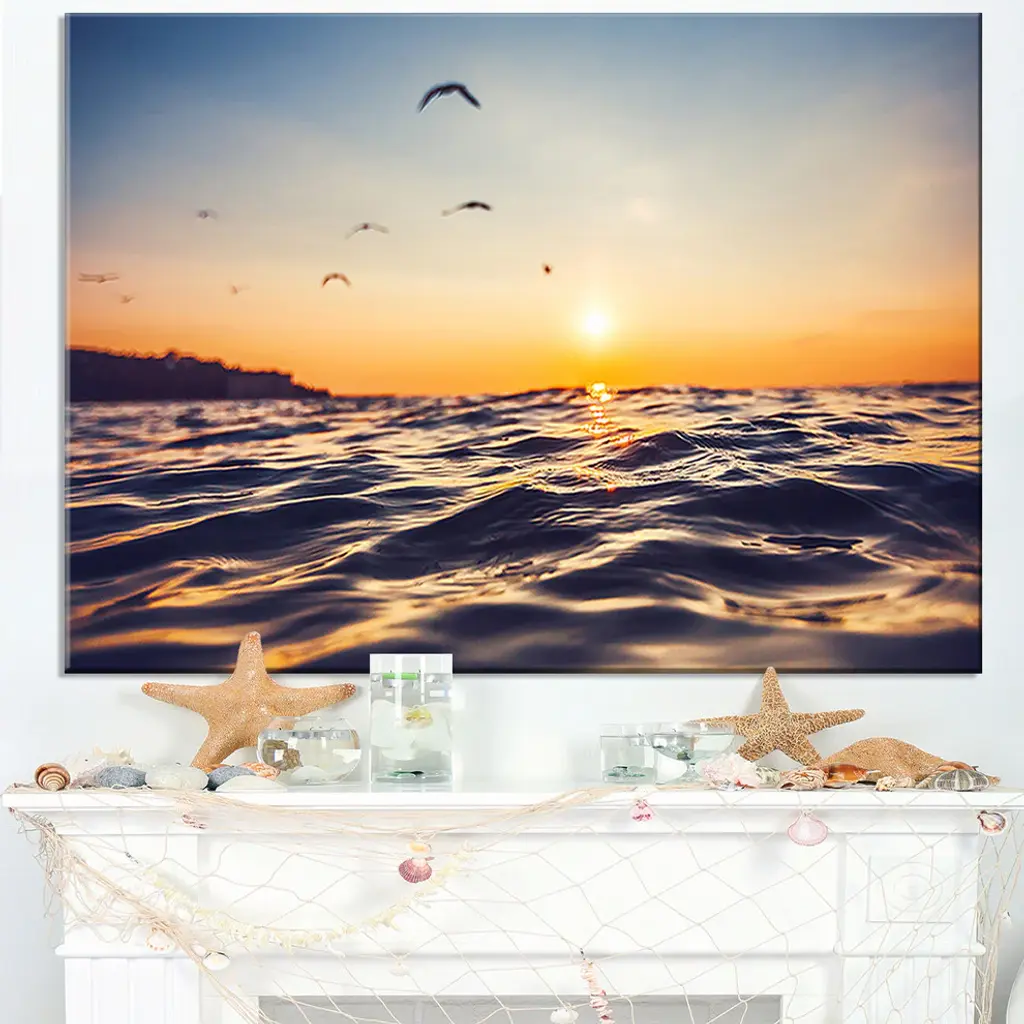 The Orange Tinged Sea Waters at Sunrise canvas art print is sure to make an impression on anyone who sees it. This artwork is gallery wrapped around a 1-inch solid wood frame and arrives carefully packaged and entirely ready to hang on the wall. Design Art only uses the highest resolution and pigments to ensure a crisp colorful print that is never faded or pixelated. This artwork is sure to be a conversation starter in any home or office.