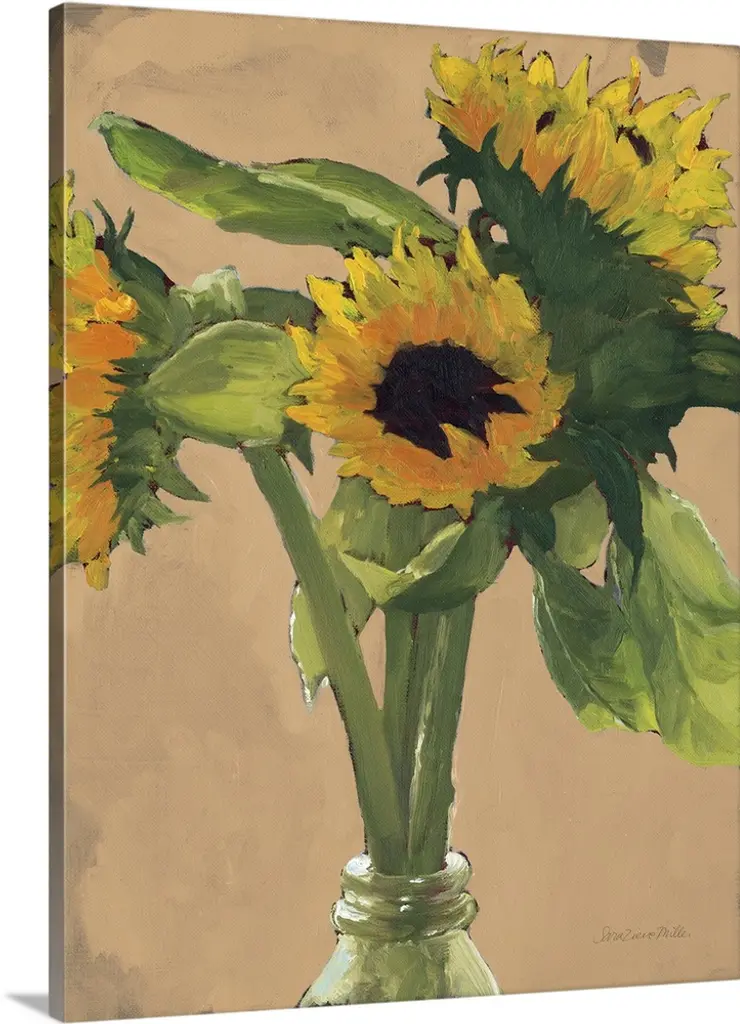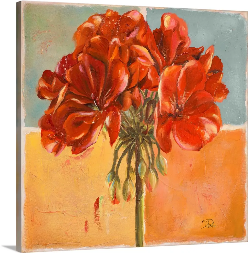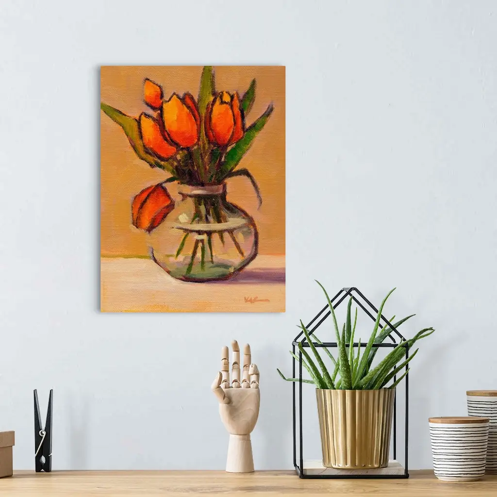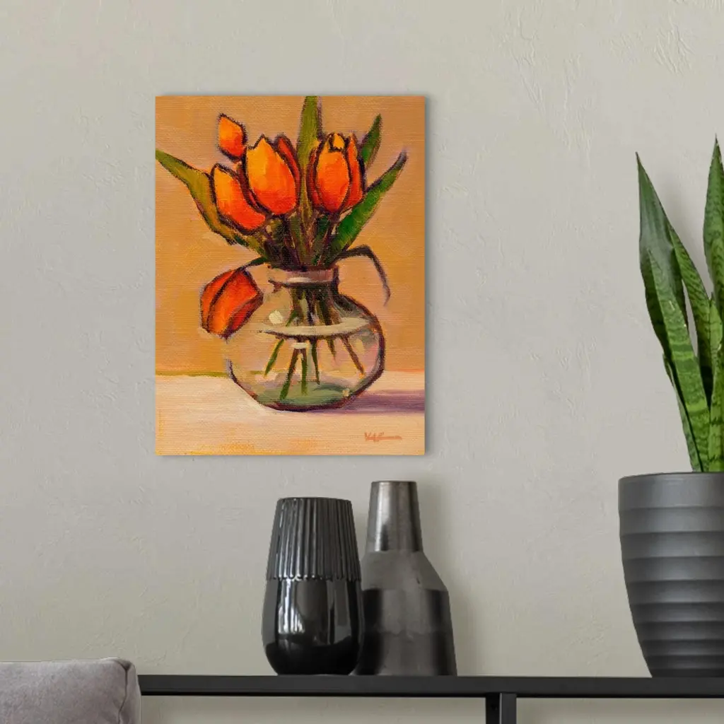 A vertical contemporary painting of a glass vase of eloquent flowers.