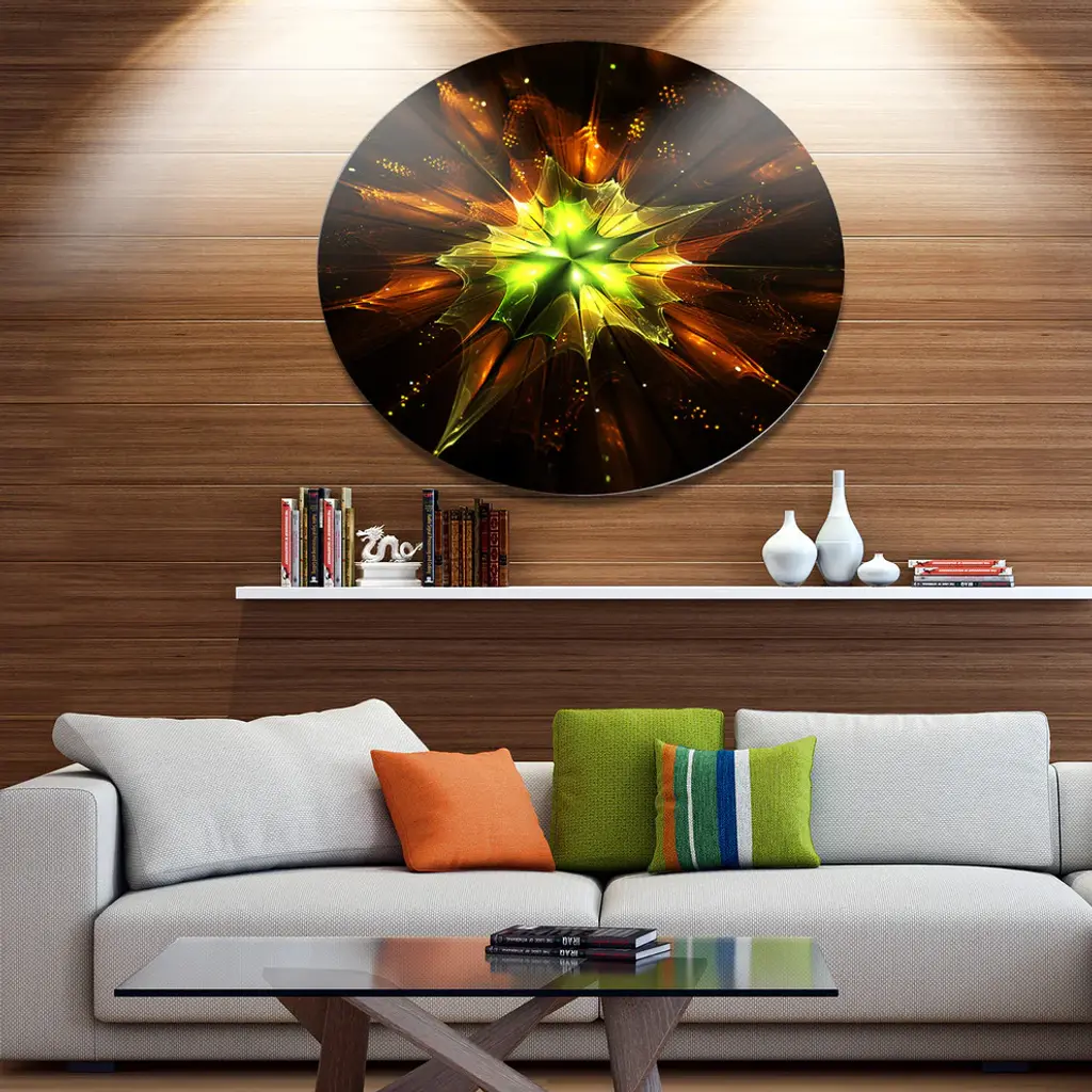Bring Contemporary Abstraction to your home with this large Circle Metal wall art. This Orange Yellow Green Fractal Flower Metal Artwork makes it the focal point of any room or office. - White Gloss Coating ensures colors are extra vibrant with light reflection.- Aluminum grade Sheet Metal with 1 inch mounting frame on the back giving the illusion that the artwork is floating on the wall..- Mounting Brackets are included along with instructions.- High Quality Digital images are created directly into a glossy aluminum panel producing a stunning and captivating print into the glossy finish of the metal.- Water, Fire and Scratch resistant HD Aluminum panels.- Looks better than any photo paper and guaranteed to last at least 20 years- Easy to clean with a microfiber cloth. Colors are far superior to regular Canvas Art. - Easy to Hang