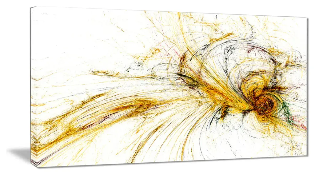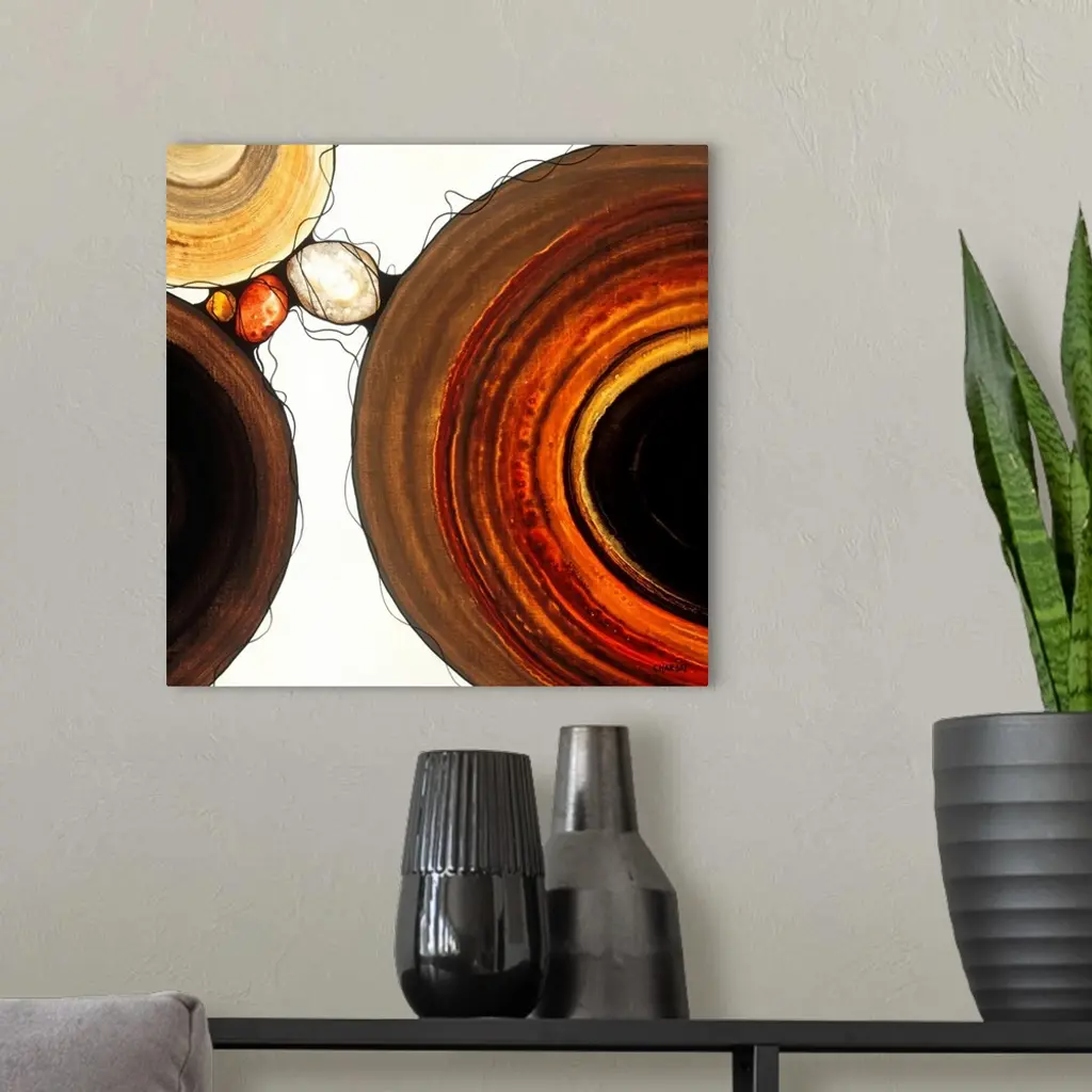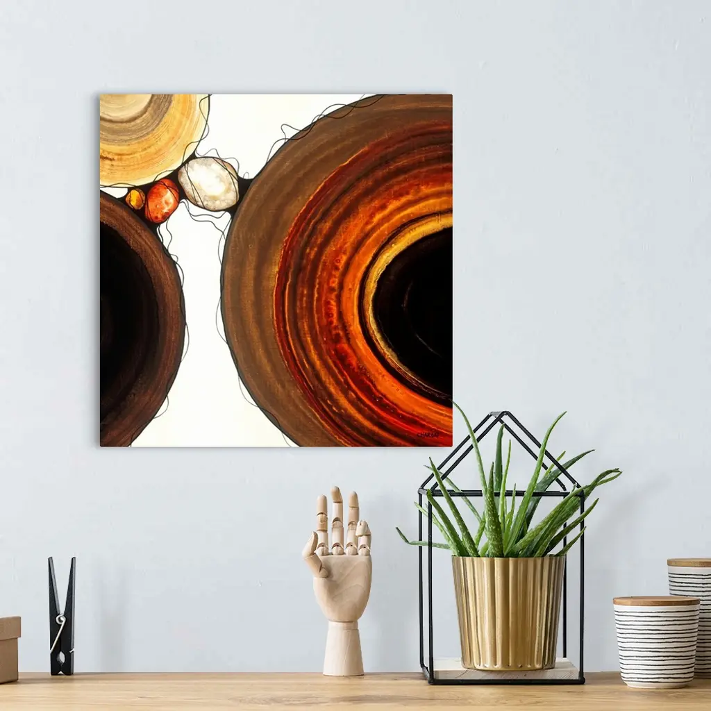 Abstract painting with a geometric circle designs in red, yellow, and orange tones on a faded cream background with small, thin, black squiggly lines on a square canvas.