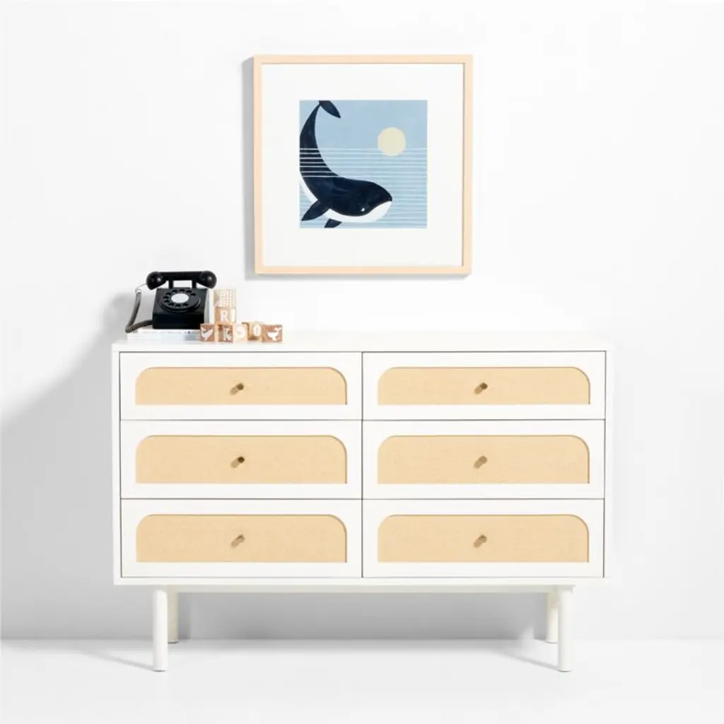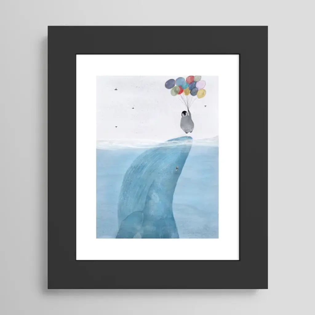 A swimming orca adds colorful, deep-sea style to the nursery, bedroom or playroom. The imperfect stripes add a charming touch to Chicago-based illustrator Betsy Siber's undersea creation, as does the whale's sweet expression. This high-quality giclee print is presented with a white mat and a natural wood frame for a modern look that perks up any space. Display it solo or as part of a curated gallery wall.