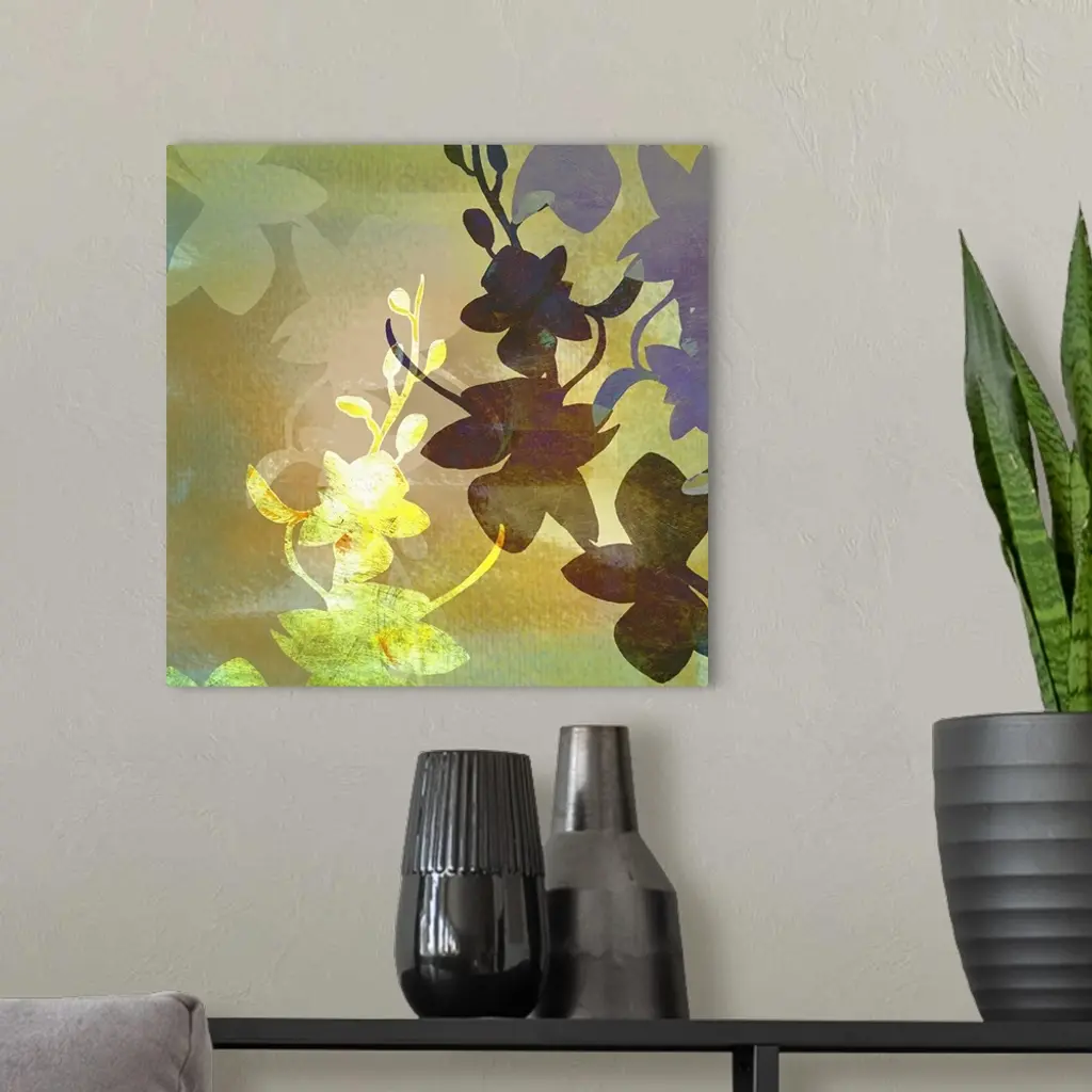 Square, large artwork outlining several groups of orchids, in a variety of golden and darker colors and textures from light to dark, creating a strong sense of depth.