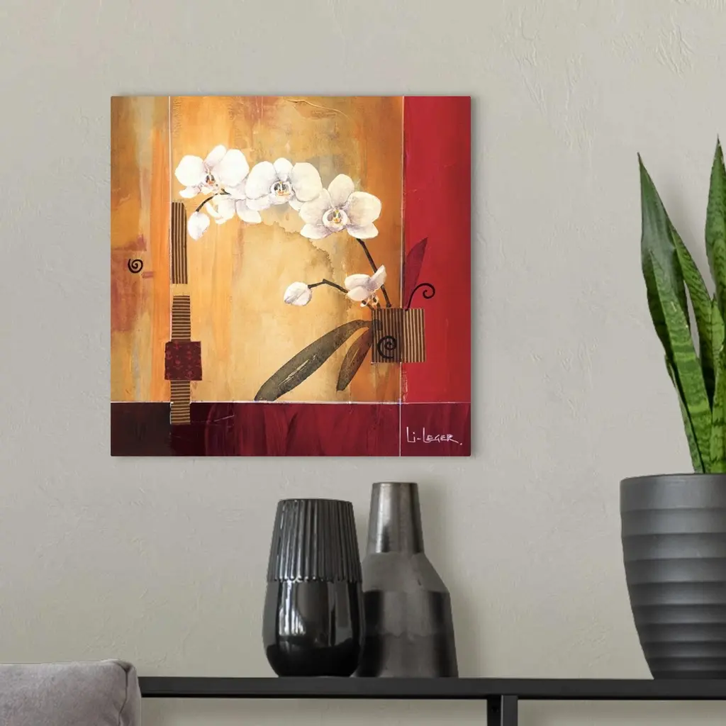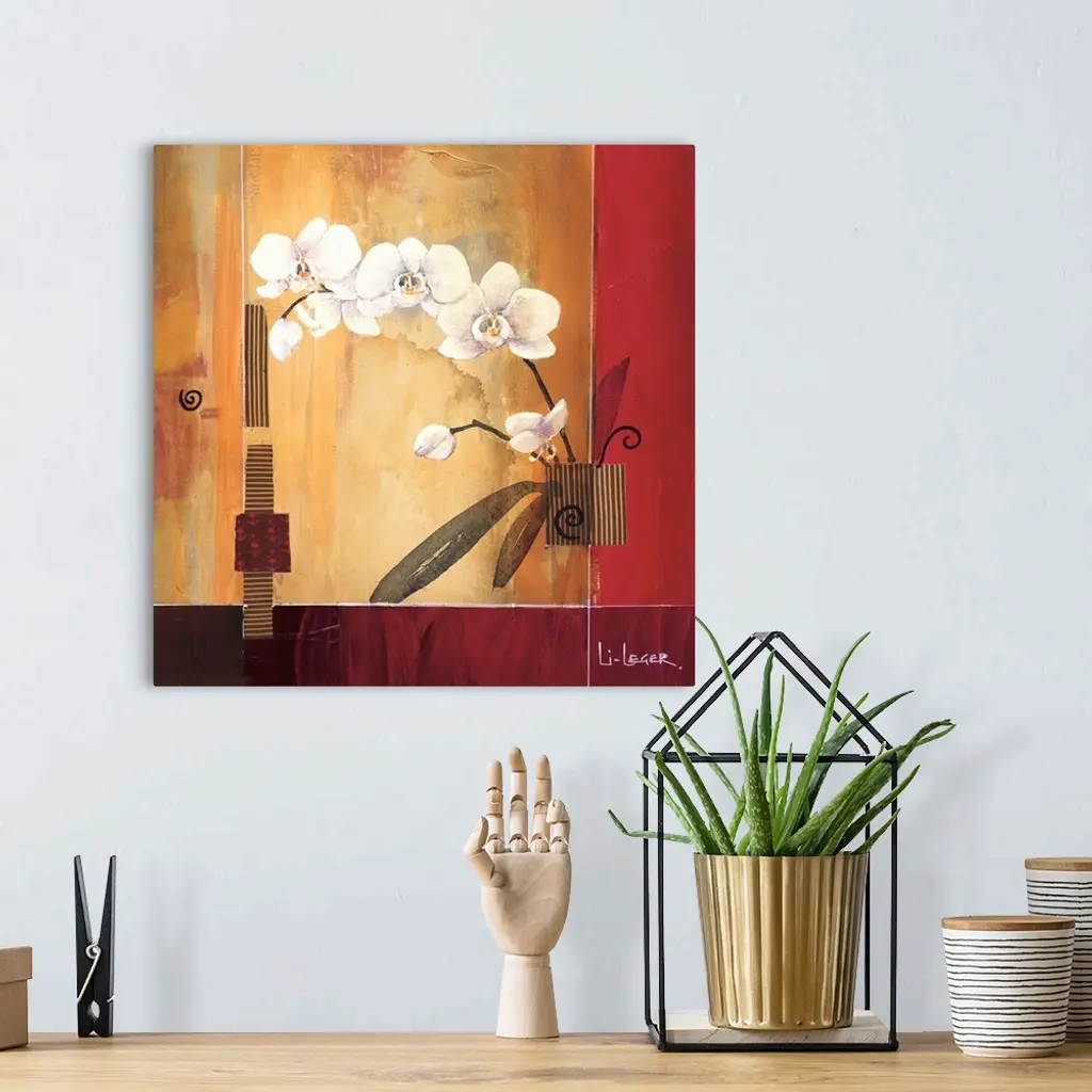 A contemporary painting of white orchids with a square grid design.
