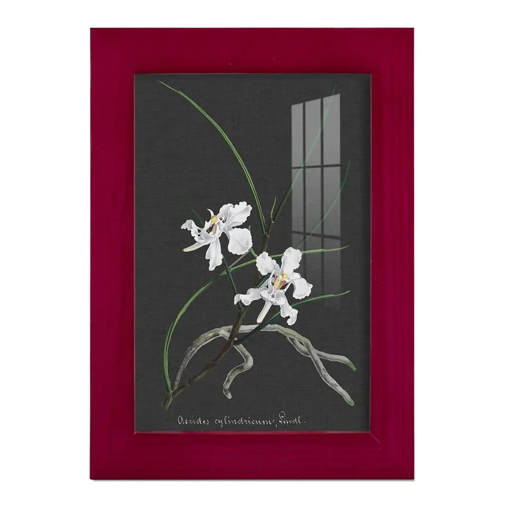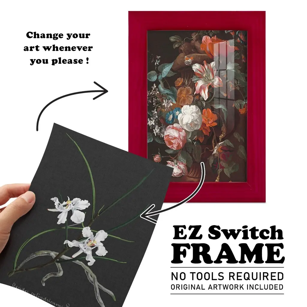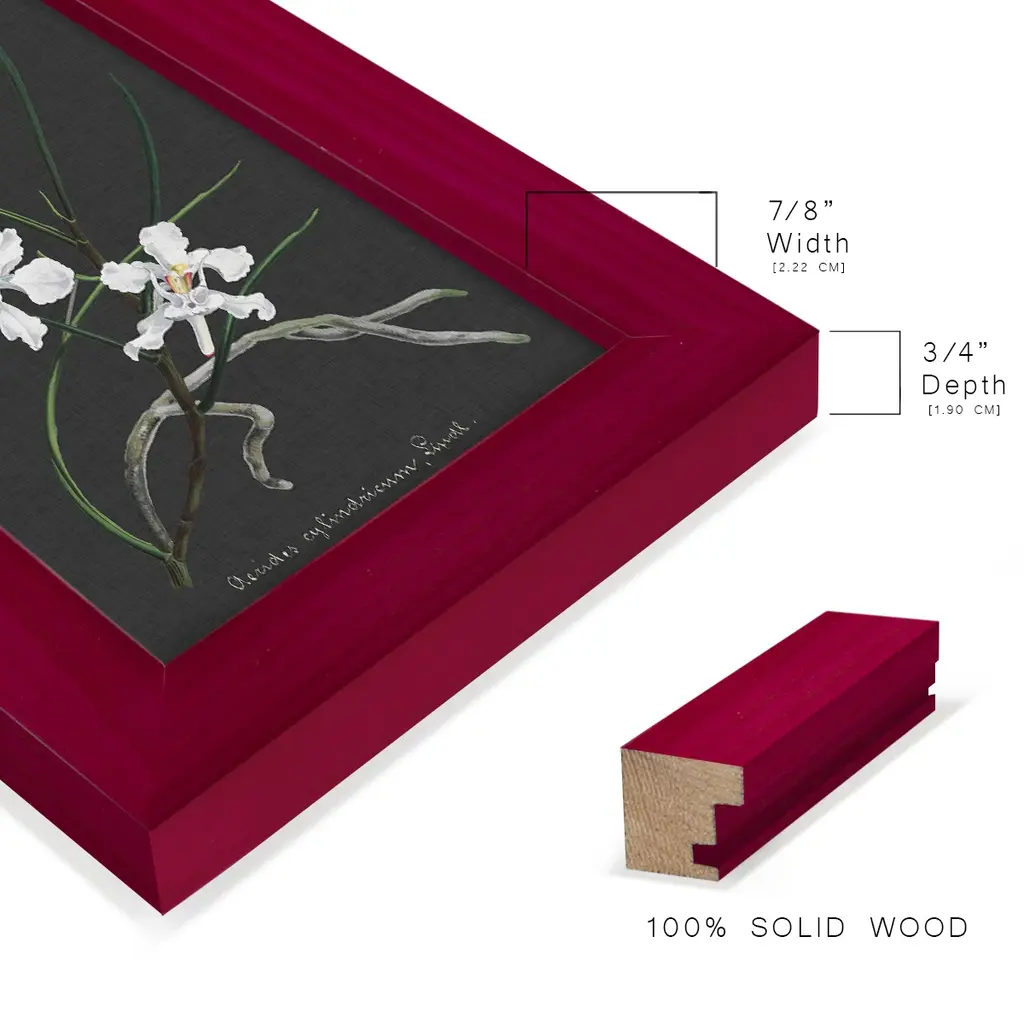 Orchid on Slate II -EZ SWITCH Framed Print w/glass-Cherry Red A delightful, framed print. Featuring a solid wood frame with real wood glass. This premium print is giclee quality. In addition, every frame features a removable back and table top stand. This allows you to change your art in the future or to just stand the art on a table for a new look. We are sure you'll enjoy our new series of EZ SWITCH Framed Art. Solid Wood Frame Real Glass Removable / Replaceable Art Built in Tabletop Stand Sizes range from 4x6 up to 12x15 - buy just one or pair them up as sets as you see fit.