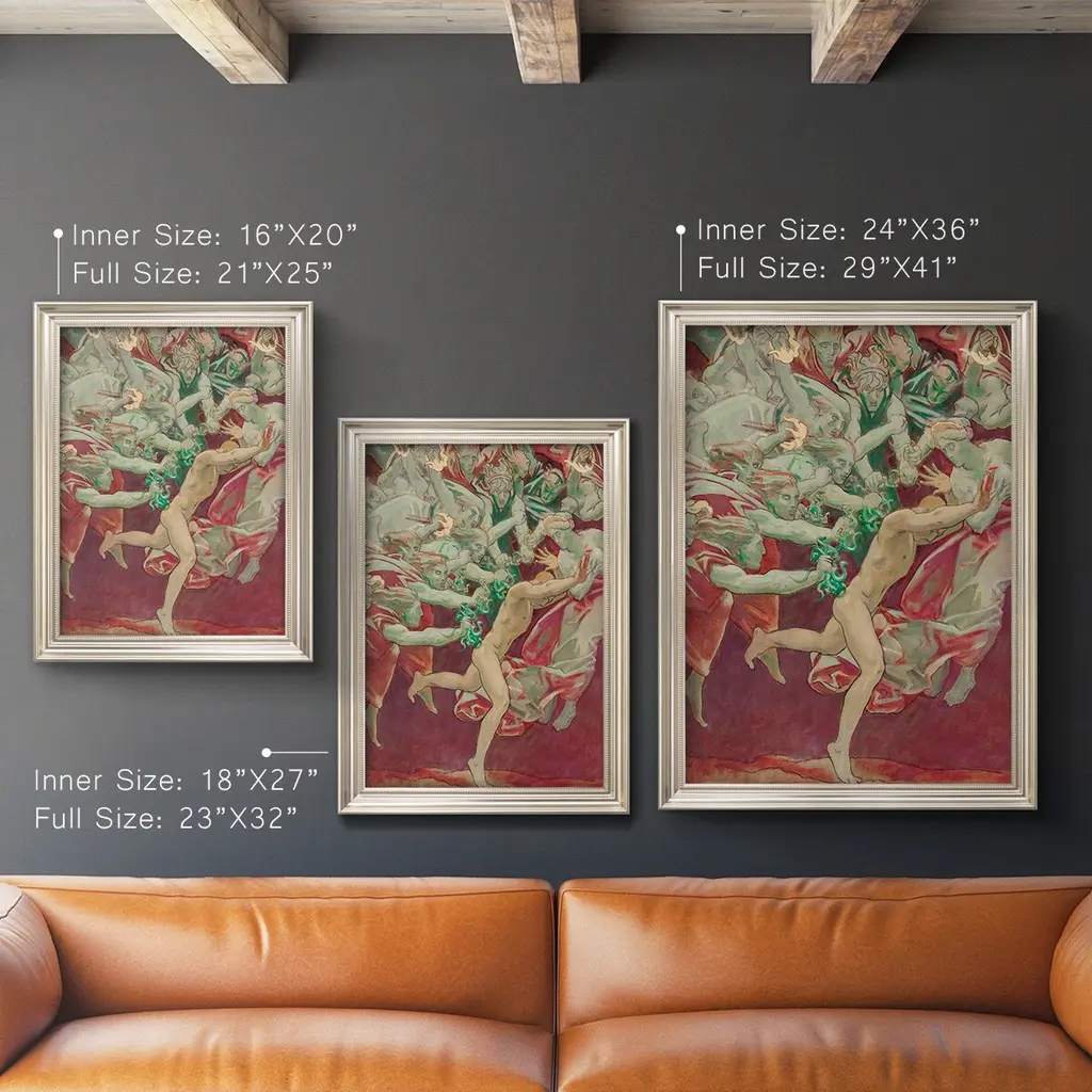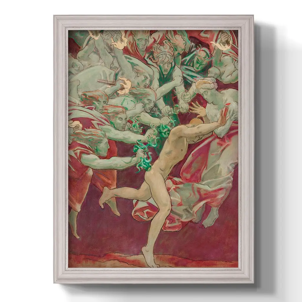 Orestes and the Furies Premium Framed Canvas- Ready to Hang A Premium Framed Canvas created to last. Framed in distressed wood and available in an array of sizes and colors Featuring a beveled a solid wood stretcher bar, each piece comes ready to hand 3 SIZES AVAILABLE 16''X20'' - Overall Size 18'X27'' - Overall Size 24''x36'' - Overall Size Each piece is made to order. Each piece comes with hanging hardware. Made in the USA Ready to Hang Giclee Paper Print Acrylic Glass Beveled Matt Board