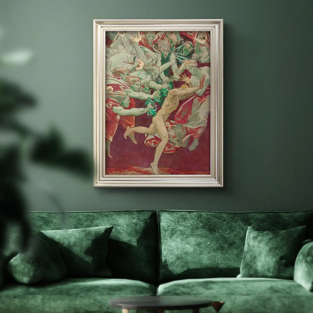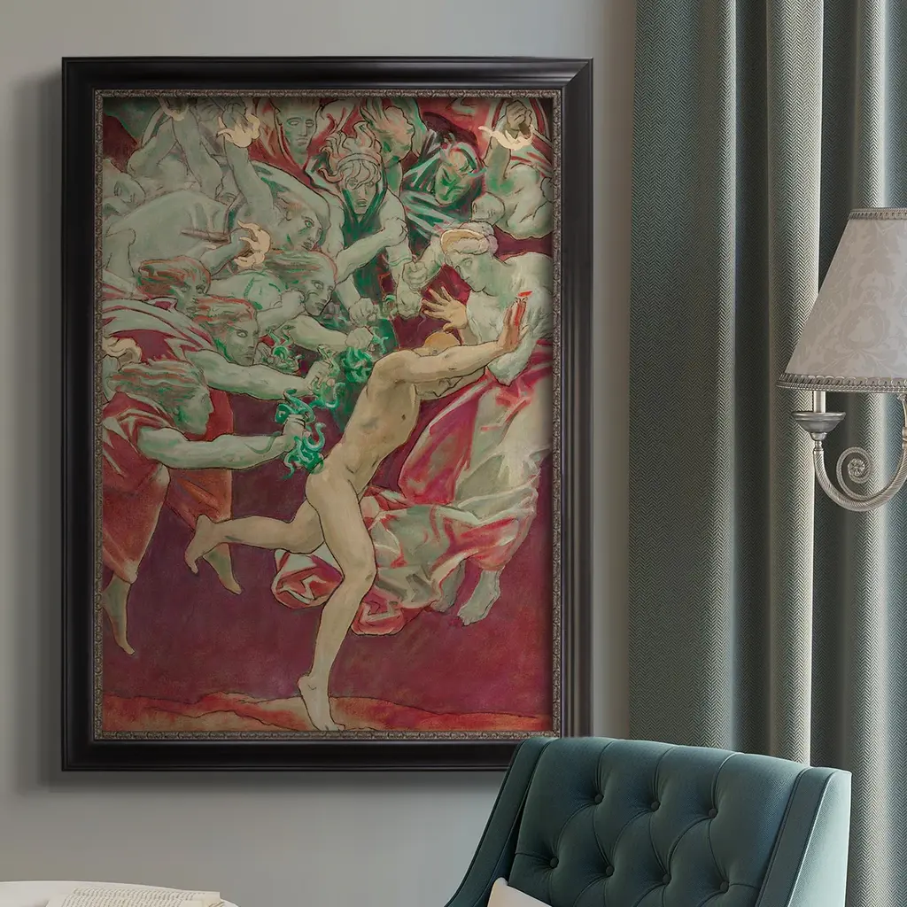 Orestes and the Furies Premium Framed Canvas- Ready to Hang A Premium Framed Canvas created to last. Framed in distressed wood and available in an array of sizes and colors Featuring a beveled a solid wood stretcher bar, each piece comes ready to hand 3 SIZES AVAILABLE 16''X20'' - Overall Size 18'X27'' - Overall Size 24''x36'' - Overall Size Each piece is made to order. Each piece comes with hanging hardware. Made in the USA Ready to Hang Giclee Paper Print Acrylic Glass Beveled Matt Board