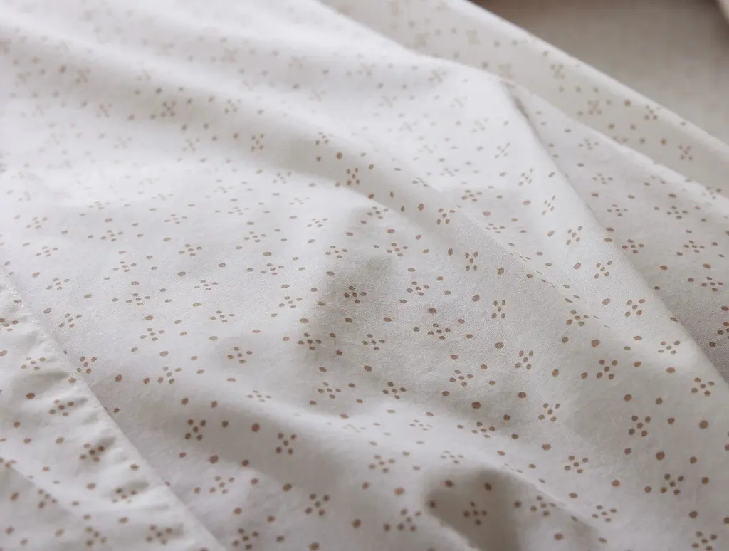 Original patterns are printed onto a soft and breathable percale, using low impact dyes that pair well with our classic Coyuchi colors. The vine pattern is inspired by a Sarasa print, which is hand painted by a designer to mimic cotton blossoms, then rotary printed. Saturated accents add subtle pops of color to the neutral palettes. The dot pattern draws from antique woodblock printing, creating a shrunken print in a simple dotted design. 100% plant-based softener 100% Fair Trade certified organic cotton is grown + woven in India GOTS Certified