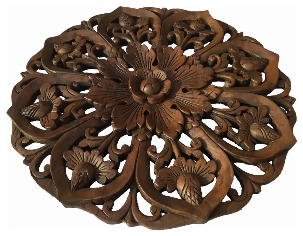 This oriental carved lotus flower wood plaque will add a captivating elegance to your room. Made from teak wood carved by fine Thai craftsman. Creating luxurious decorative designs from traditional to contemporary home. Bring warmth and character to any room in your home.SIZE WEIGHT COLOR MATERIALHeight: 24 InchesWidth: 24 InchesThickness: 1 InchesWeight: 6.5 lbs.Material: Teak WoodHandmade: YesProducts come with hanger and screw set. Customers have to mount your own hangers. Please note that you may see a slight difference in color as compared to that seen on your computer screen. Also, since most products are handmade and they are crafted from natural wood, there may be a slight size variation.