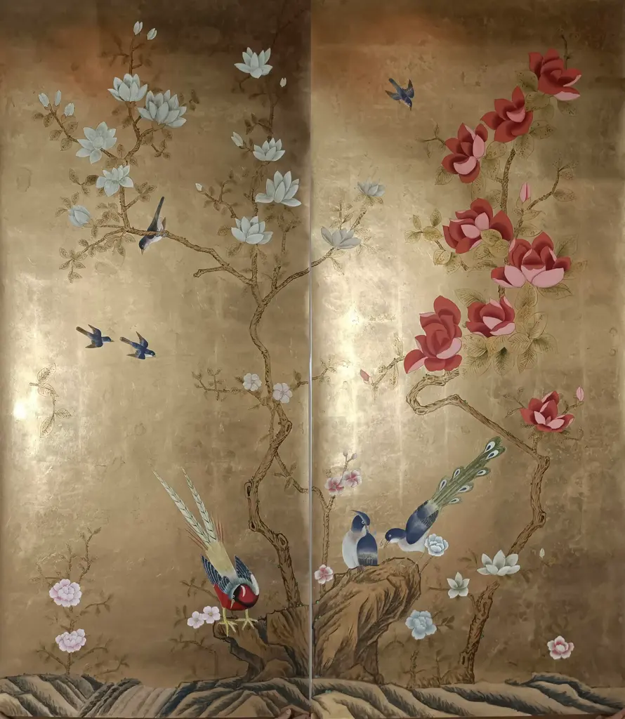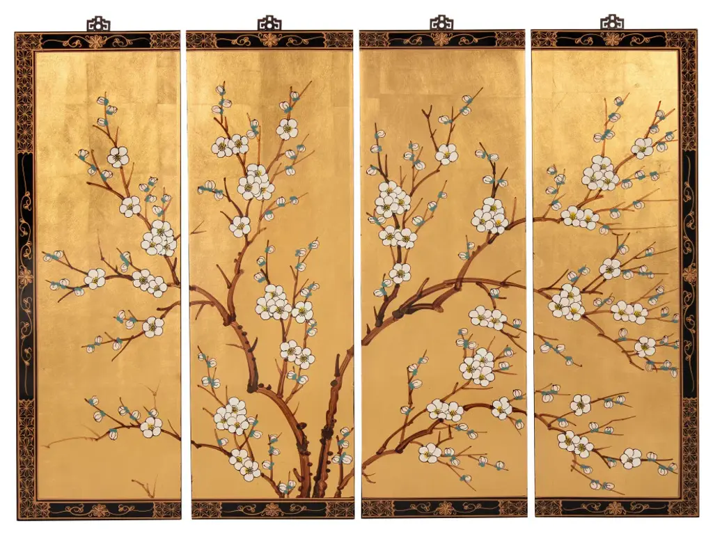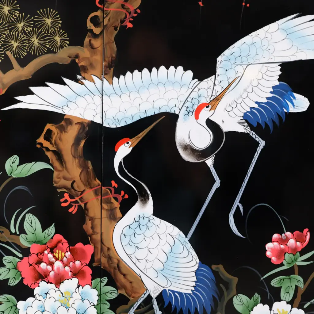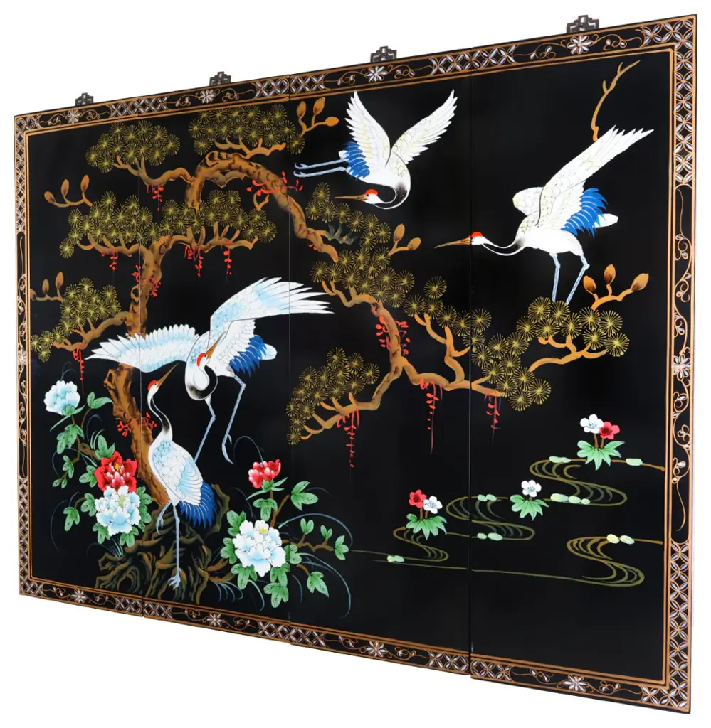 48 inch wide Chinese wall hanging hand painted cranes and pine tree on a shiny black background. Set of four panels with brass hangars measure 12 inches x 36 inches high by 4 Panels, Full length is 48 inch. Use above a cabinet, even as a headboard. Purchase now, supplies are limited on quality hand made imports.- Hand painted cranes and pine tree design- 4 panels- Hand made- Import direct pricing