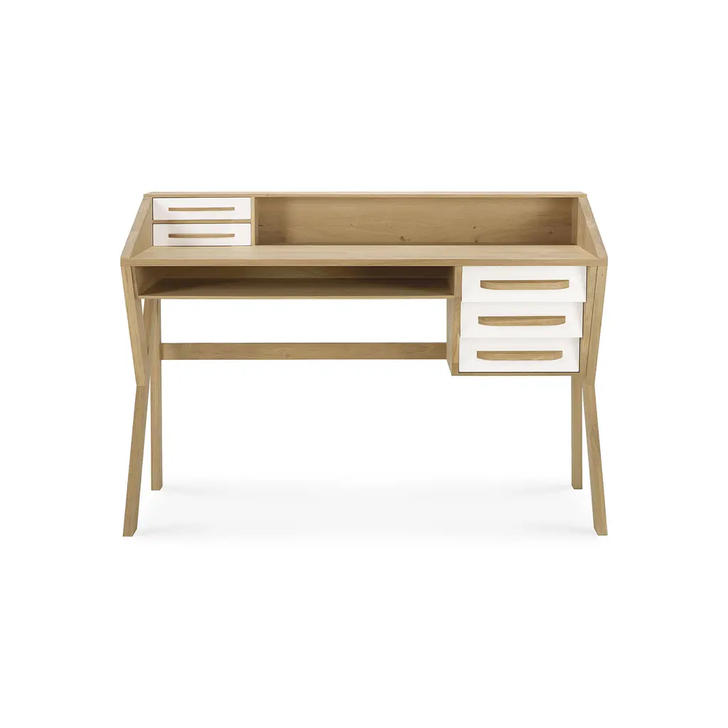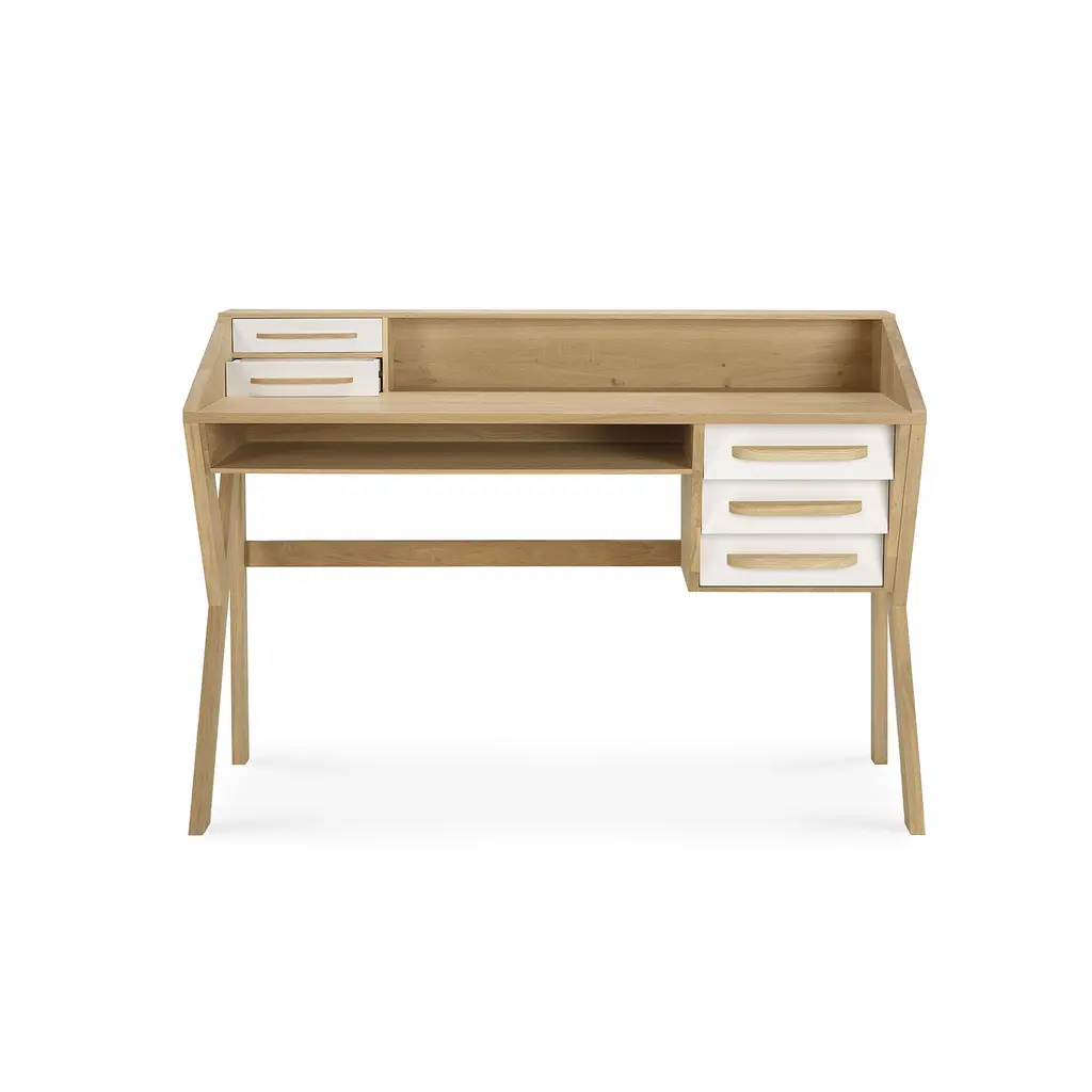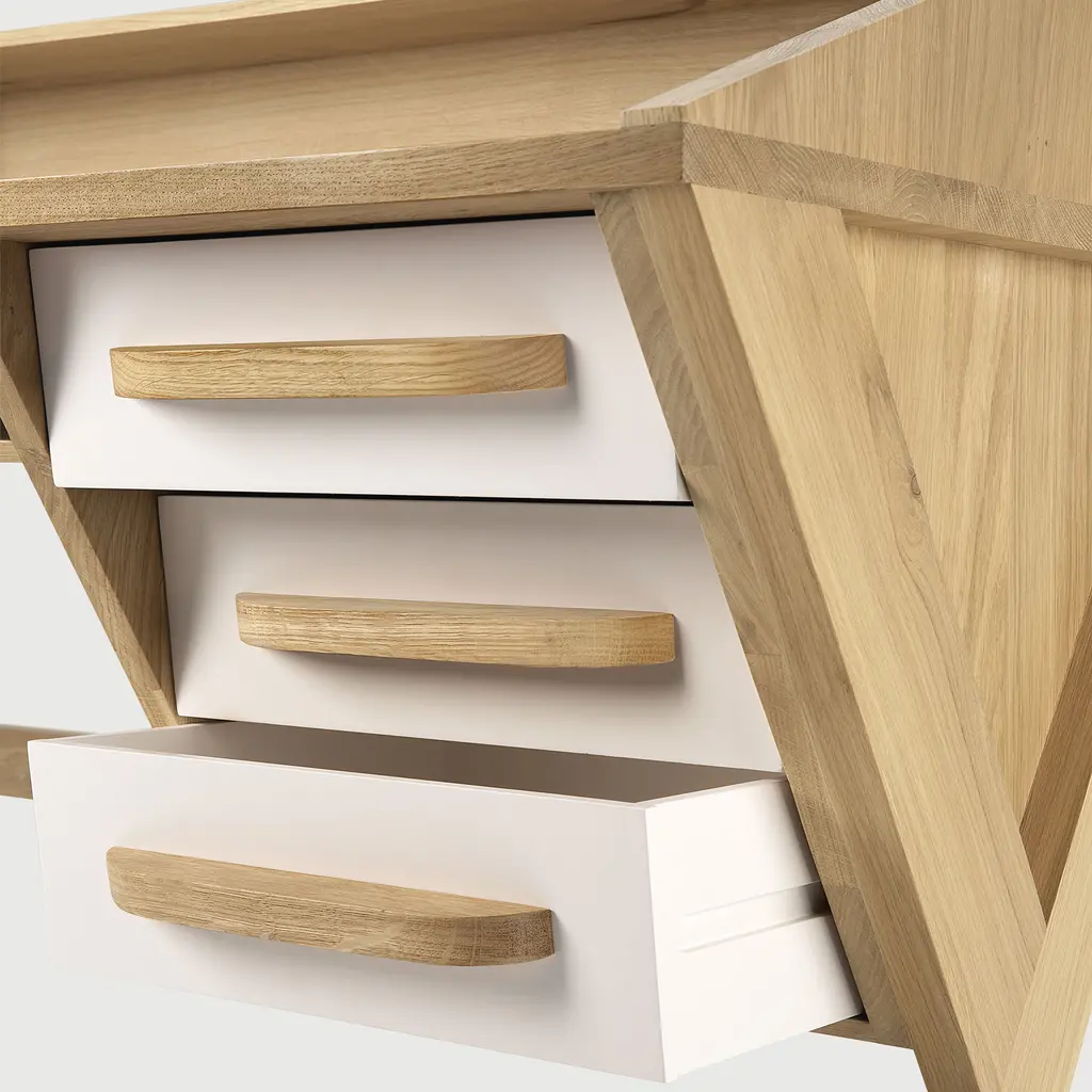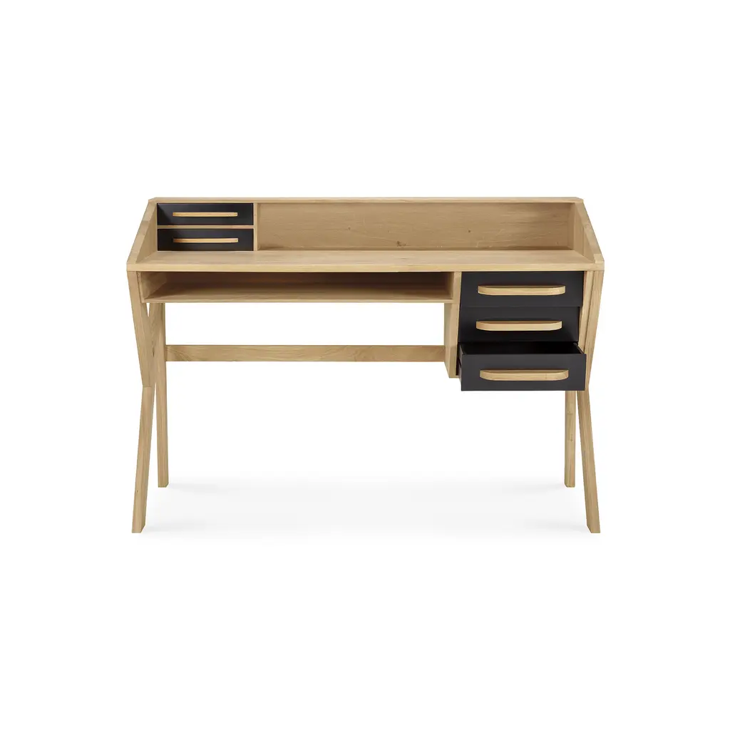 Inspired by retro-style furniture, the Ethnicraft Origami Desk offers the perfect way to create a fun but stylish and extremely practical workspace at home. The desk features origami-inspired details in dark or light hues that contrast the natural colors of solid oak. Maximizing function, each desk features two drawers on the upper left side, three larger drawers on the lower right side, and an open shelf beneath the top. Additionally, the top of the Origami Desk allows users to place a range of items to keep them close at hand, or decorative objects like small plant pots, vases or artworks. Crafted from solid oak, these desks feature a hardwax oil finish.
