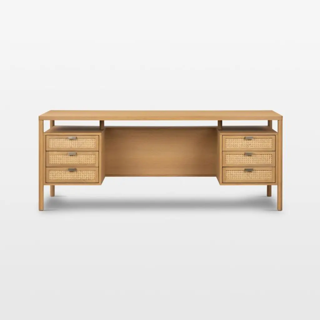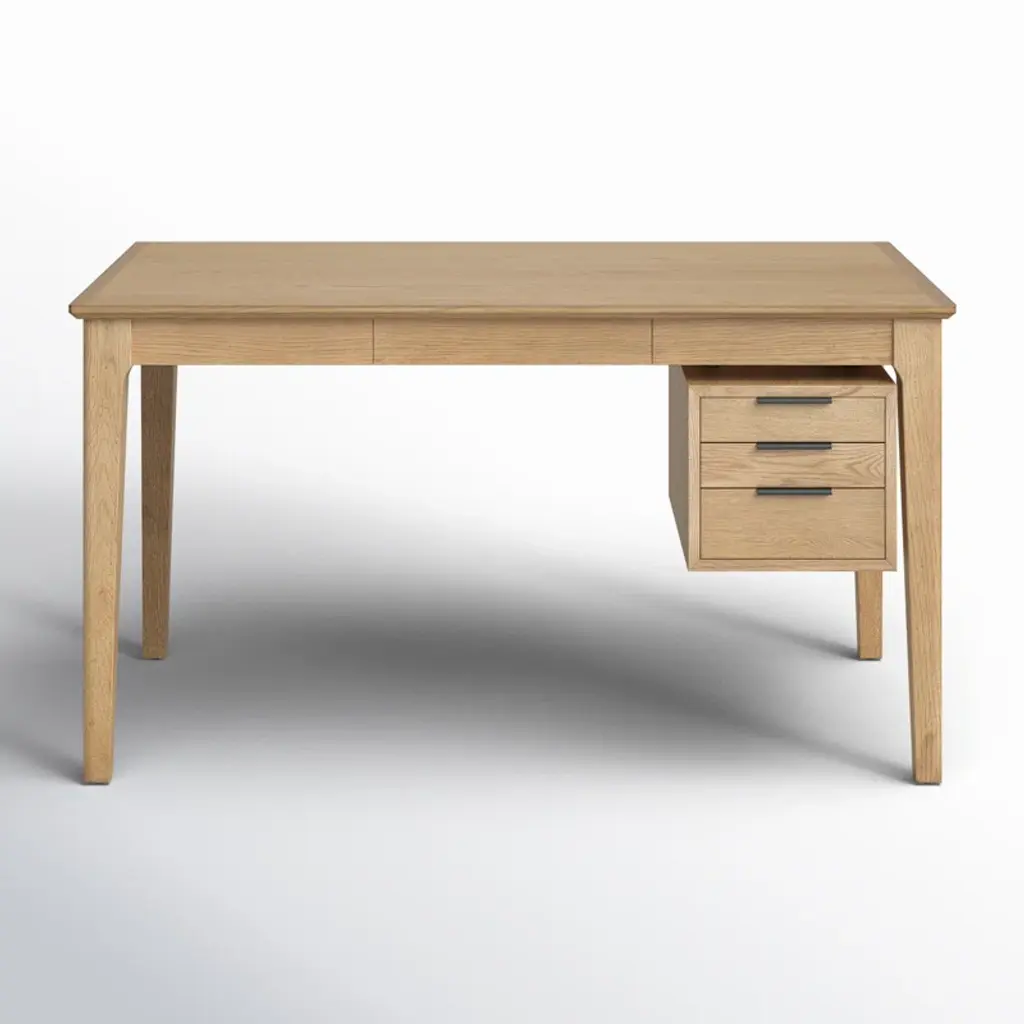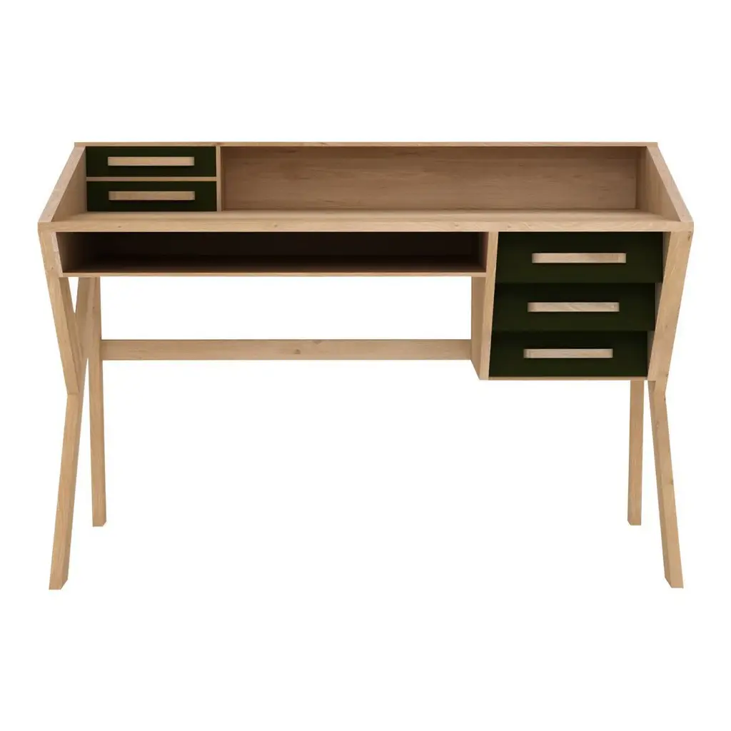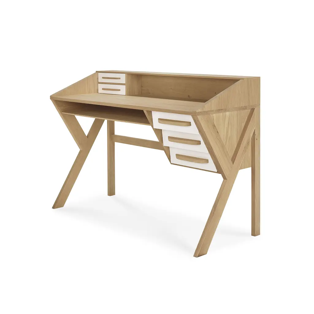 Inspired by retro-style furniture, the Ethnicraft Origami Desk offers the perfect way to create a fun but stylish and extremely practical workspace at home. The desk features origami-inspired details in dark or light hues that contrast the natural colors of solid oak. Maximizing function, each desk features two drawers on the upper left side, three larger drawers on the lower right side, and an open shelf beneath the top. Additionally, the top of the Origami Desk allows users to place a range of items to keep them close at hand, or decorative objects like small plant pots, vases or artworks. Crafted from solid oak, these desks feature a hardwax oil finish.