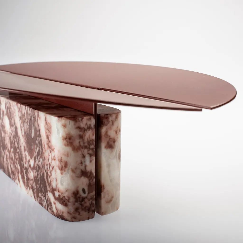 "Origin" in Ancient Red Marble is a centerpiece designed in 2020 by designer Alessandra Grasso, clearly inspired by Gustave Courbet's famous painting, Origine du Monde, to shamelessly celebrate the beauty and strength of the feminine universe. From a solid base of refined marble unravel the two metal lips, slightly tilted to accommodate fruits, bread and more.