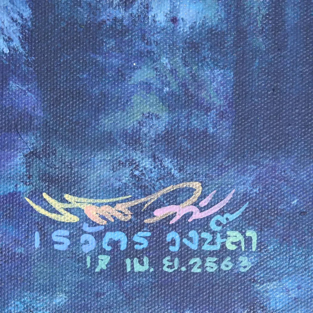 Sitting in a position of blessing, offering boons to the viewer, Buddha is supremely serene. Artist Rawat Vongla paints the original composition using acrylics on canvas, selecting a palette of tranquil blues to convey the peaceful mood.