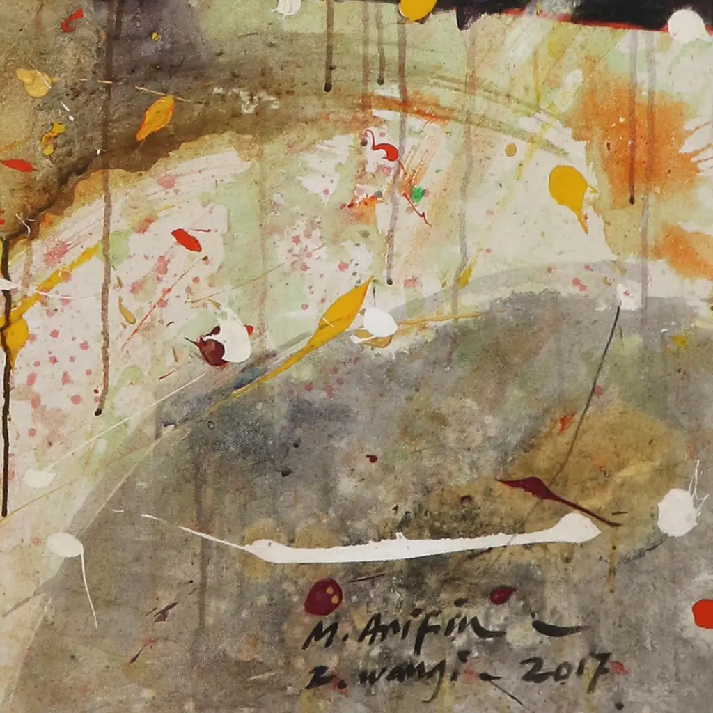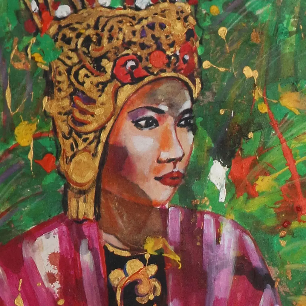 This beautiful original painting is from Balinese artist Mohammad Arifin, who works in acrylics on canvas. The composition depicts a traditional Balinese dancer, costumed and waiting for her turn to perform. According to the artist, the dance style is the gandrung, a traditional dance popular in East Java.