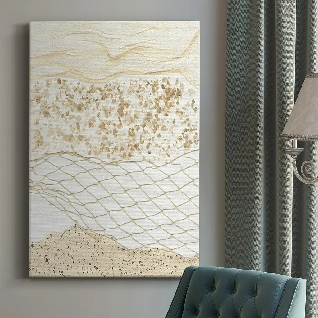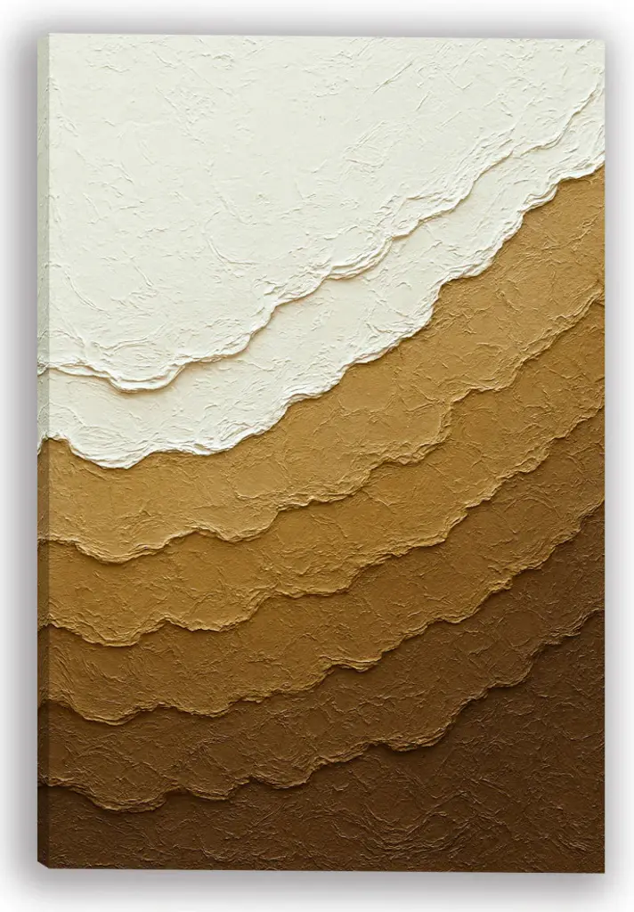 This hand-painted oil painting showcases a layered composition of sculpted ridges in warm earth tones "” from creamy ivory to deep espresso brown. The vertical format enhances the flow of the design, drawing the eye upward and making it a perfect statement piece for modern interiors, tall walls, or narrow spaces.Crafted with palette knife techniques on gallery-wrapped canvas, this textural artwork is stretched over a sturdy wood frame and arrives ready to hang. Whether used in an entryway, hallway, office, or as part of a gallery wall, it adds both dimension and warmth to your space.Features:1, Hand-Painted Oil Painting2, Gallery-Wrapped Canvas with Solid Wood Frame3, Vertical Format "“ Ideal for Tall/Narrow Walls4, Rich Palette of Ivory, Sand, Ochre, and Espresso5, Heavily Textured Surface Using Palette Knife Techniques6, Ready to Hang "“ No Framing RequiredSize: 32x48 inchIncluded: 1 Panel (Single Piece Artwork)Benefits:Natural, grounding tones complement boho, modern, and organic interiorsSculptural surface adds tactile interest and light playOne-of-a-kind artisan piecePerfect for stairways, entryways, vertical accent spaces, and gallery walls