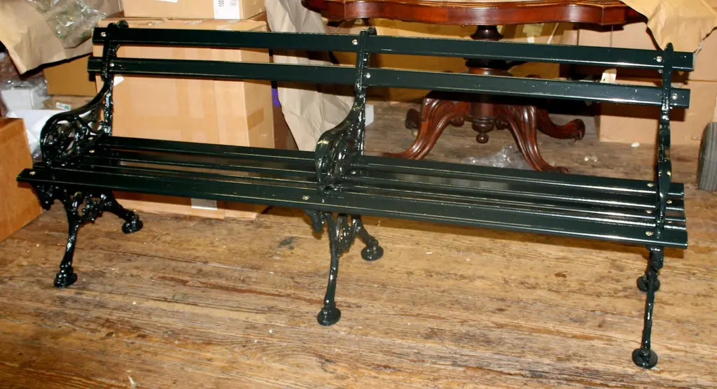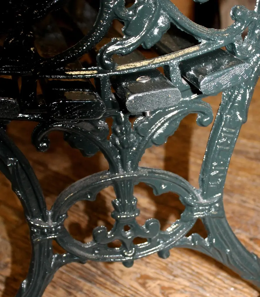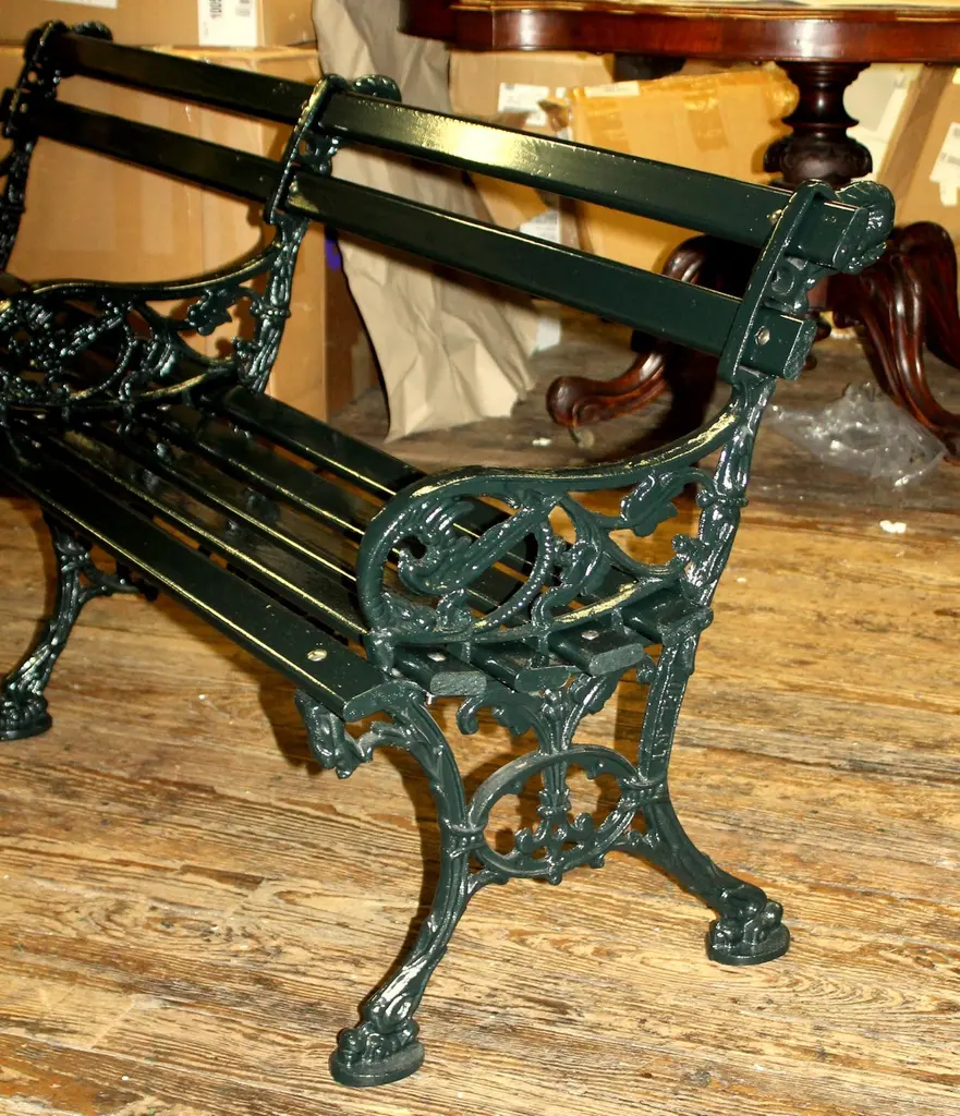 This is the original Charleston Battery Bench with heaviest weight cast iron sides made from the 19th century original pattern and durable South Carolina cypress slats. It is hand painted in our dip tank (not thinly spray-painted) with the best quality exterior alkyd enamel in the traditional Charleston dark green color, 6 feet (72") long.Originally made circa 1880 to beautify Charleston's historic Battery waterfront after the Civil War, the Riley Ironworks were commissioned by the city to create a design reminiscent of features in Charleston. The casting boasts a fox on its arm indicating the hunting and sporting life so prominent in the SC Lowcountry. There is a greyhound which is indicative of the dog races which occurred on the north end of the peninsula; the SC Lowcountry parakeet is displayed and now extinct and there is a "stylized" palmetto frond above the Victorian style legs. Please note the "BIRLANT" name in the casting which denotes an original Charleston Battery Bench. Other sizes available: 30" single bench, 48" two-seat bench and a 96" double size, four-seat bench, priced accordingly on 1st Dibs. Many images of our bench located on Charleston's famous historic Battery (White Point Gardens on the Battery).Made for Outdoor or indoor use and weighs in excess of 110 lbs. and shipped unassembled via UPS and easy to assemble.Replacement slats are always available by special order from our website to replace aging slats. We recommend re-painting our bench in the best quality exterior gloss Industrial enamel every 3-5 years to maintain the longevity of the bench and the slats.No bench of this historical significance or authenticity is made today in the US. Other benches that are similar in size start at $1,500 and up, but as we are the manufacturer, we supply them to the general public at "wholesale".Typically, benches are shipped within 2-3 weeks. PLAN EARLY FOR SEASONAL GIVING!!(Shipping charges shown are per EACH bench).