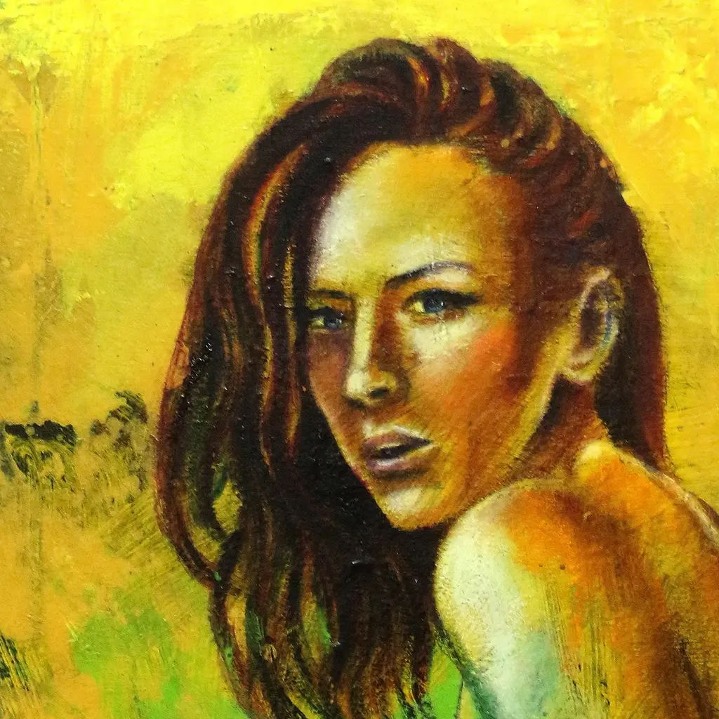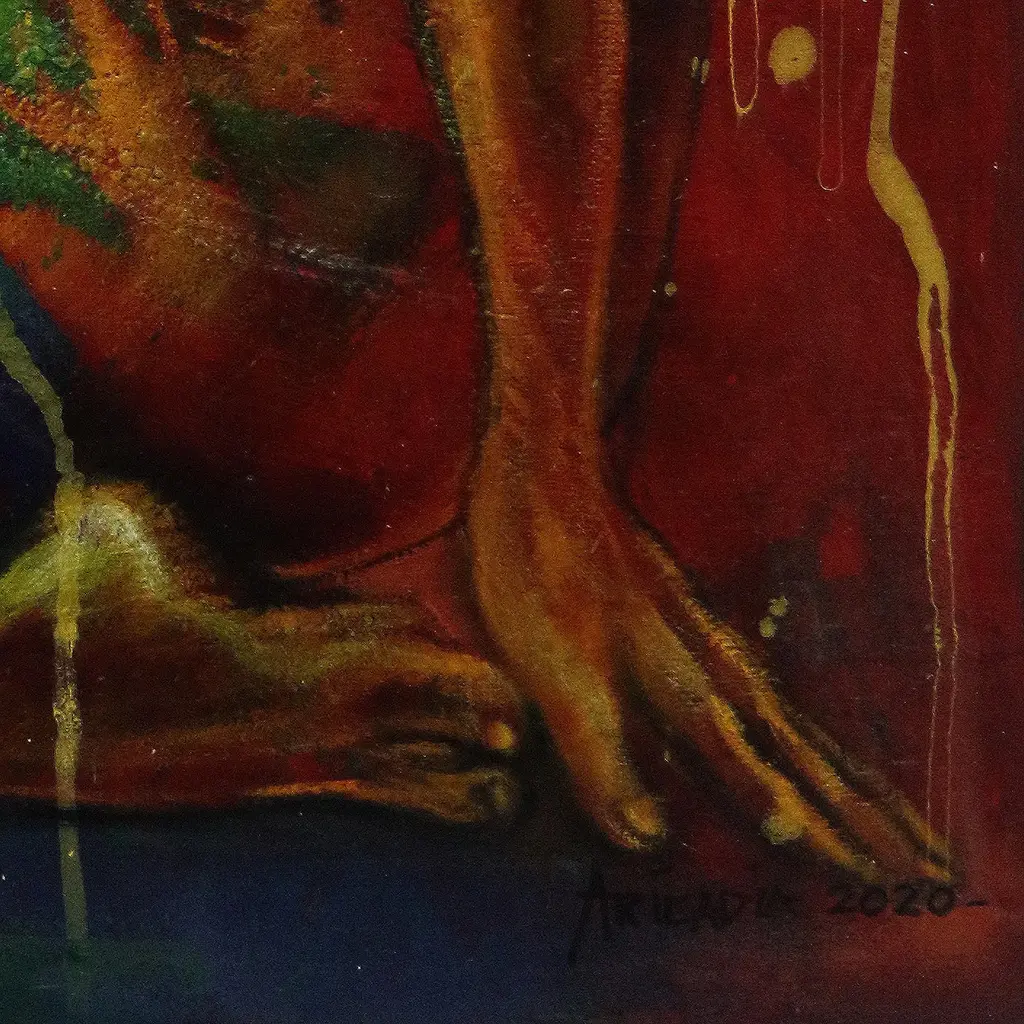 Unafraid, even challenging in her expression, a nude woman gazes at the viewer. Aricadia in Bali paints the original acrylic and oil composition, depicting her in his characteristic bold splashes of color. "She was a delicate woman, even though she follows the emancipation movement," says the artist of his subject.