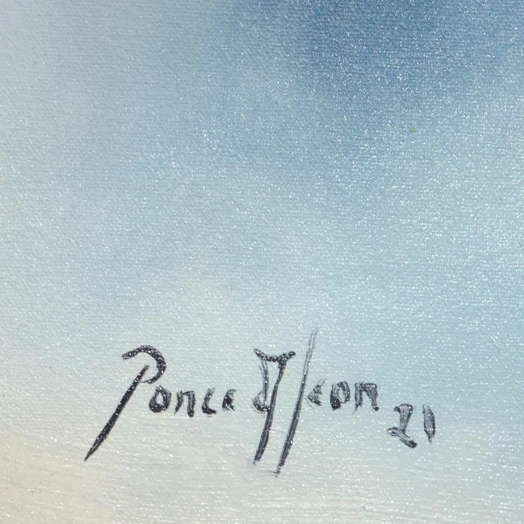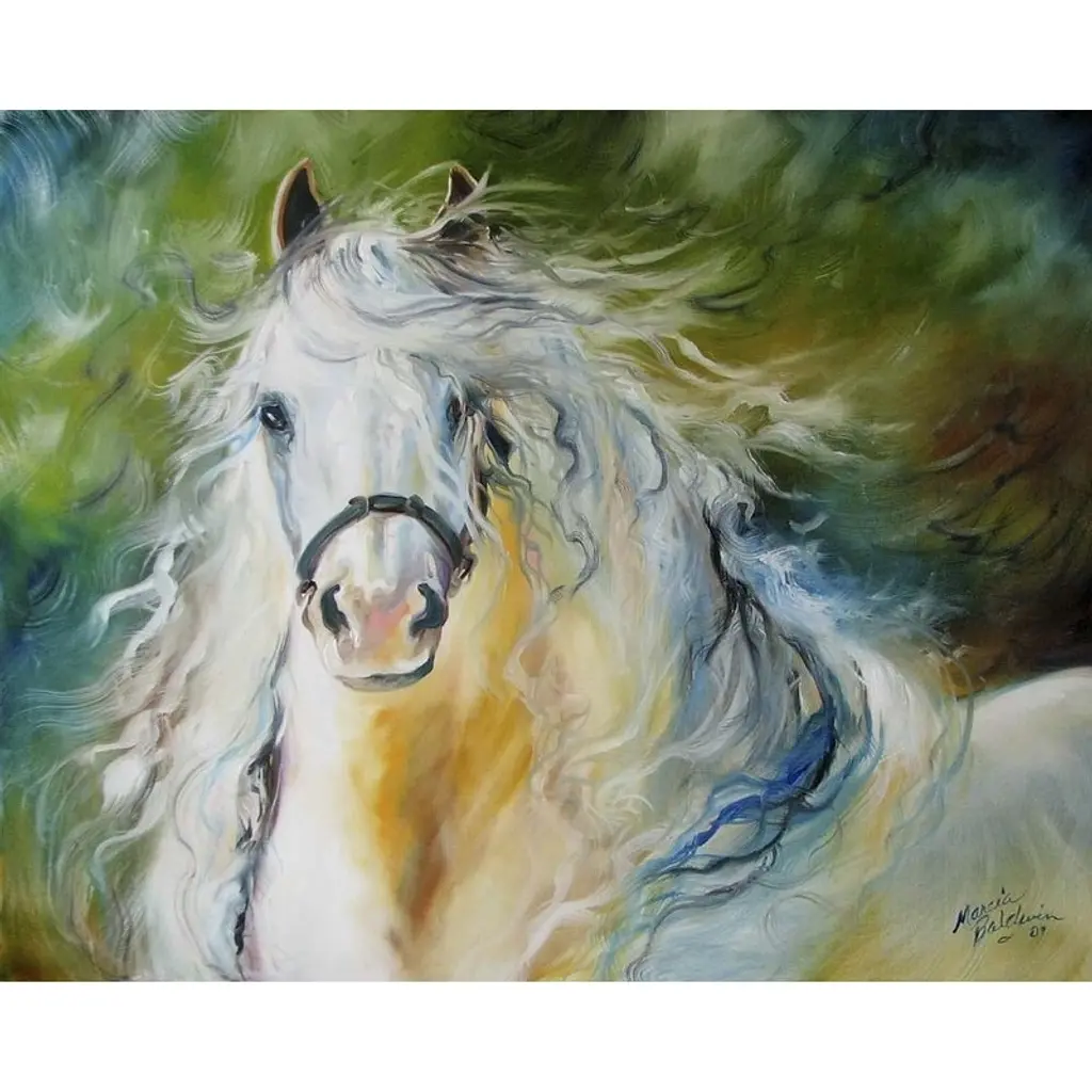 This vibrant, original oil on canvas painting is by self-taught Peruvian artist Jose Ponce de Leon. He renders the image of a horse in motion, so vivid that he appears about to gallop off the canvas. The strong brushwork surrounding the horse creates a feeling of movement.