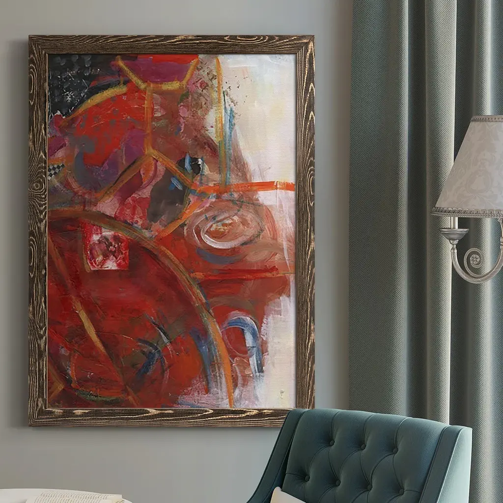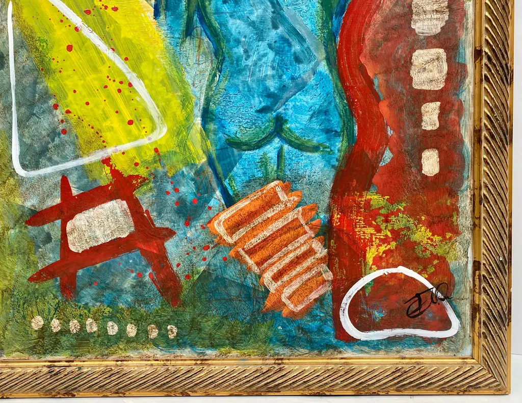 Vibrant original nude painting incorporating both oil and acrylic on canvas. Primary colors and geometric images enhance this modern female study. The simplicity and color palette lends itself to any style of decor. Beautifully textured cross-hatched style gold frame. Signed on the lower right by artist Ender Tasci.