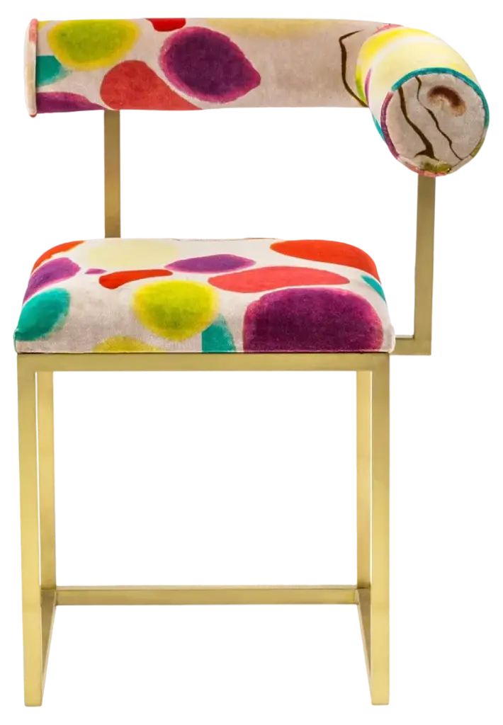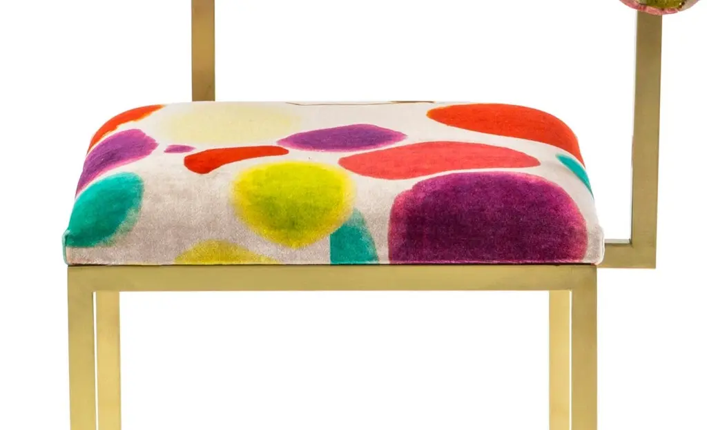Original Printed Velvet Awaiting L Stool by Secondome EdizioniLimited Edition Of 9 pieces + 3 A.P.Designer: Coralla Maiuri + Giorgia Zanellato.Dimensions: D 48 x W 48 x H 69 cm.Materials: Brass and original printed velvet.Collection / Production: Secondome. This piece can be customized. Available colors: any kind of monocromatic velvet color. Please contact us. The project’s name speaks to the feeling of anticipation and excitement that precedes an encounter and it’s deeply linked to the purpose of the objects: benches, a vanity table and a room divider. The collaboration started as a game. The artist, Coralla Maiuri, inspired by the pictures of her porcelain pieces, designs a collection of bold colored velvet cloth. Her will to shape them in to something equally bold yet refined, brings her, trough Claudia Pignatale, together with the designer Giorgia Zanellato. Awaiting is a feminine and sensual collection that mixes a taste of classic and contemporary in pieces of furniture realized in golden brass and original printed velvet.THE GALLERYSecondome is a Design Gallery focused on contemporary designers and innovative projects worldwide.Founded by Claudia Pignatale in 2006, Secondome produces its own collection of Furniture and objects working to launch experimental designers, artisans and master craftsmen. Its mission lies in highlighting both the high quality manufacture of the Made in Italy brand and the originality of products, emphasizing the tradition of Italian craftsmanship whilst breaking the mold of lifeless objets d’art.The artisanal nature of Secondome’s production makes each piece individual and highly personalized.