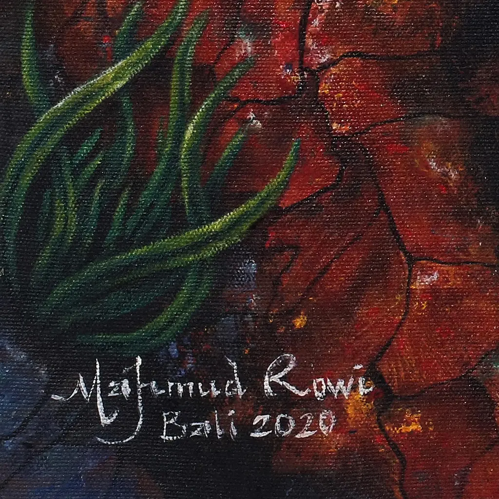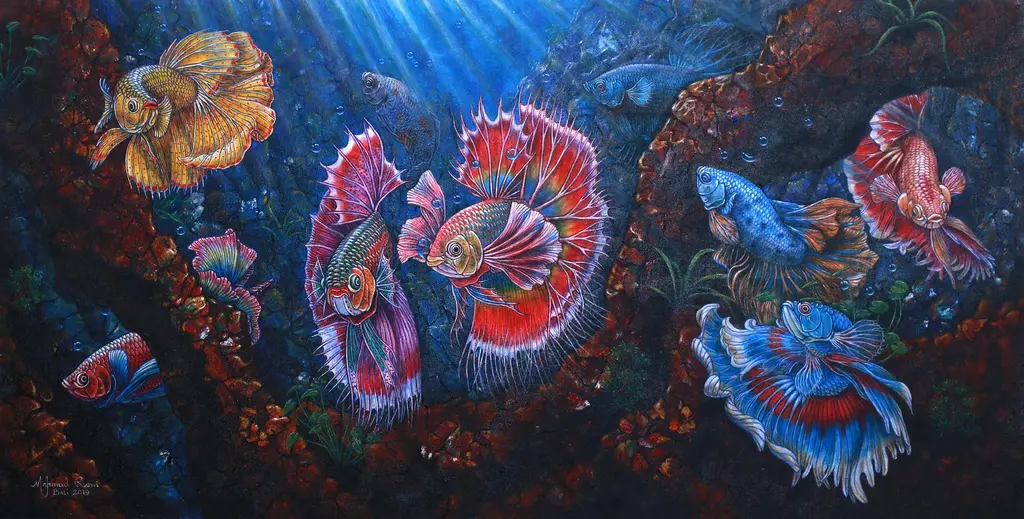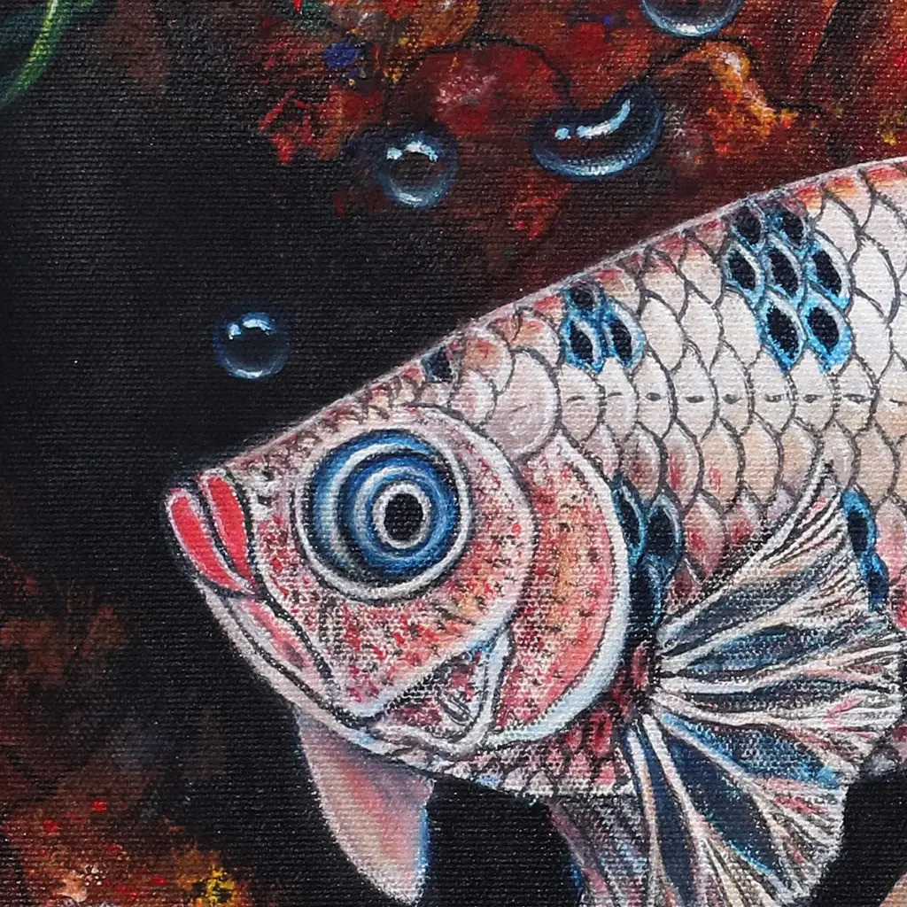 Gliding smoothly through the water, a black and white betta leaves the refuge of its cave. It tilts an eye toward the viewer, seeming to gaze back at the person observing this painting. "A white betta fish with black freckles looks so strong," artist Mahmud says. "The fin looks like it's showing readiness in case of an enemy's attack."