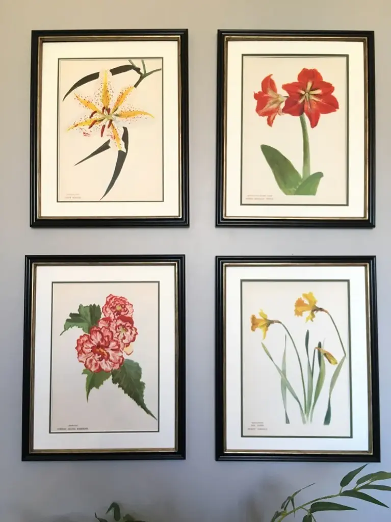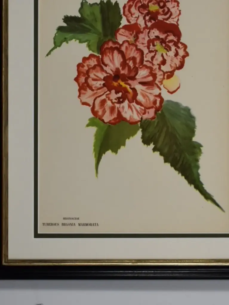 Decorate your home with this gorgeous original vintage French Botanical Begonia print that looks like a watercolor painting! This beautifully detailed and well preserved original book illustration print is not a reproduction. It was drawn in Paris by a renowned English botanical illustrator in 1946. Add beauty, interest and conversation to any room with authentic vintage framed print. Look at the close-up pictures to see the great detail and depth of color in the variegated reds, yellows, and reds of this modern like Begonia flower print. A gallery wall of these life-like flowers will be stunning in any room! See our other French Botanical Flower prints by Timeless Walls for a set of two, four, or six to complement your bedroom, dining room or living room. This timeless classic botanical print is very competitively priced considering each print has double acid free mats, UV protection glass and a solid wood black frame with inner antique gold finish; all of which are conservation quality products. Condition: Good, age toning in background and slight random spottingOverall Features:Original Vintage French Botanical Flower Print Not a reproduction Solid one inch black frame with inner antique gold finishDouble acid free mat: antique white top with dark green under matUV protection glassOverall dimensions: 14.75"W x 18.25"H Ready to Hang Brief History on BackWHAT SETS TIMELESS WALLS ORIGINAL VINTAGE FRAMED PRINTS APART: This is an Original framed print(s) from the time period stated. Not a Reproduction. This original framed print may show classic hallmarks of being vintage with age toning, random spotting, and creasing, all which add character and beauty to this Timeless Walls framed print! To preserve this original vintage print for generations to come, only conservation quality products are used. We have done all the work for you! We found something old, preserved and enhanced it with matting and framing, and are giving you the relevant known history on the back of each framed print! A Timeless Walls framed print will add beauty, interest and value and may evoke memories, conversations and would make wonderful thoughtful