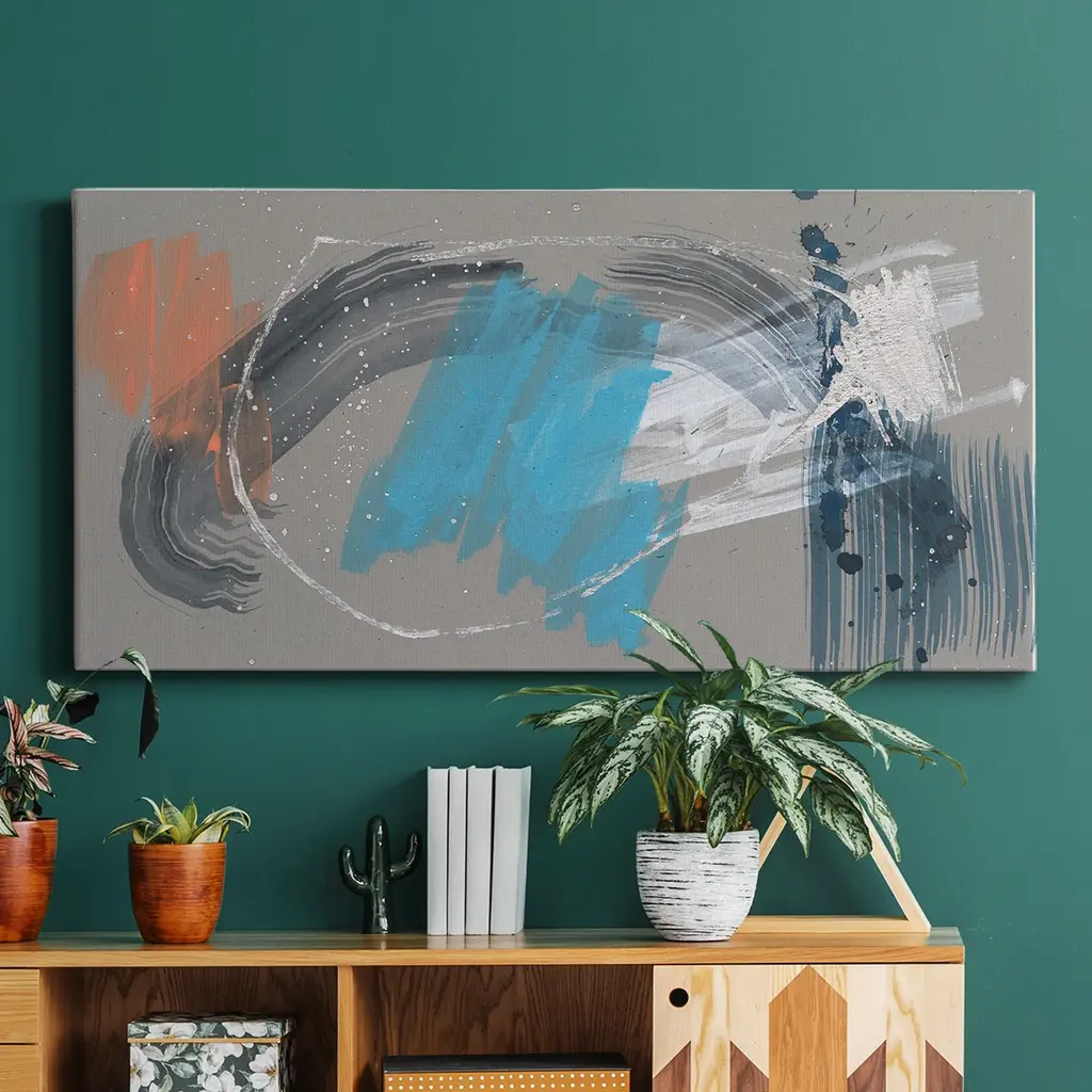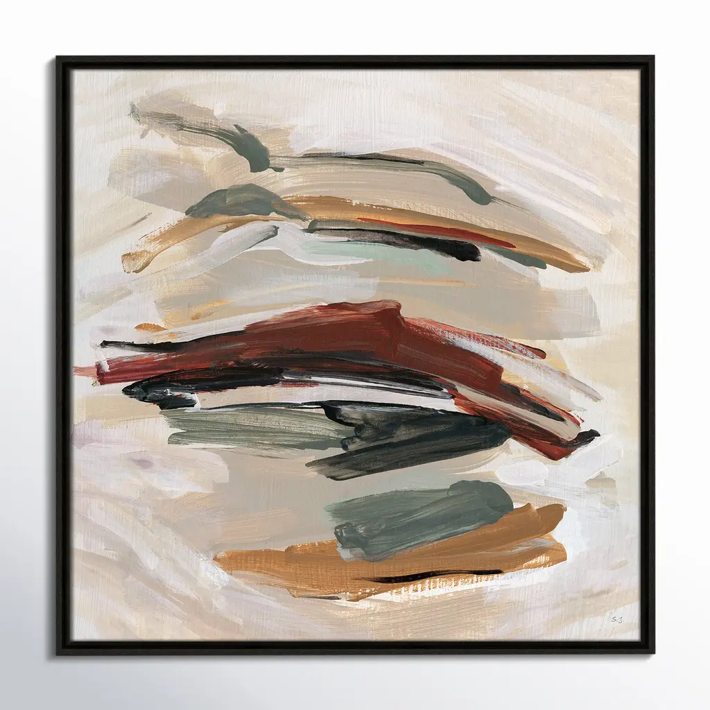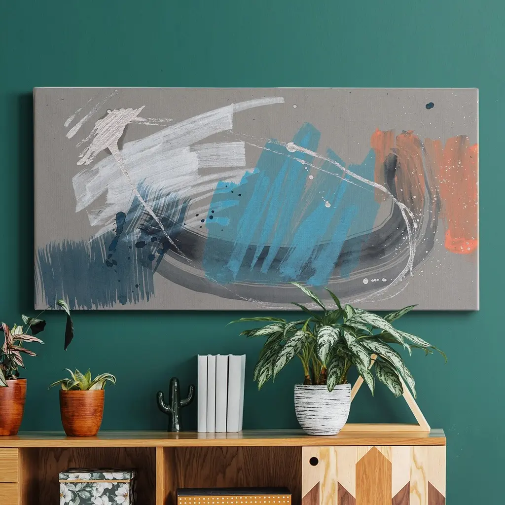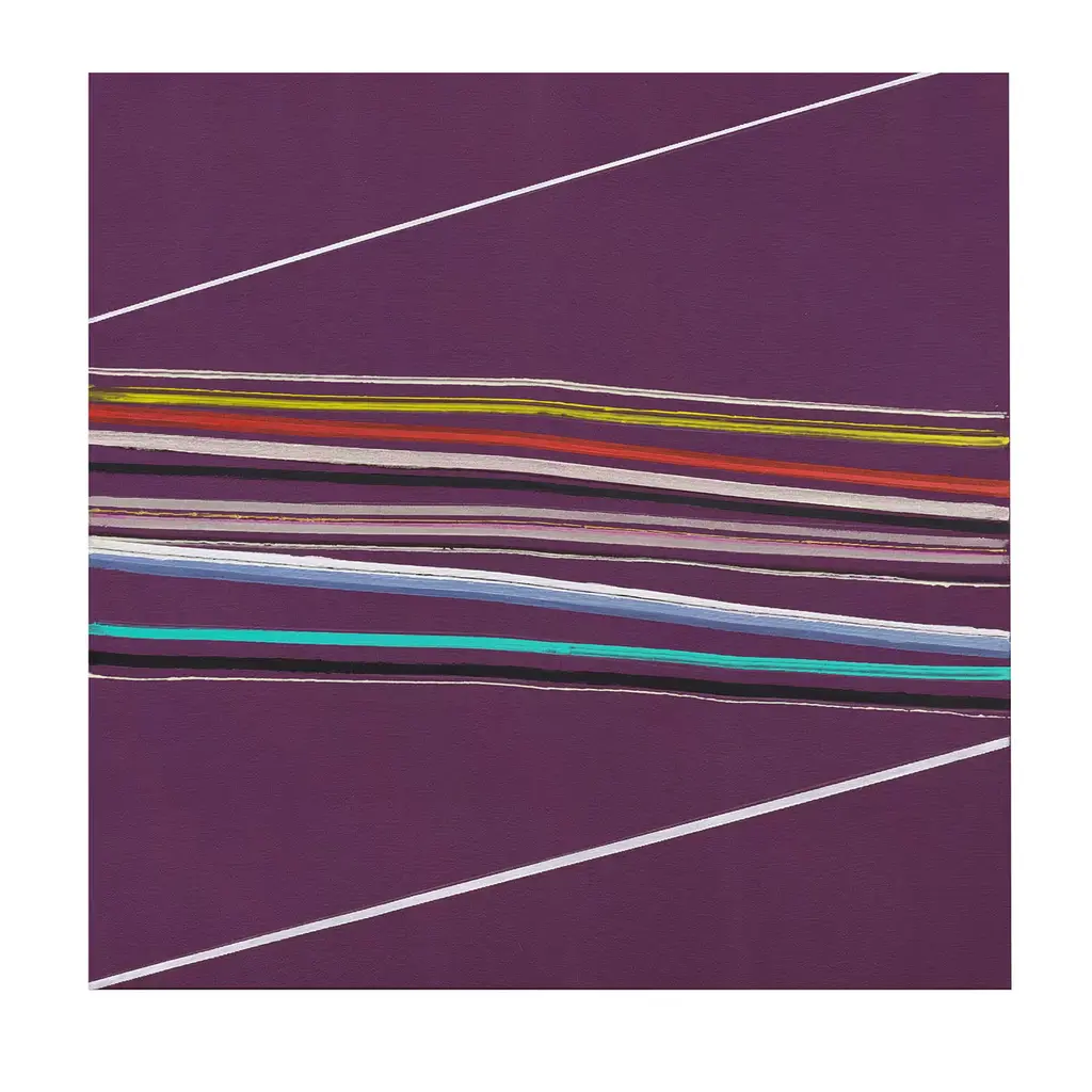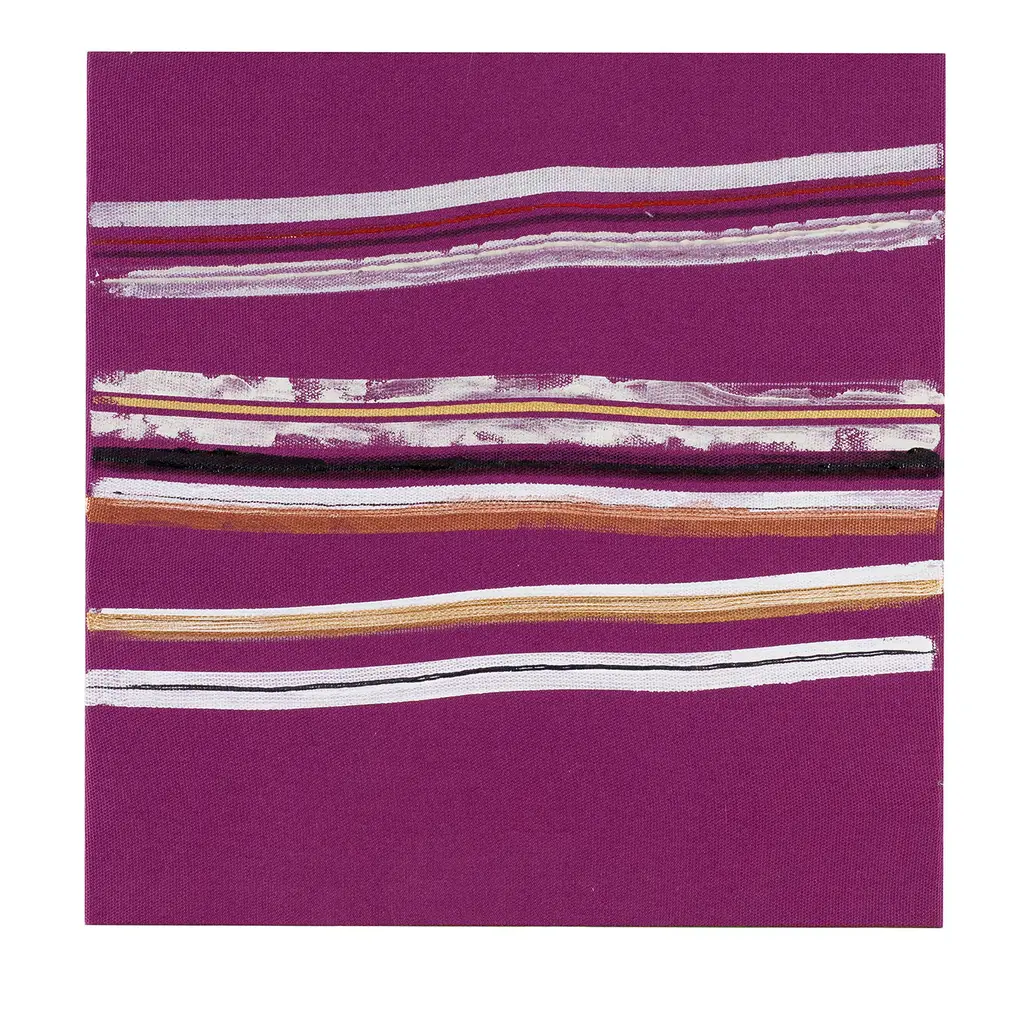 Polychrome lines seemingly tracing the horizon's profiles immediately reveal the minimalist sophistication exuded by this one-off painting. An invitation to embrace infinity and refuse a merely repetitive impact, the painting boasts a captivating yet reassuring palette, where tones of beige, white, and blue emerge from a warm deep-red background. When in the dark, the piece reveals its precious luminescent effect.