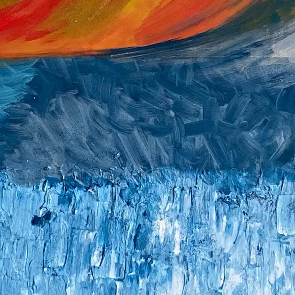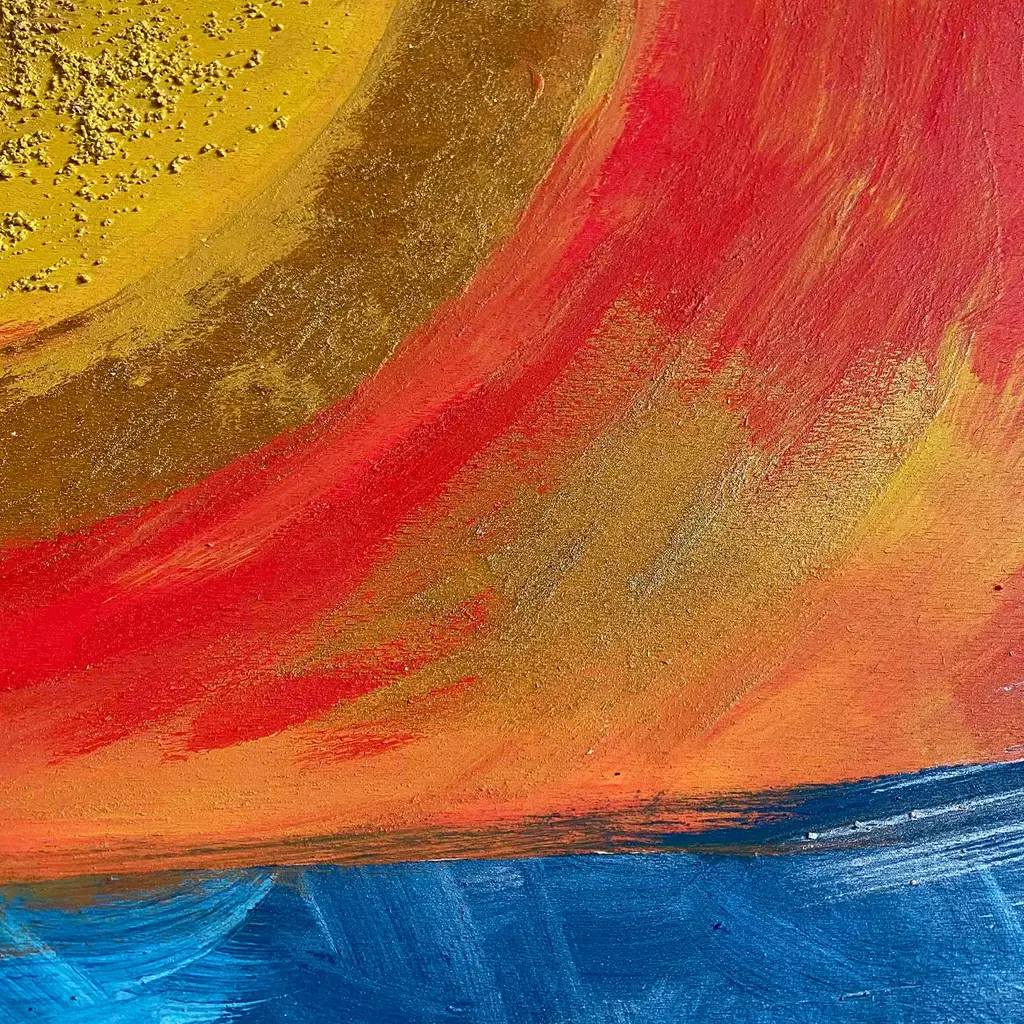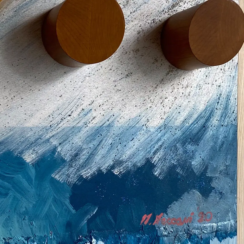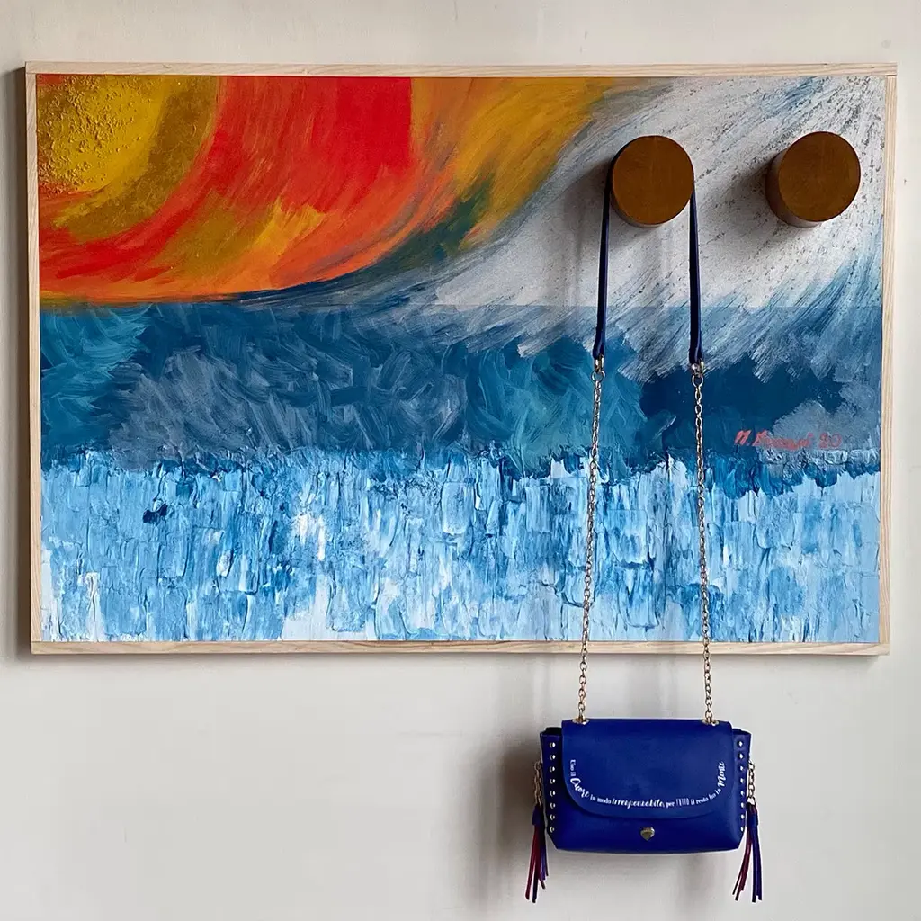 A singular and iconic combination of art and design, this stupendous piece by Mascia Meccani is a wooden decorative panel enriched with two wall hangers. Showcasing a mesmerizing and vivacious juxtaposition of warm and cold tones, the panel is painted by hand adding stucco and sand to the surface. The two cylindrical wall hangers are crafted of cherry wood. This artwork is unique but can be customized in size, with possible variations due to its handcrafted nature.