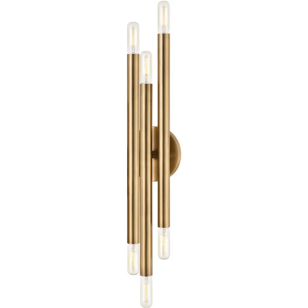 Streamlined, cylindrical metal shades are mounted at varying heights and depths from a circular backplate for a sleek and minimalist take on a mid-century modern silhouette. The variety of finishes (Patina Brass, Bronze and Polished Nickel) complement any interior, with the Polished Nickel working particularly well in a powder room or bath. This versatile six-light wall sconce can be styled horizontally or vertically.