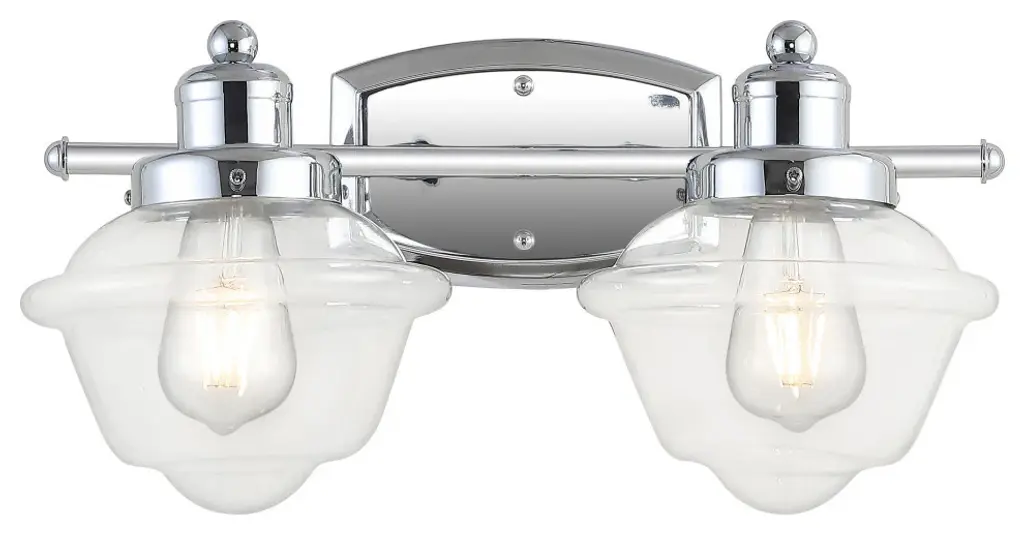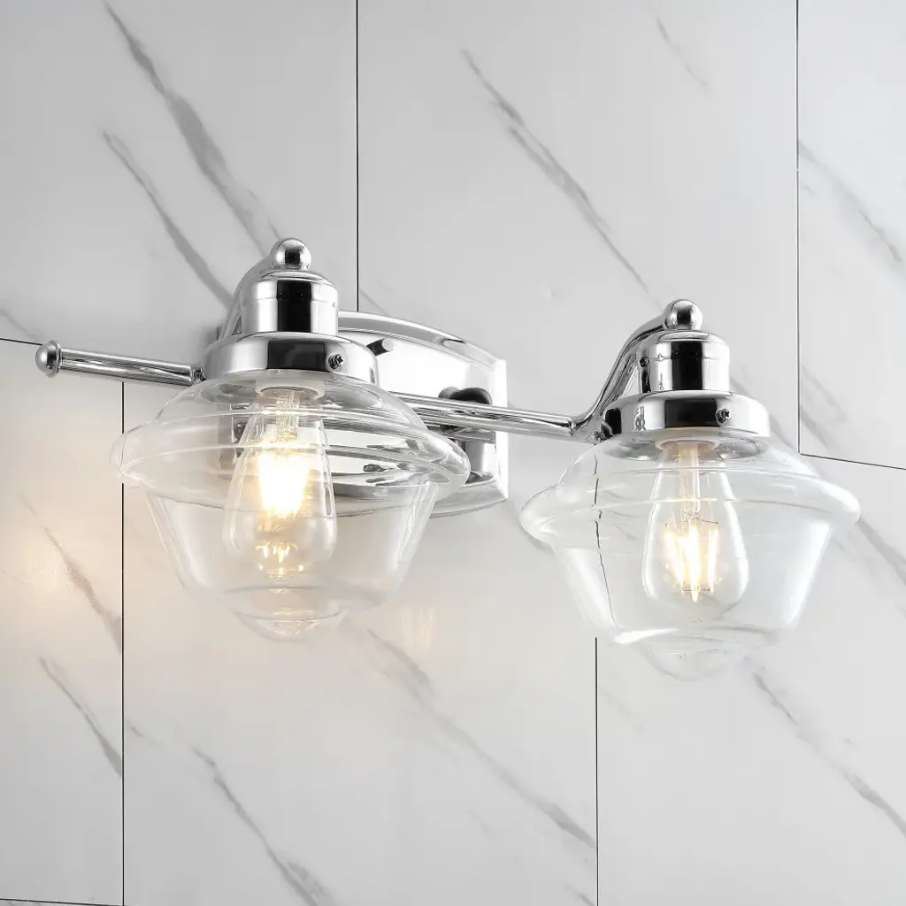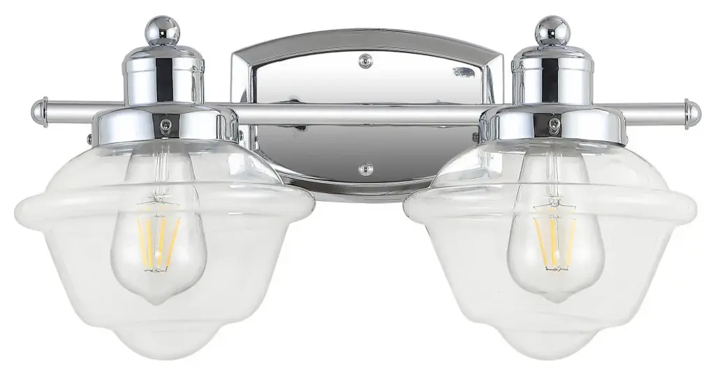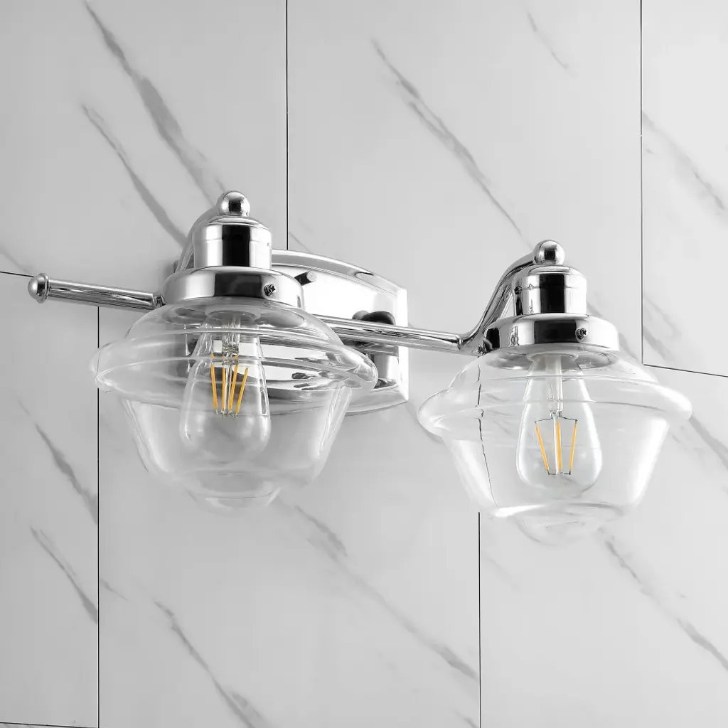 Bring on the mid-century flair with our sparkling chrome wall light. Two Edison-style LED bulbs cast a warm glow. The schoolhouse style clear glass globe adds vintage style to your bath vanity, kitchen, hallway or entry. -Replace outdated wall sconces or vanity lights with this retro-inspired classic for an instant midcentury style makeover-Our light fixtures work with LED-compatible dimmers; professional installation is recommended.-Takes 2 bulbs and compatible with any 9W LED or 40W TYPE "A"or 13W CFL-Eco-Friendly 4W LED Bulb included-As this fixture must be hardwired, we recommend a professional electrician manage installationColor: Chrome with clear shade-Body Material: Iron/Glass-Includes: One (1) lampAssembly RequiredLamp: 8.5 inches high x 16.75 inches wide x 9.5 inches deepAbout us: You see a lamp.We see a decorative work of art.A perfectly curved shade casts a dramatic shadow on a floor. Compatible with LED lightbulbs: as easy on the environment as they are on the eyes. The JONATHAN Y Lighting collection considers every detail from impeccably sourced materials to designer styling. And our prices are so attractive, we�ve transformed a functional necessity into a fashion accessory.JONATHAN Y Lighting - a fashion revolution in home decor.