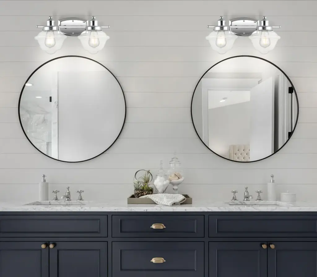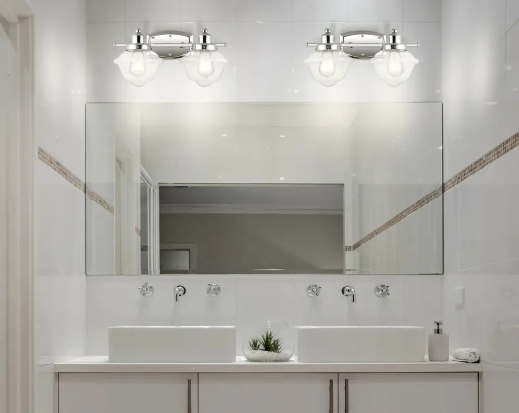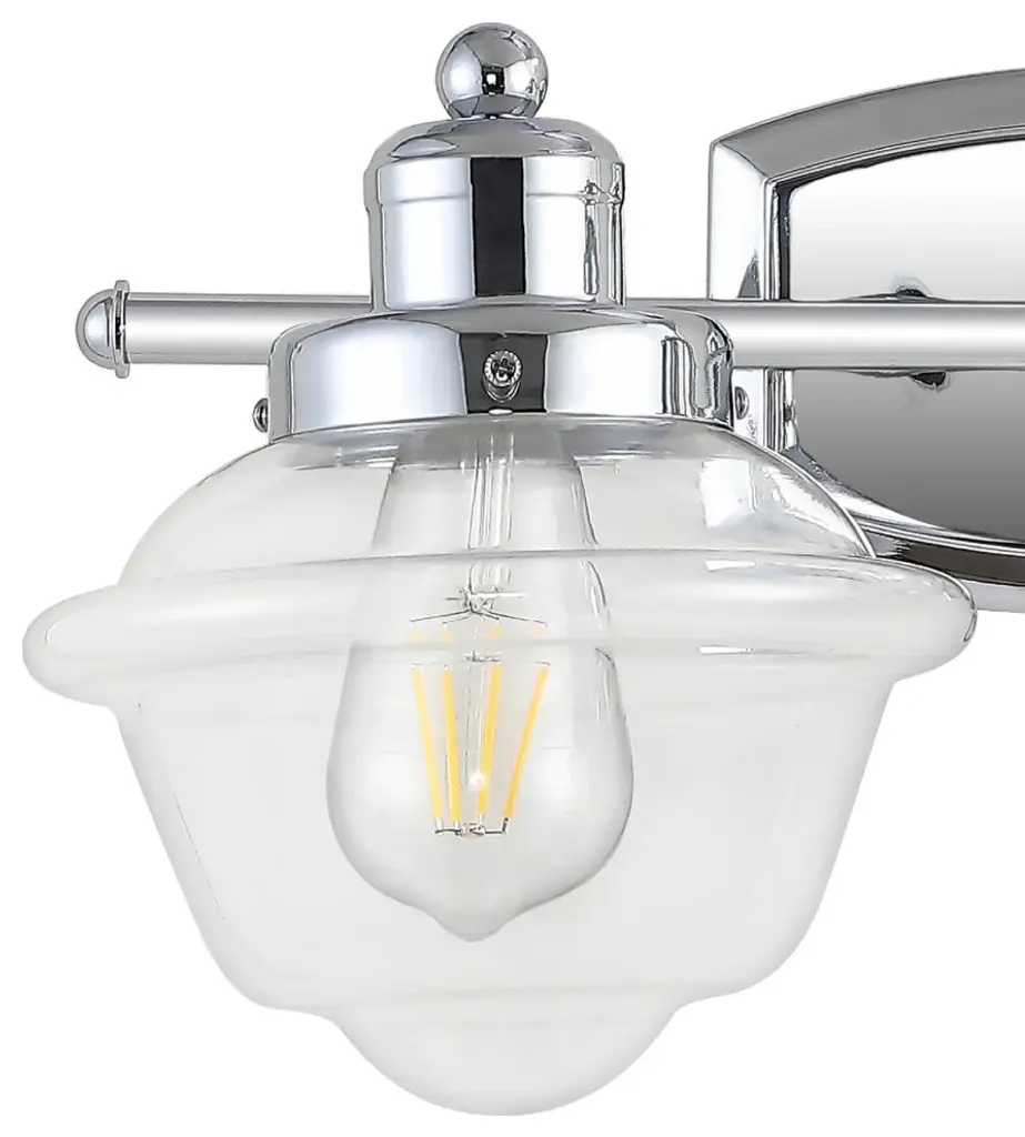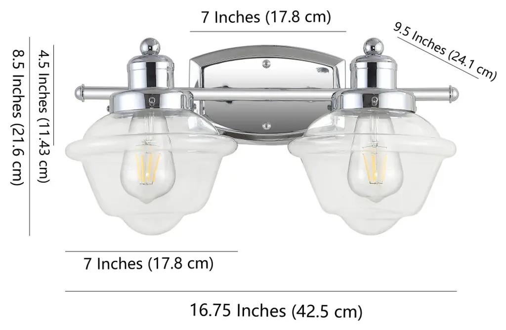 Bring on the mid-century flair with our sparkling chrome wall light. Two Edison-style LED bulbs cast a warm glow. The schoolhouse style clear glass globe adds vintage style to your bath vanity, kitchen, hallway or entry. -Replace outdated wall sconces or vanity lights with this retro-inspired classic for an instant midcentury style makeover-Our light fixtures work with LED-compatible dimmers; professional installation is recommended.-Takes 2 bulbs and compatible with any 9W LED or 40W TYPE "A"or 13W CFL-Eco-Friendly 4W LED Bulb included-As this fixture must be hardwired, we recommend a professional electrician manage installationColor: Chrome with clear shade-Body Material: Iron/Glass-Includes: One (1) lampAssembly RequiredLamp: 8.5 inches high x 16.75 inches wide x 9.5 inches deepAbout us: You see a lamp.We see a decorative work of art.A perfectly curved shade casts a dramatic shadow on a floor. Compatible with LED lightbulbs: as easy on the environment as they are on the eyes. The JONATHAN Y Lighting collection considers every detail from impeccably sourced materials to designer styling. And our prices are so attractive, we�ve transformed a functional necessity into a fashion accessory.JONATHAN Y Lighting - a fashion revolution in home decor.
