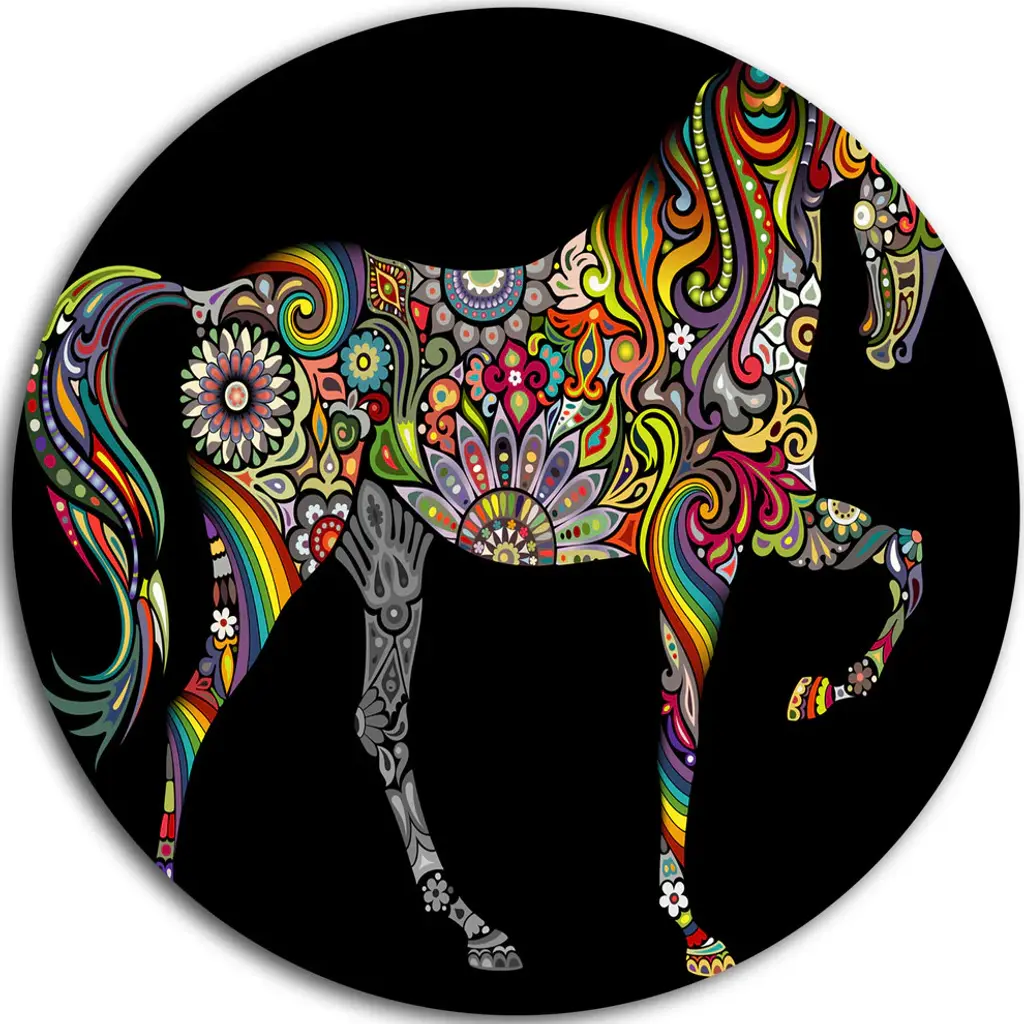 Bring Contemporary Abstraction to your home with this large Circle Metal wall art. This Ornamental Bull Metal Artwork makes it the focal point of any room or office. - White Gloss Coating ensures colors are extra vibrant with light reflection.- Aluminum grade Sheet Metal with 1 inch mounting frame on the back giving the illusion that the artwork is floating on the wall..- Mounting Brackets are included along with instructions.- High Quality Digital images are created directly into a glossy aluminum panel producing a stunning and captivating print into the glossy finish of the metal.- Water, Fire and Scratch resistant HD Aluminum panels.- Looks better than any photo paper and guaranteed to last at least 20 years- Easy to clean with a microfiber cloth. Colors are far superior to regular Canvas Art. - Easy to Hang