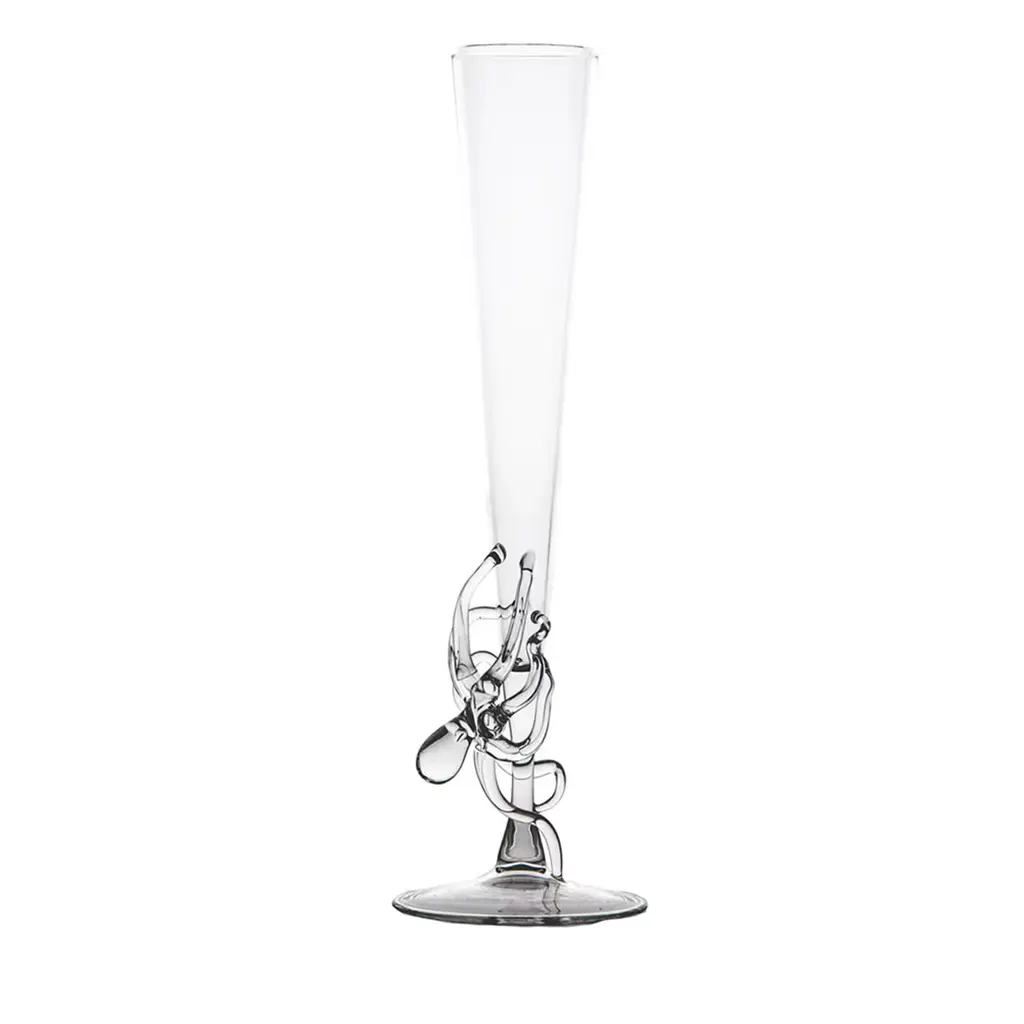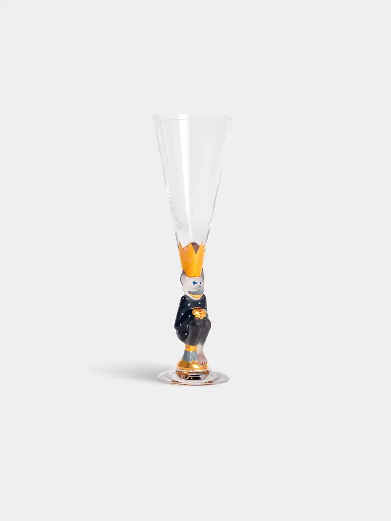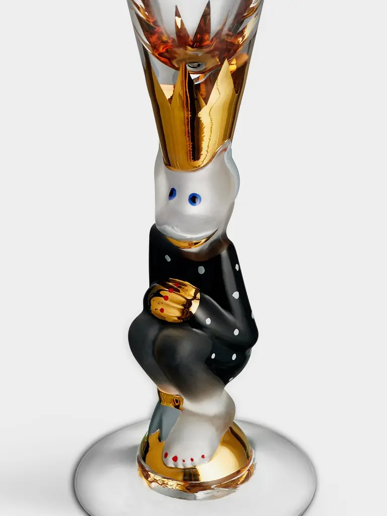 After Gunnar Cyrén's passing in 2013, his sons found several sketches of champagne glasses inspired by the snaps glasses in the Nobel collection from Orrefors. The selected design has resulted in luxurious stemware glasses in different color variations. The Sparkling Devil in dark gray, which holds 6.5 oz, is mouth-blown in Sweden with hand-painted details in real 21 karat gold.