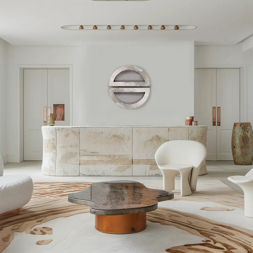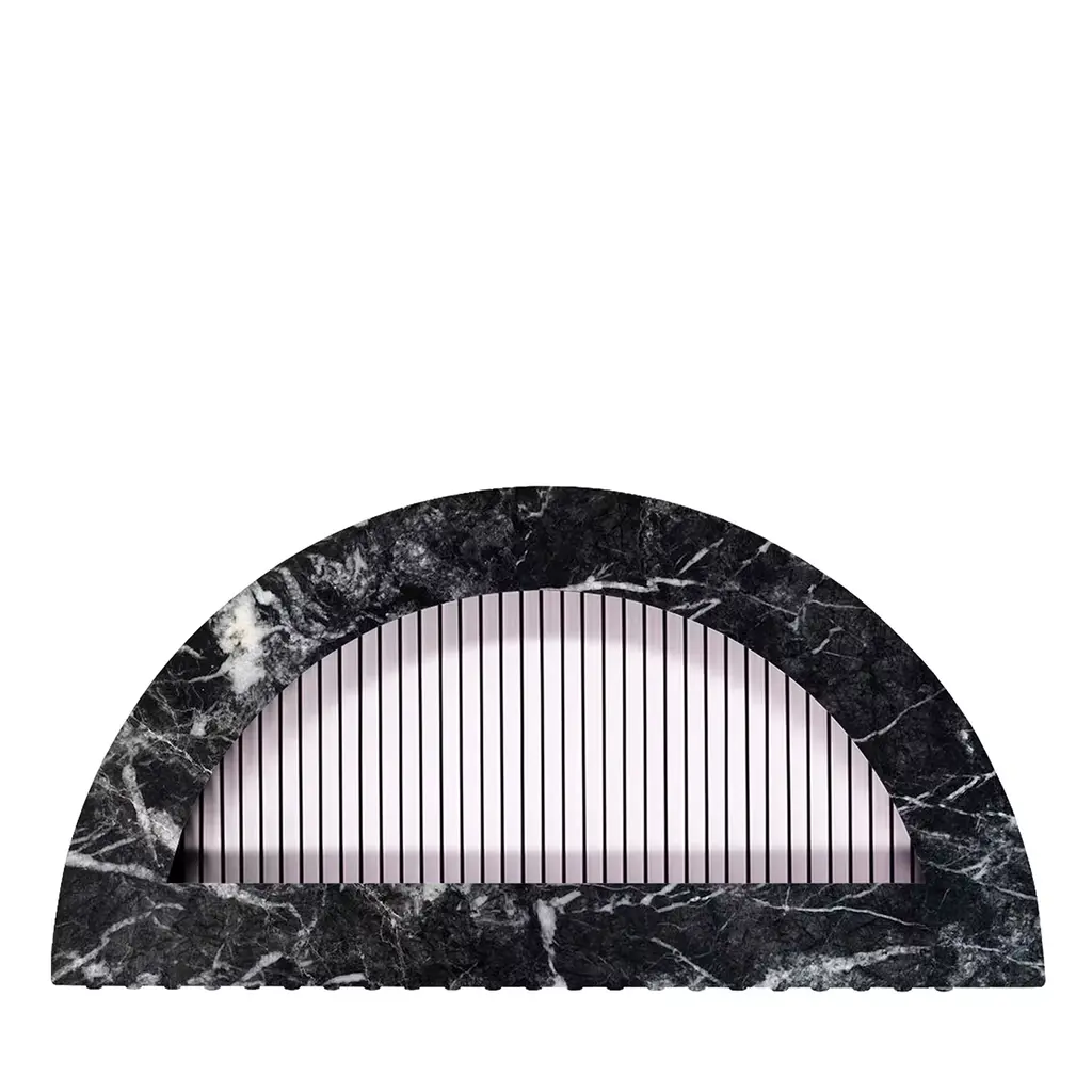 Half circle is part of the ORU Collection, an innovative project of territory, sustainability, craftsmanship and technology. The encounter between PVC, iron and marble form a family of decorative wall elements, between art and design. The essential becomes luxury. The perception of PVC changes, marble welcomes it with enthusiasm, iron holds them together. Four shapes, infinite combinations, the frontier of the usual is crossed, movements shine with unusual embraces between materials.