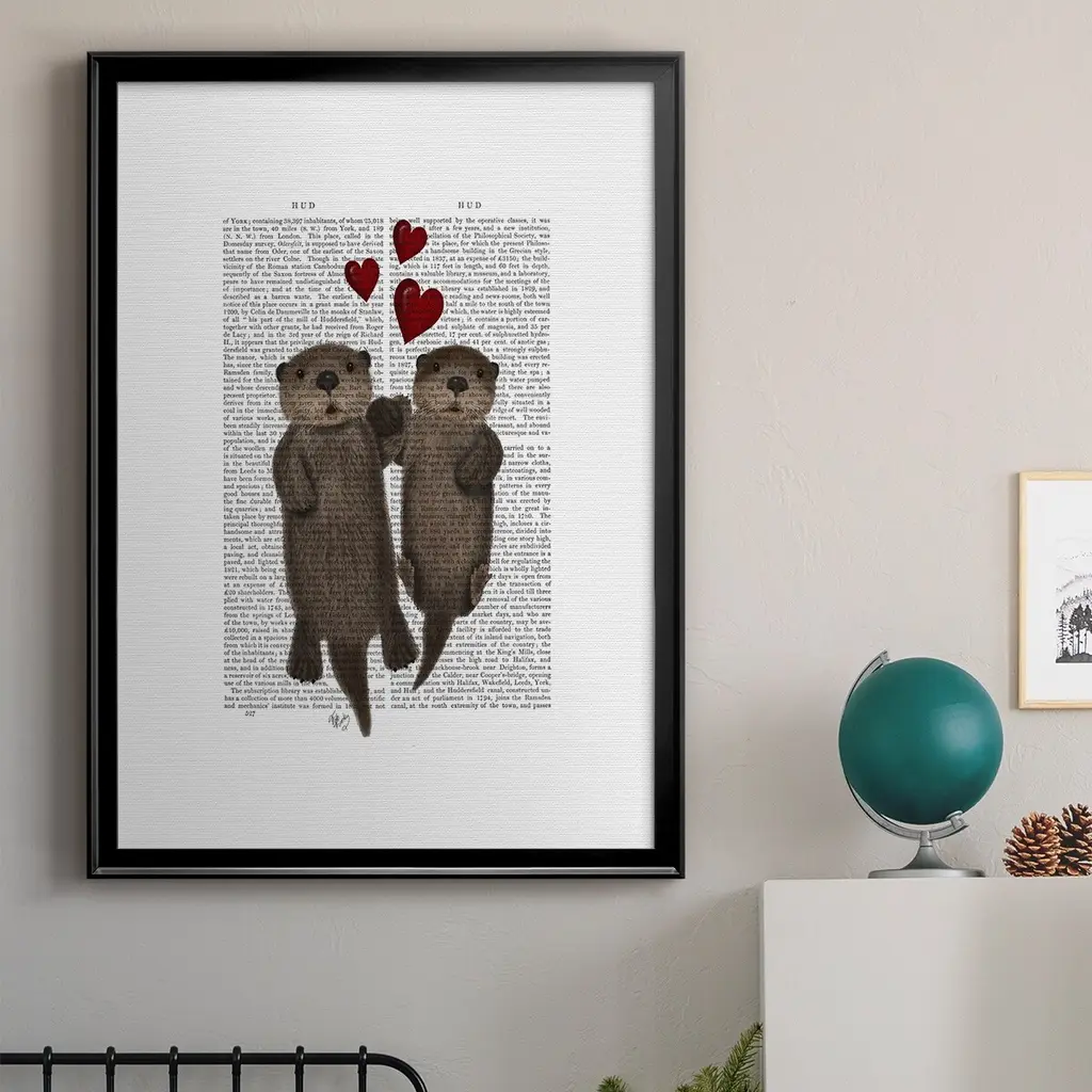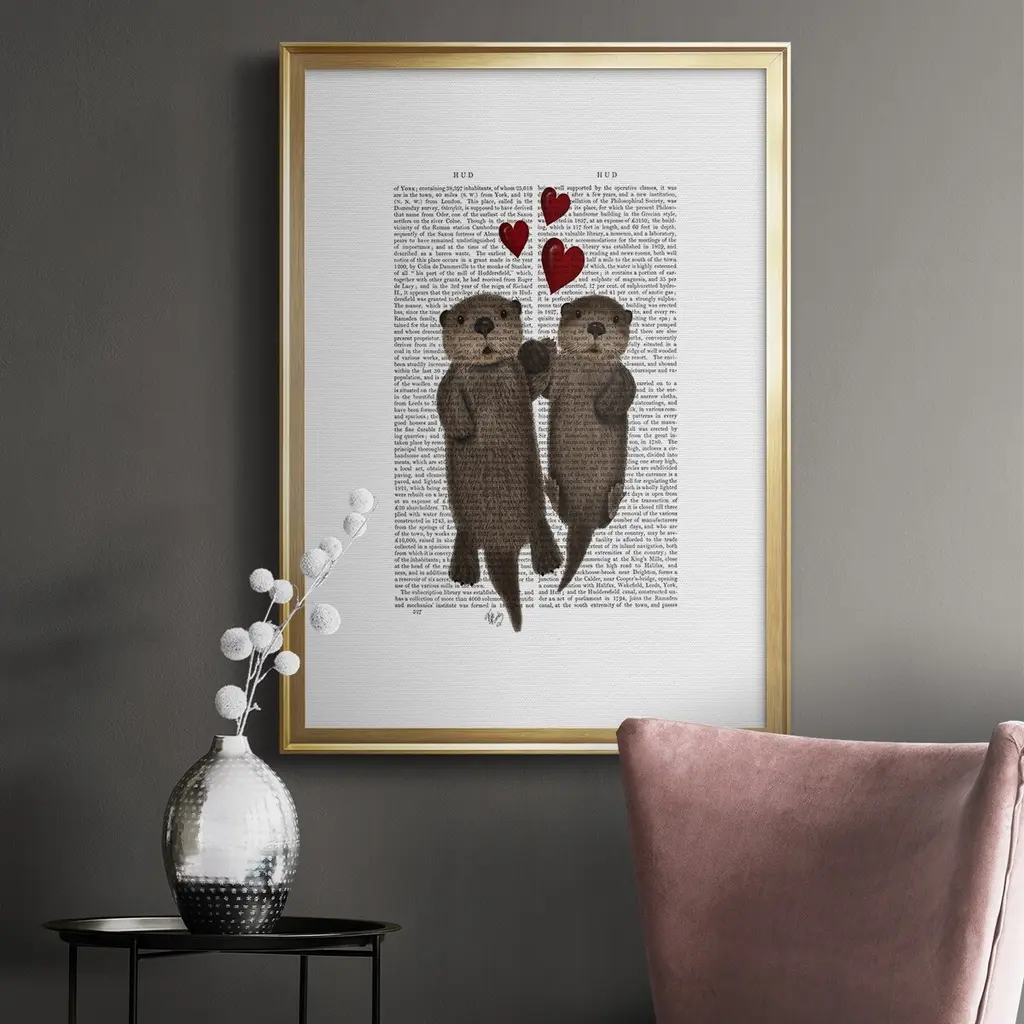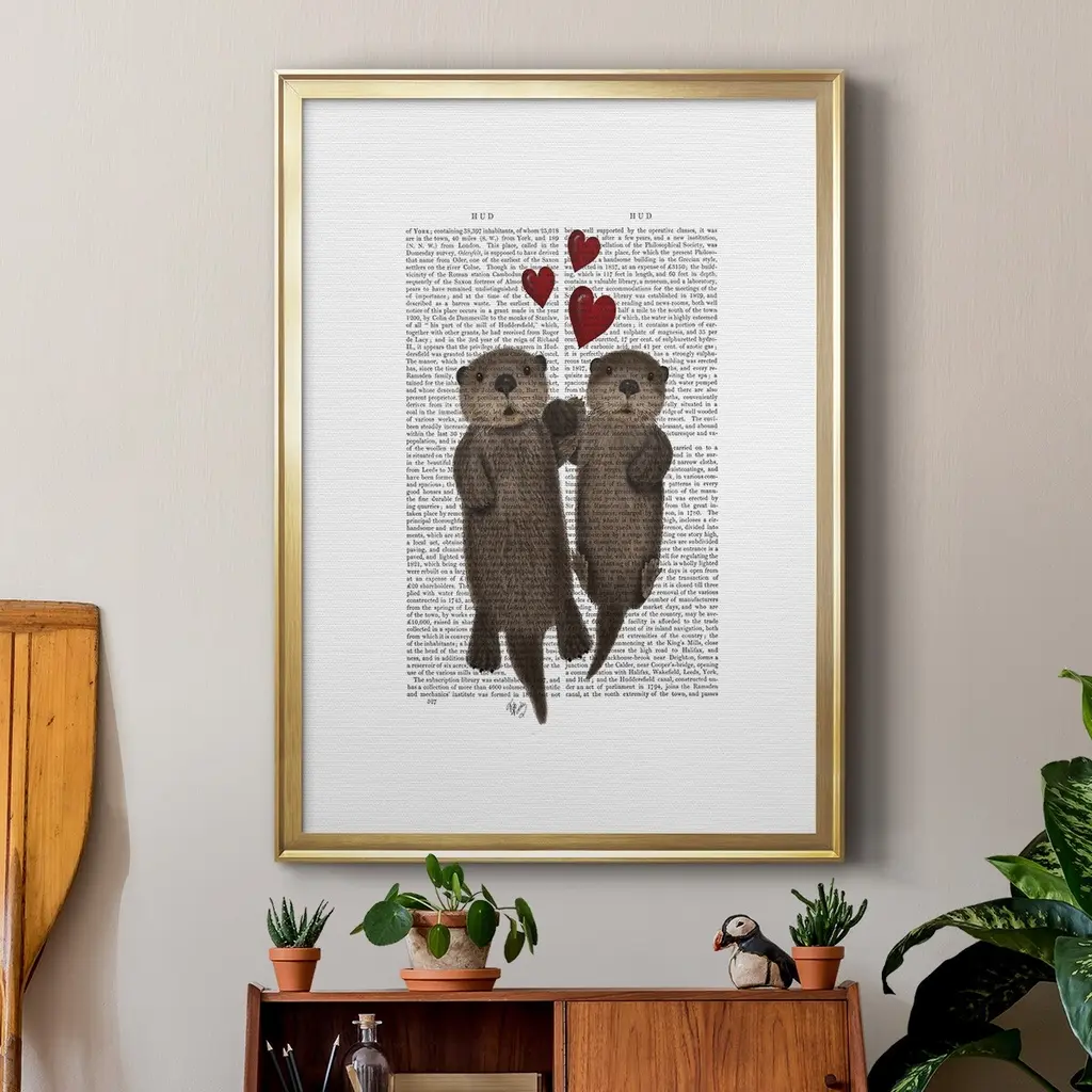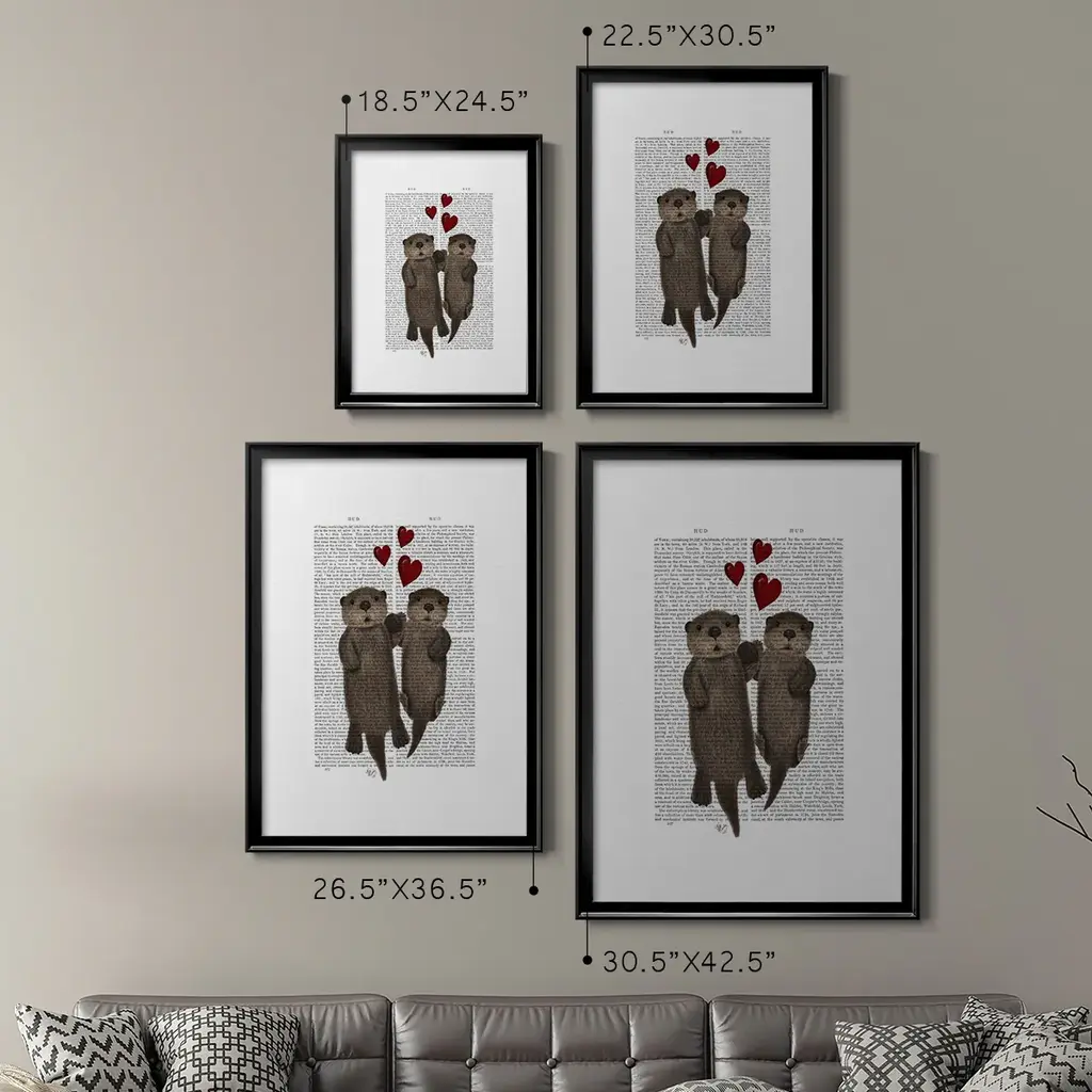 Otters Holding Hands Premium Framed Print - Ready to Hang A Premium Framed Print created to last. Framed in distressed wood and available in an array of sizes and colors Featuring a beveled a solid wood stretcher bar, each piece comes ready to hand 4 SIZES AVAILABLE 30.5''X42.5'' - Overall Size 26.5'X36.5'' - Overall Size 22.5''x30.5'' - Overall Size 18.5''x24.5'' - Overall Size Each piece is made to order. Each piece comes with hanging hardware. Made in the USA Ready to Hang