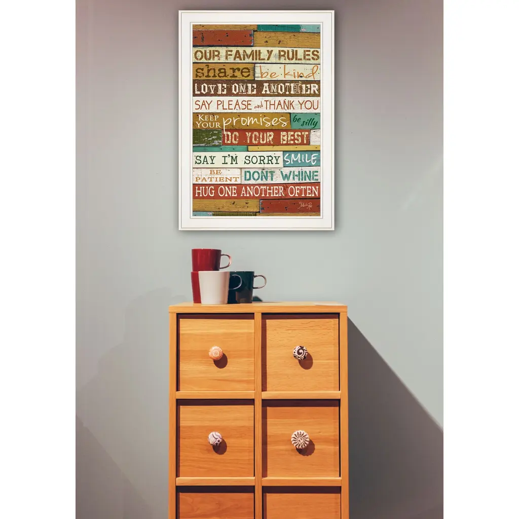Add an air of fashion to your room and rejuvenate the space with this our family rules 6 white framed print wall art. This print is a visual artistic expression that allows you to decorate your space in style. Reproduced for you on paper, this hanging decorative accent will be a trendy and fashionable way to dress your walls. Hang on your wall to add some up to date fashion and decoration. Utilize this opportunity to create a focal point in the room with this fabulous wall decor option. 21" H x 15" W x 1" D