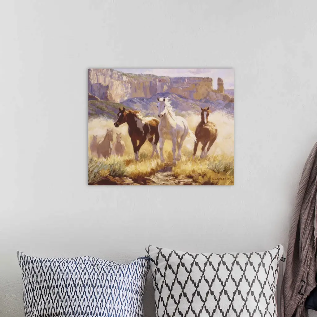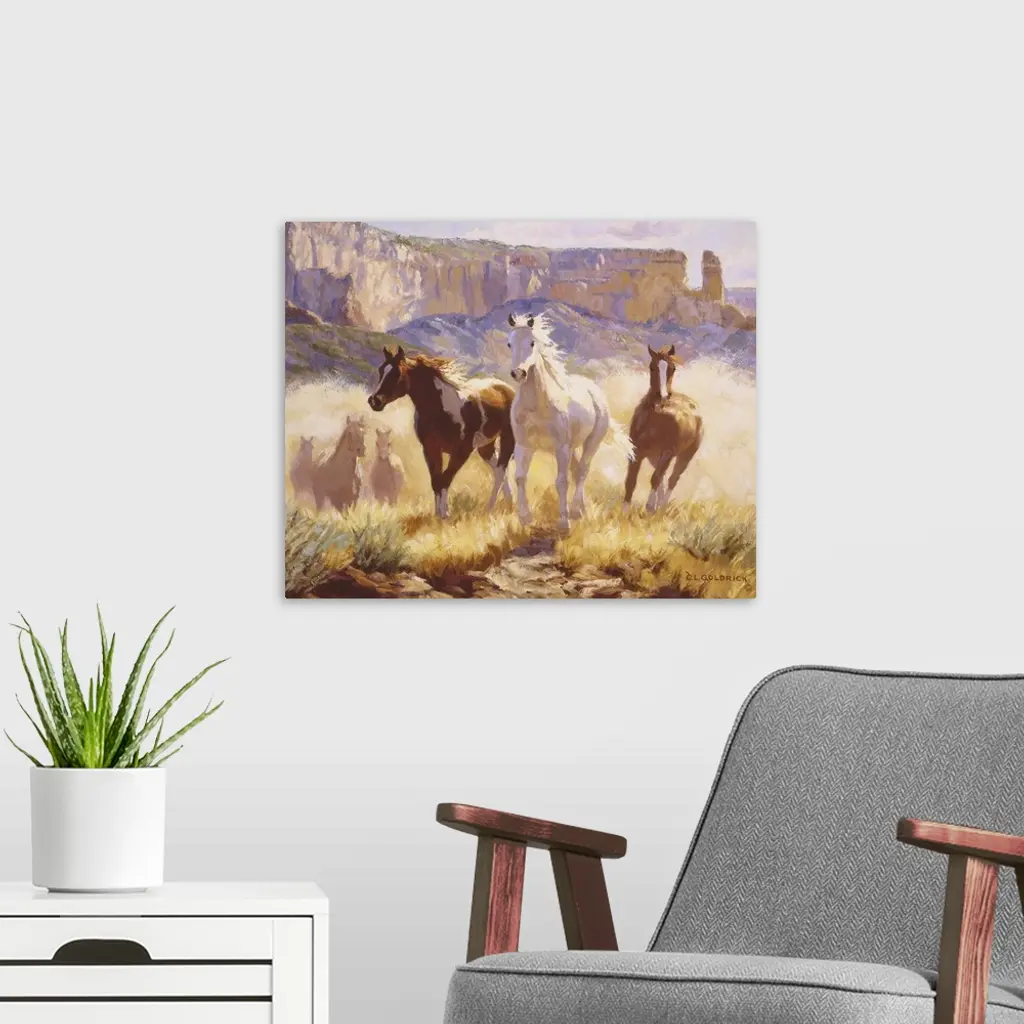 Contemporary colorful painting of a herd of horses running through a desert landscape.