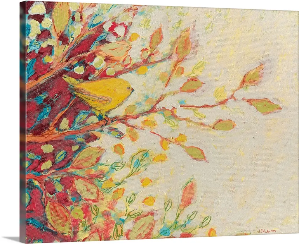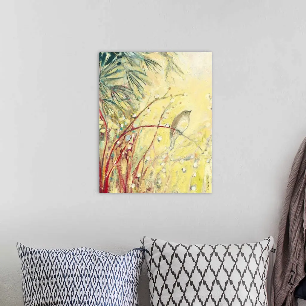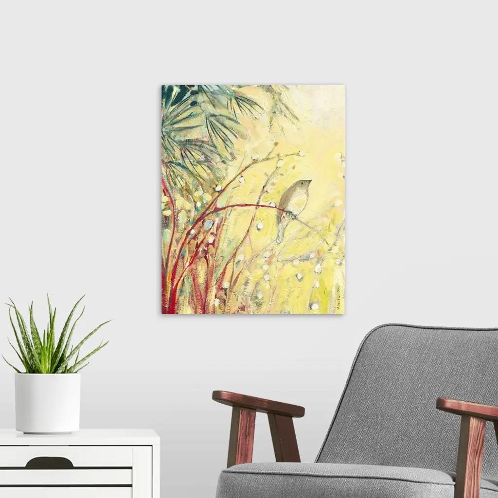 Large painted artwork of a small bird standing on a branch that is bending over and other plants surrounding it.