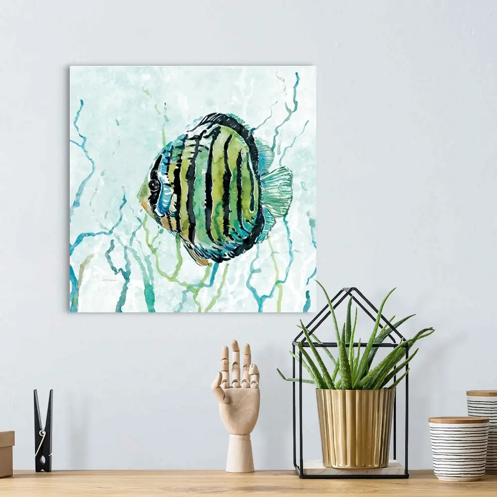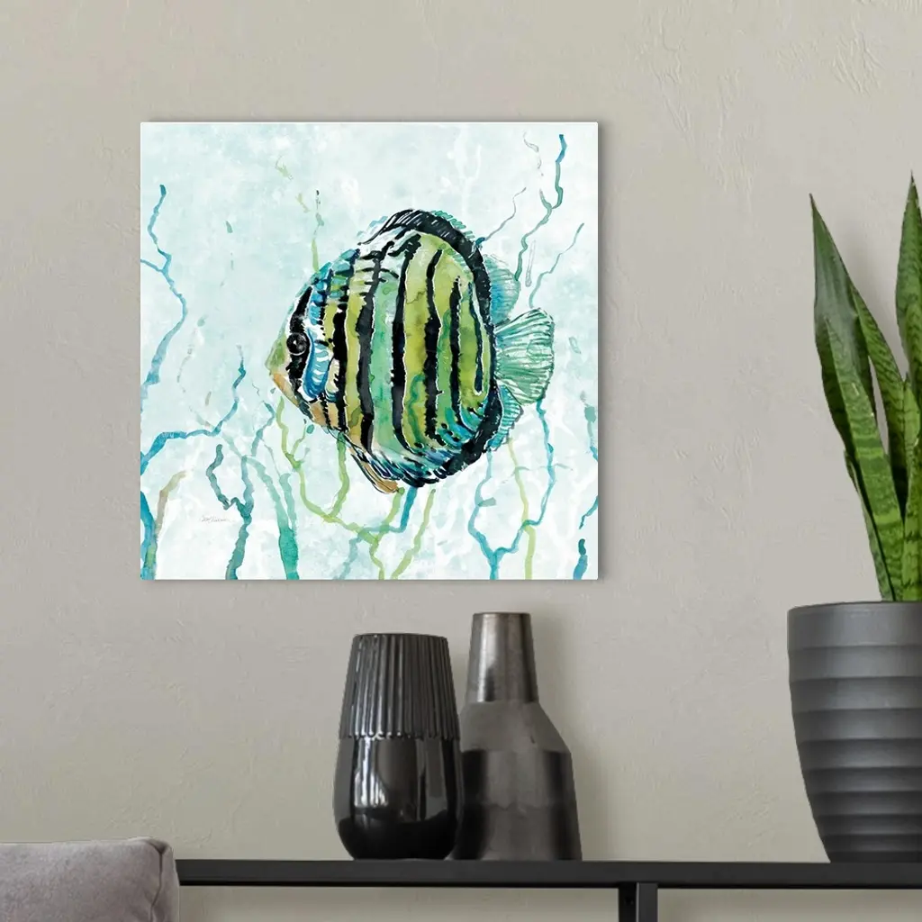 Square watercolor painting of a fish swimming through seaweed in the Outer Banks in shades of blue and green.