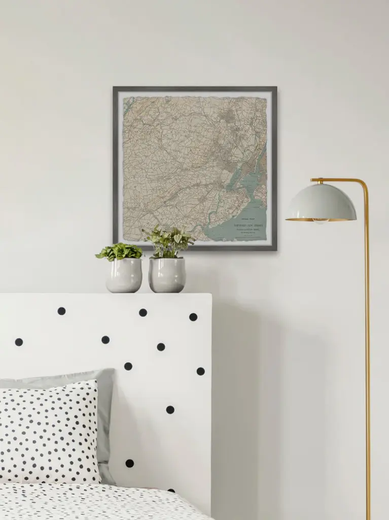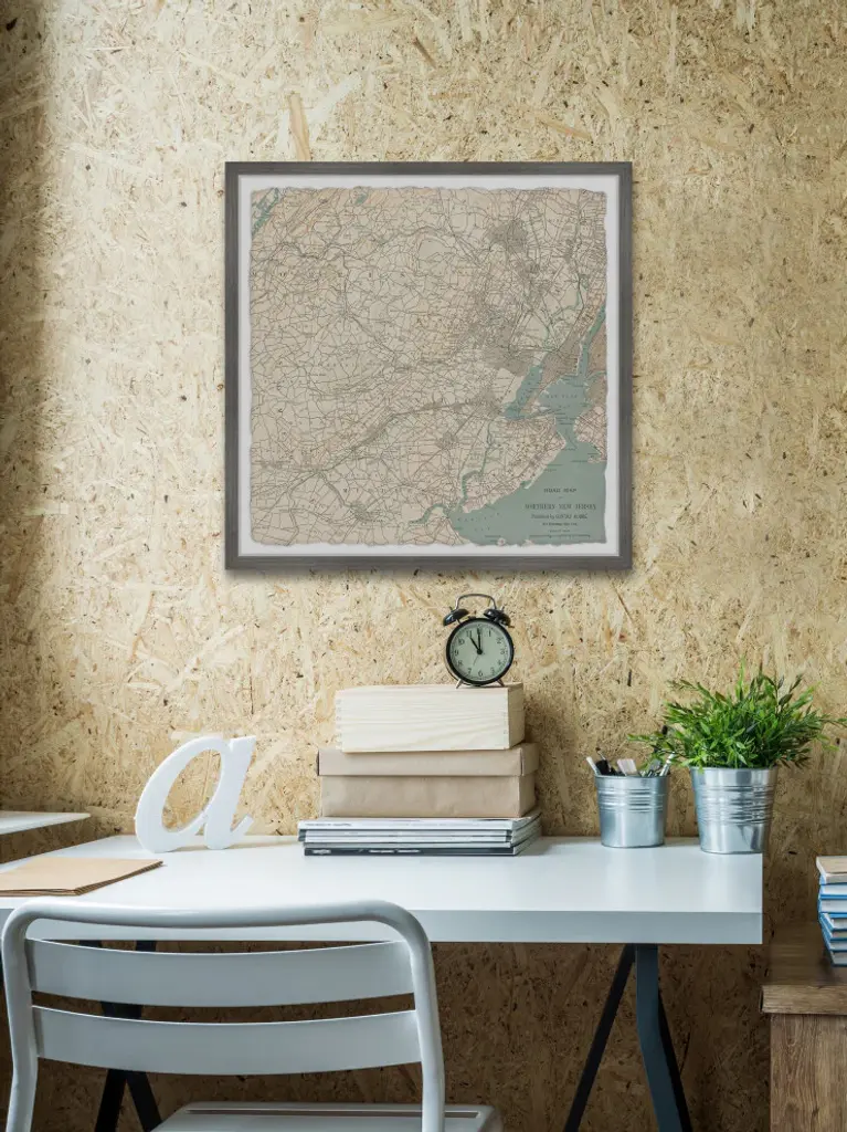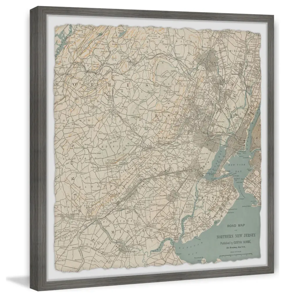 This road map of Northern New Jersey is both a functional and decorative way to learn more about the state. Proudly printed in the USA, this piece is printed on high quality archive paper and professionally hand-framed. With wall-mounting hooks included, this artful accent is ready to hang up as soon as it reaches your front door.- Top quality Gicle print on high resolution Archive Paper- Hand cut deckled edges- High quality durable non-warping frame- Finished under shatter resistant plexiglass- Arrives ready to hang- Includes a certificate of authenticity- Printed in the USA