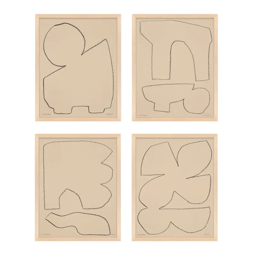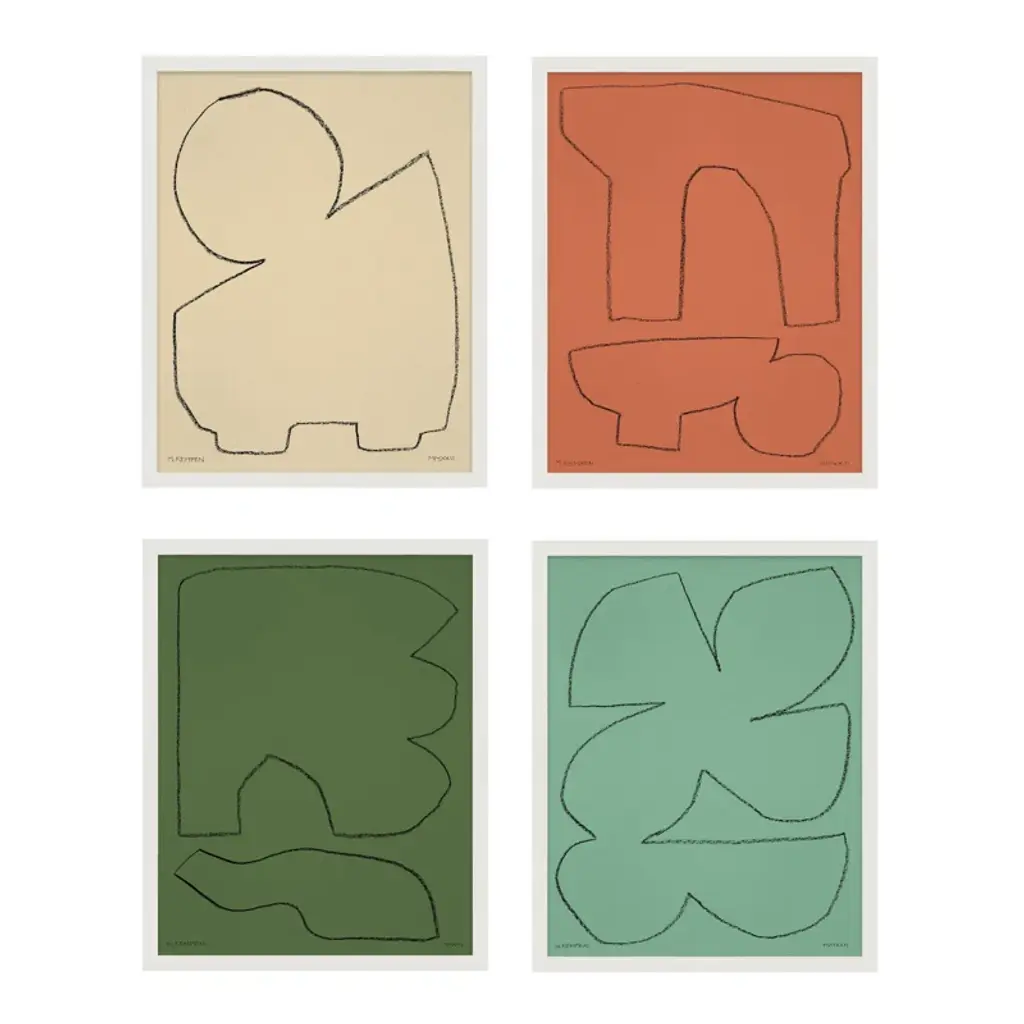 Artist Michael Kempen’s work finds a meditative quality in the balance of irregular shapes. This four-piece set pays homage to the mid-century abstract paintings of Ellsworth Kelly + Robert Motherwell. Each print arrives in a wooden frame with hanging hardware. Printed in the USA on premium paper.