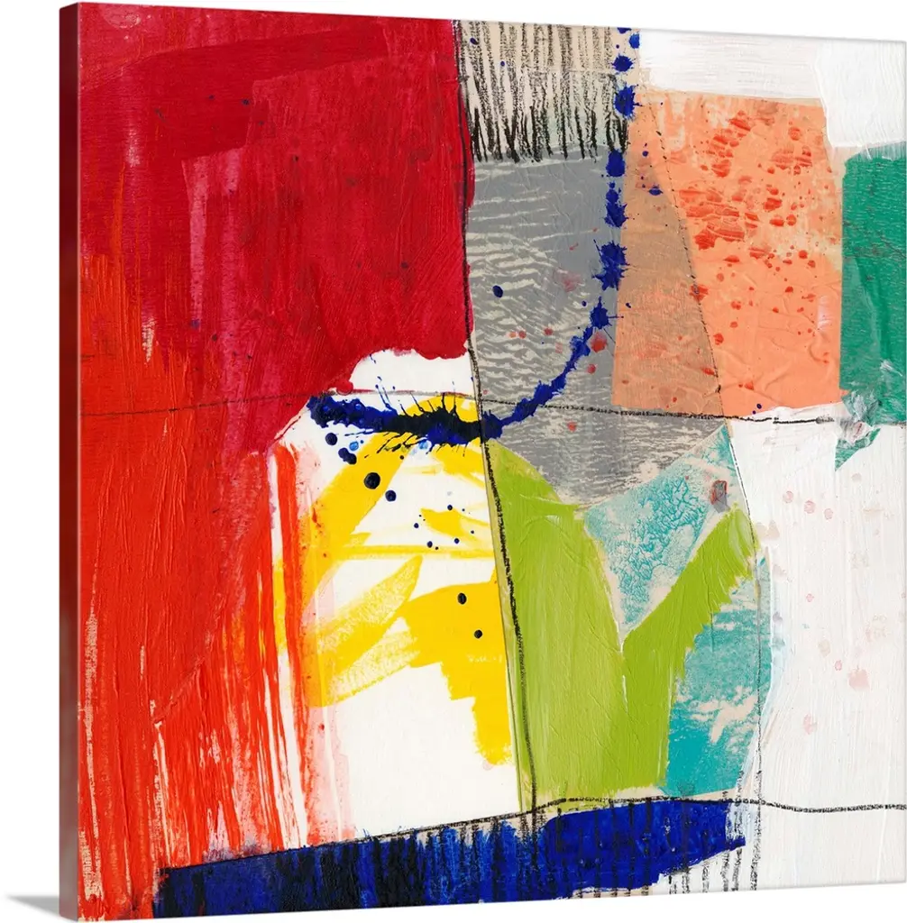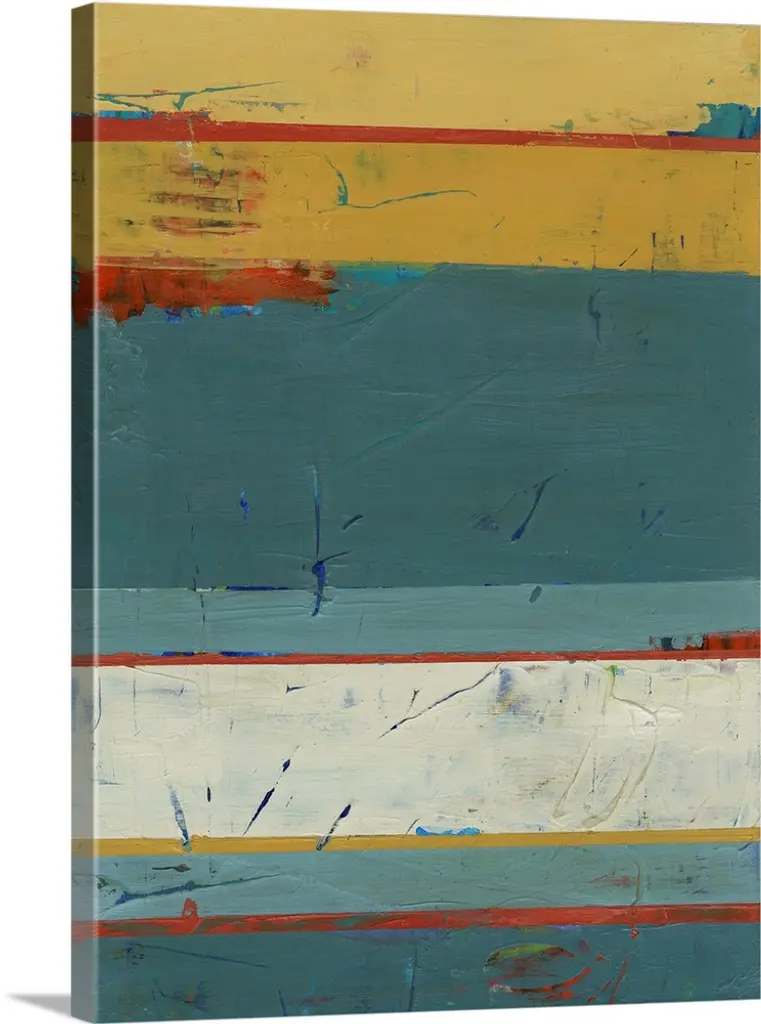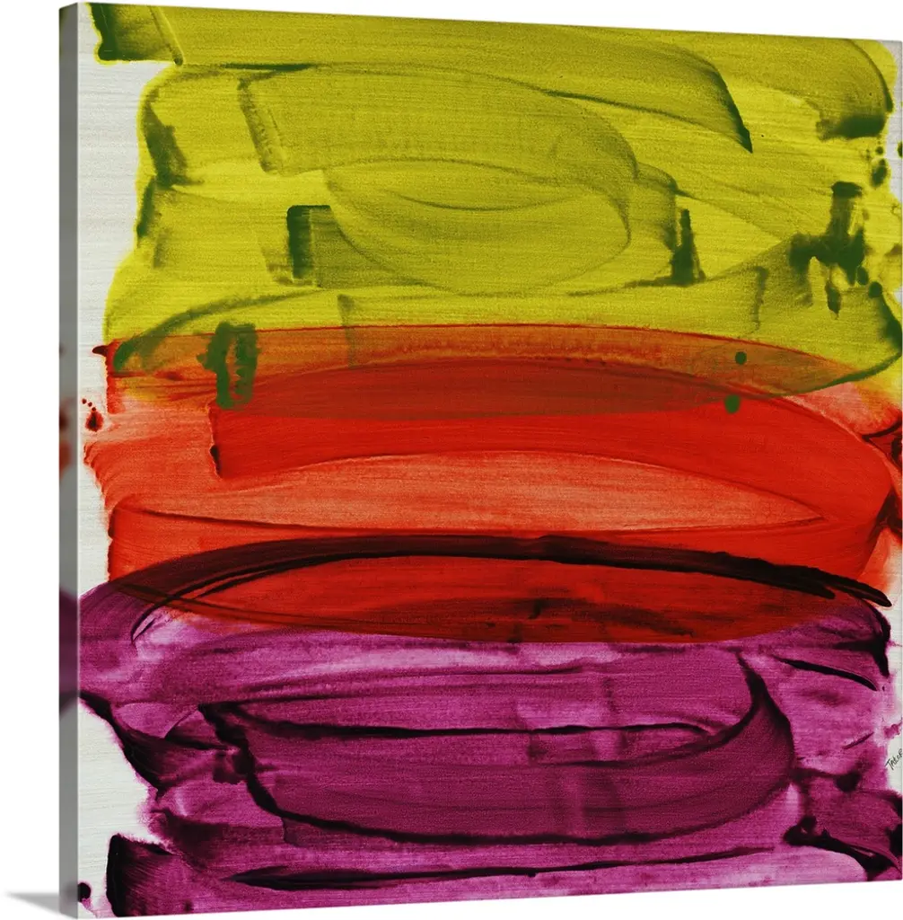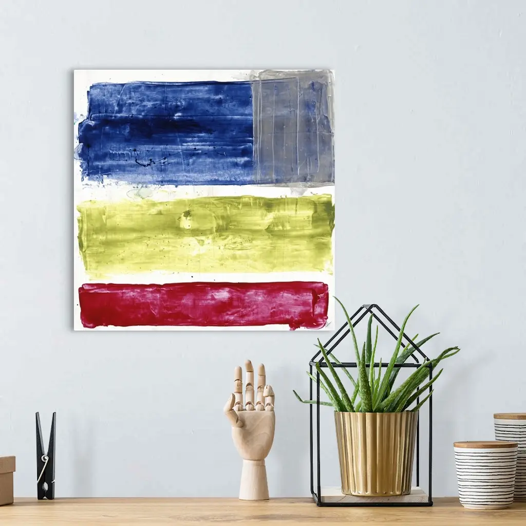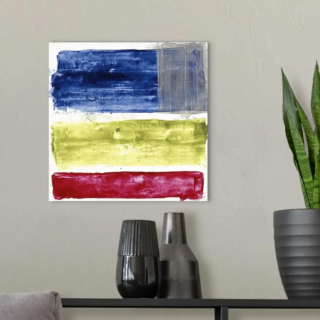 Contemporary painting of three rectangular shapes in various thicknesses and color, vertically stacked on a light neutral background.
