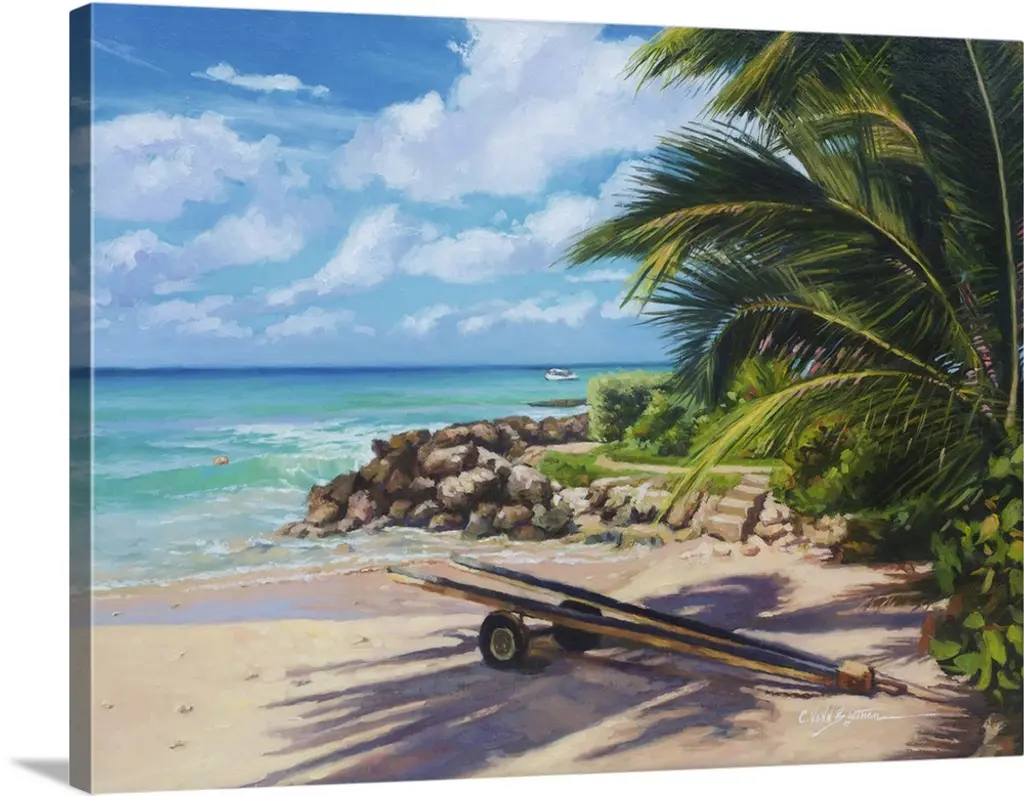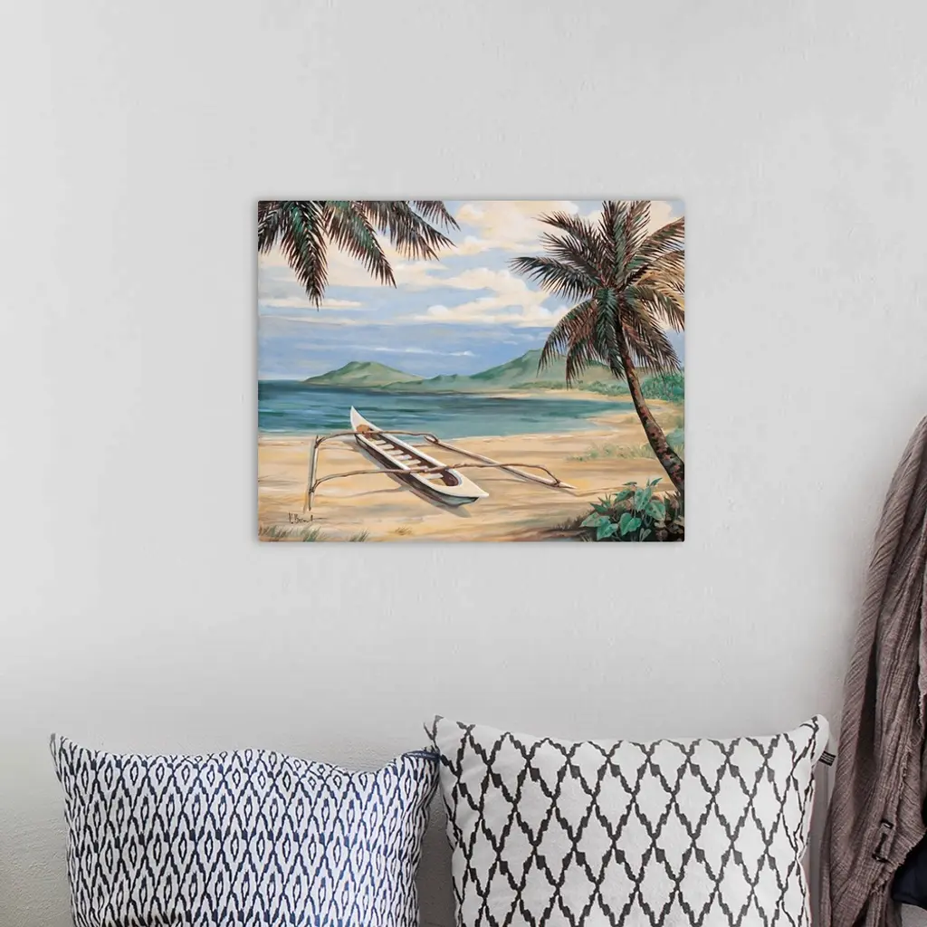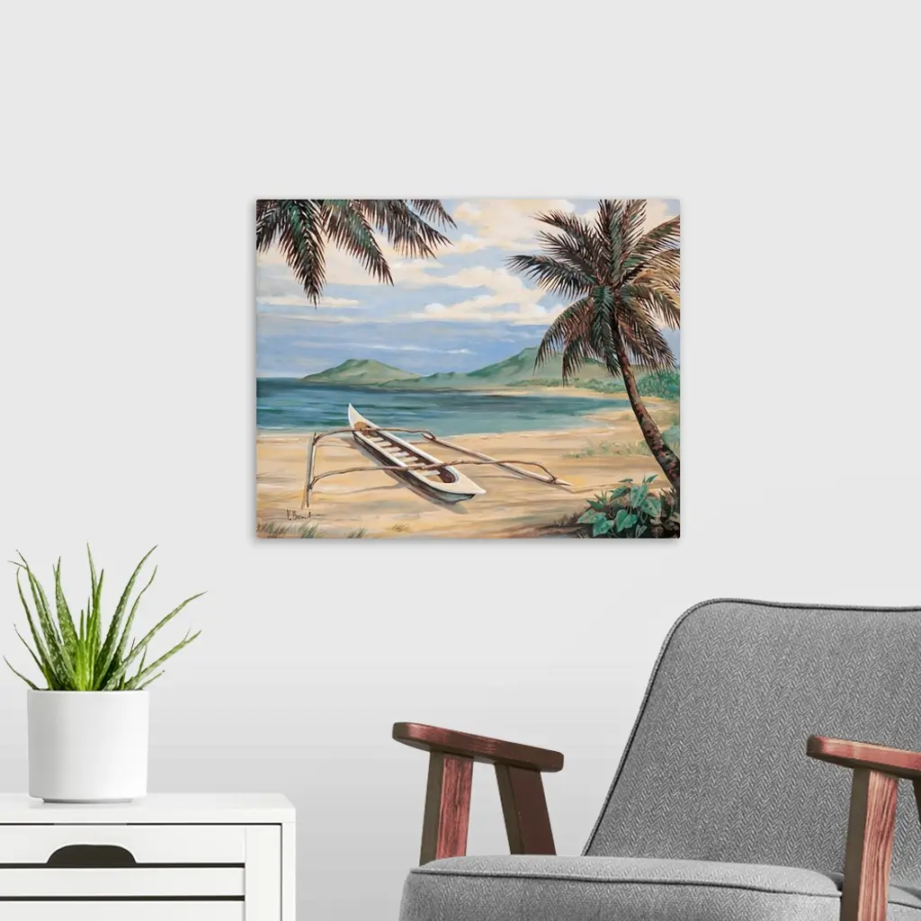 Contemporary painting of palm trees overlooking the beach with an outrigger canoe.