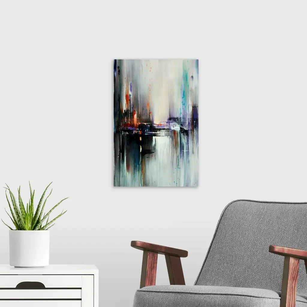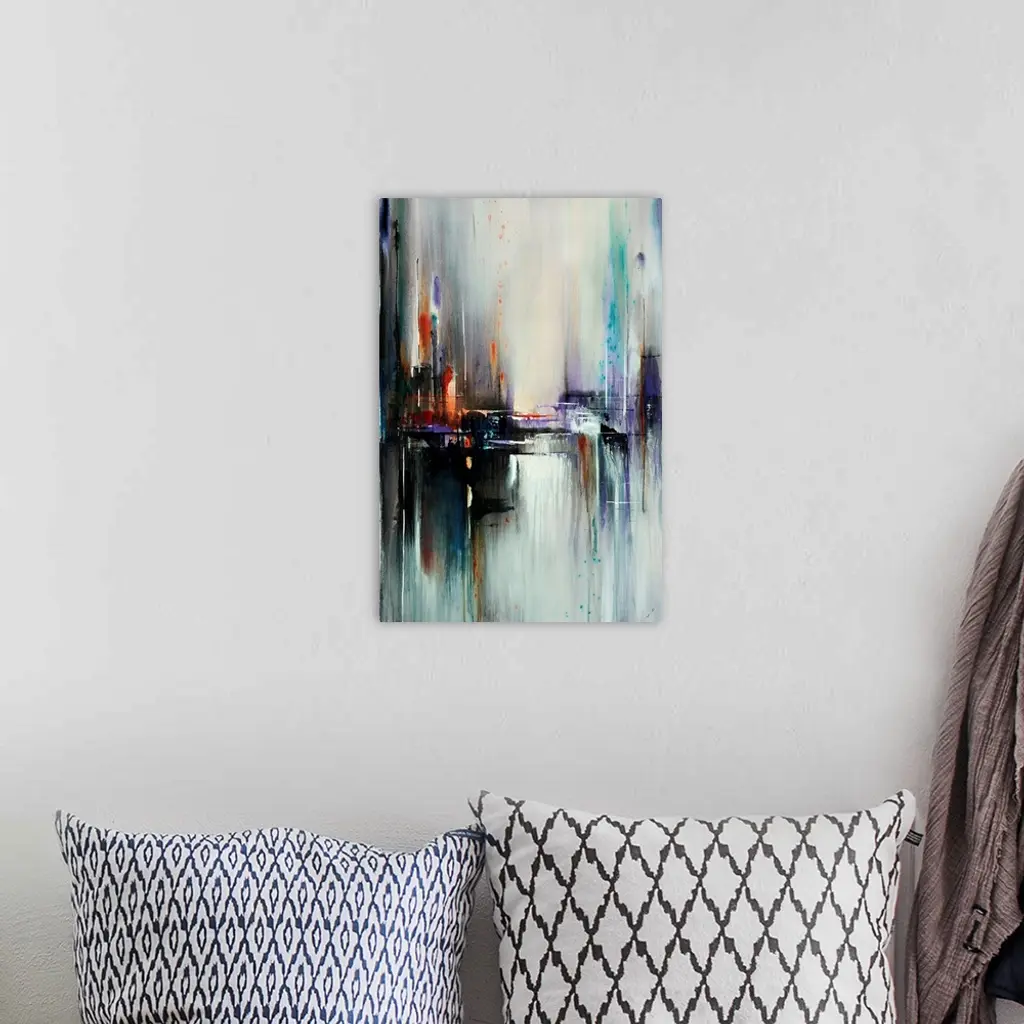 Portrait, large contemporary artwork for a living room or office of a patch, horizontal line extending through the center of the image. From that line are multi-colored, deliberate, vertical stokes that appear to descend downward on the bottom half and upward on the top half.