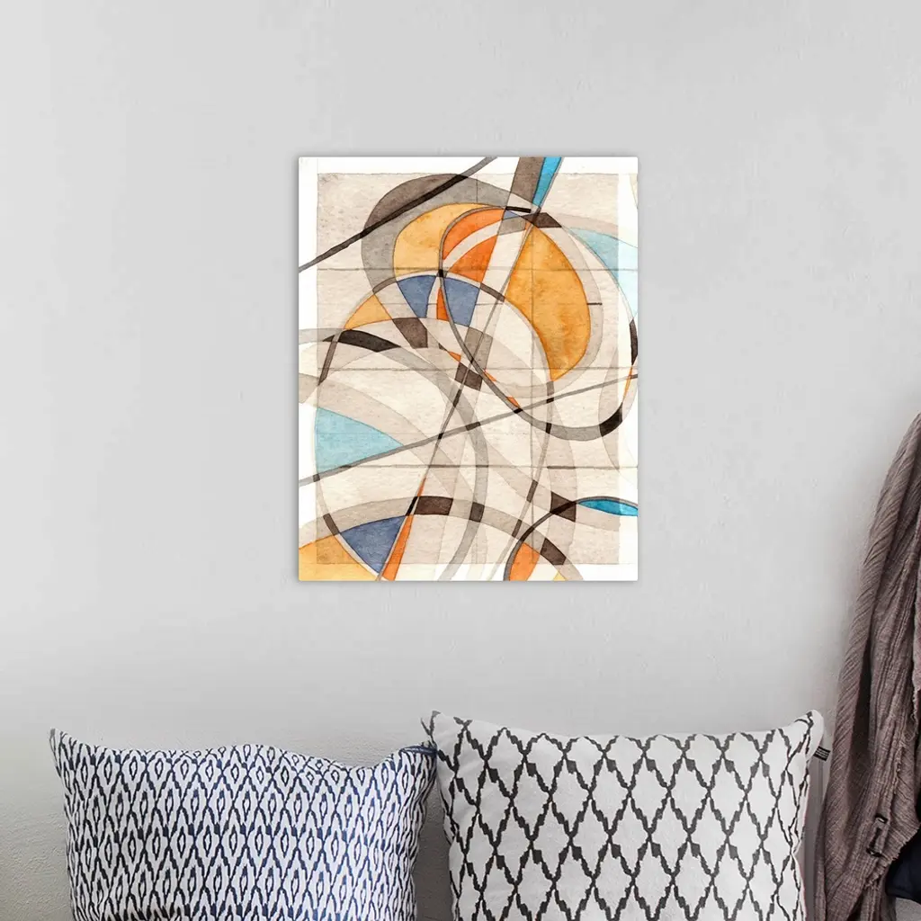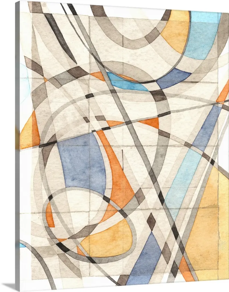 Contemporary abstract artwork using thin bold lines in overlapping criss crossing patterns with mixes of bright colors.