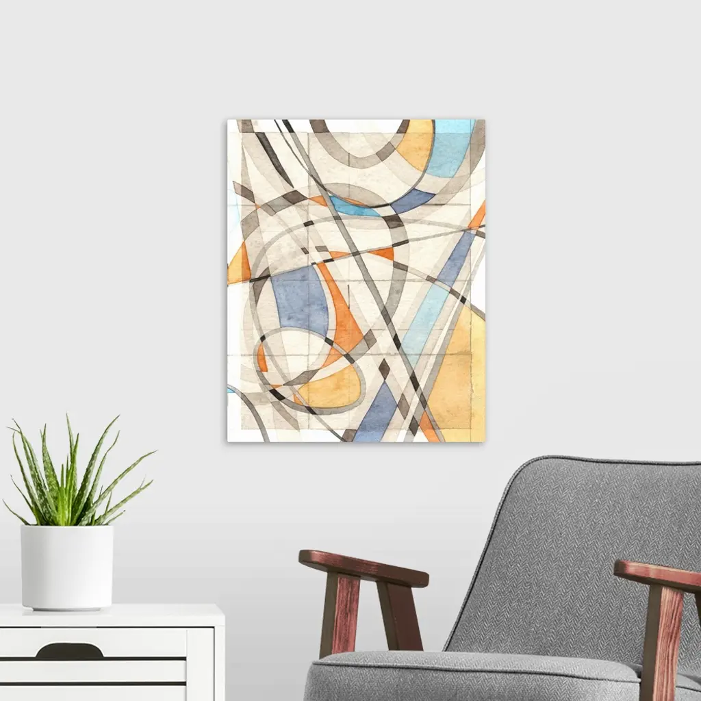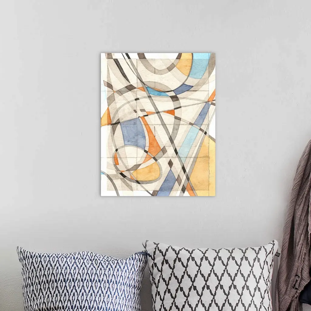 Contemporary abstract artwork using thin bold lines in overlapping criss crossing patterns with mixes of bright colors.