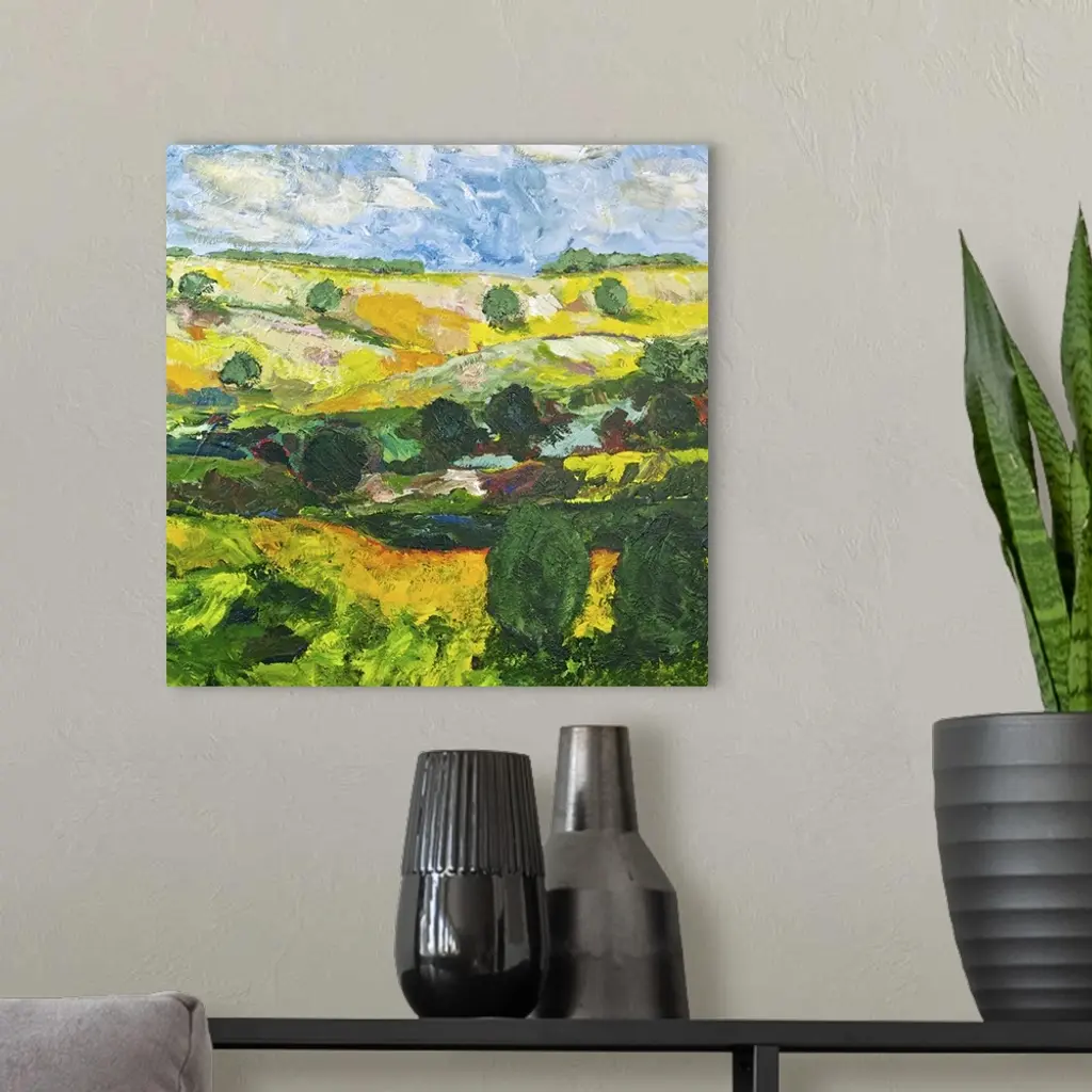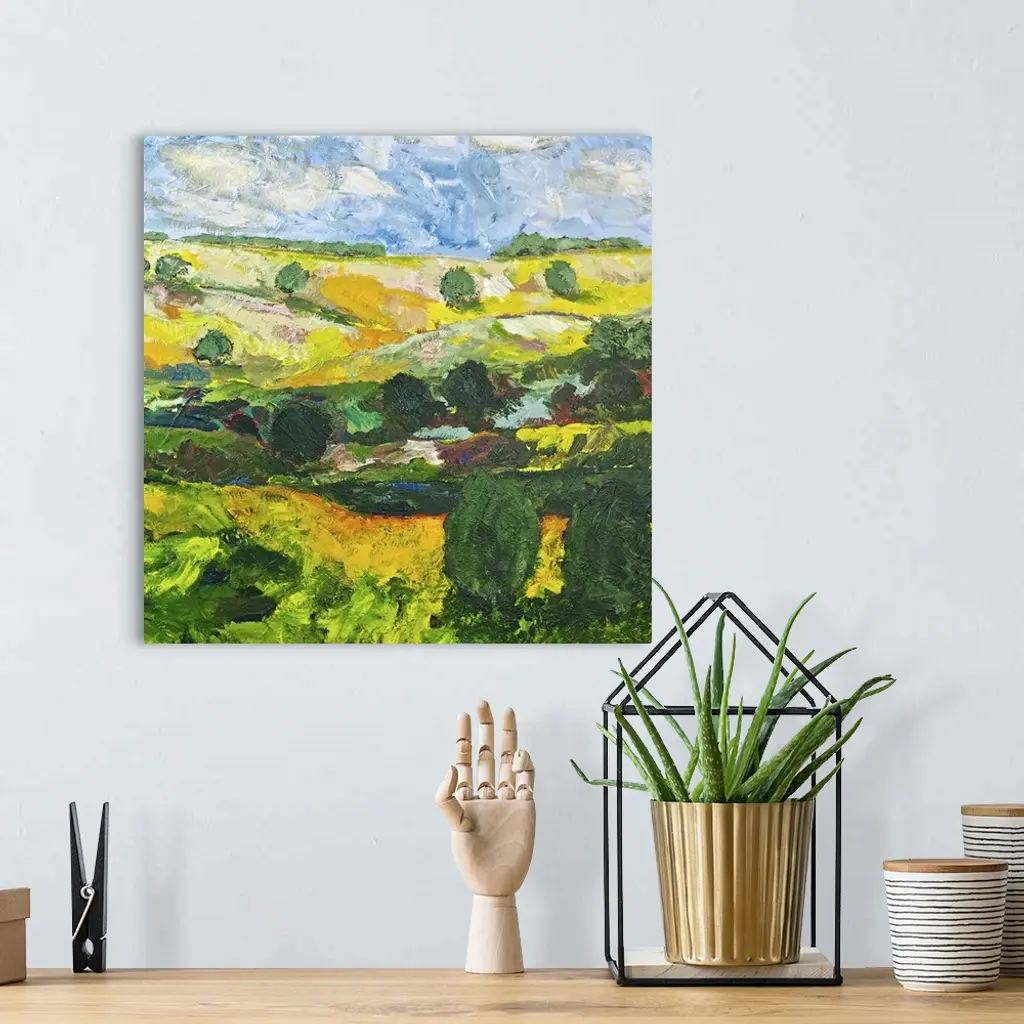 Contemporary painting of a country landscape with trees along the edges of the rolling hills.