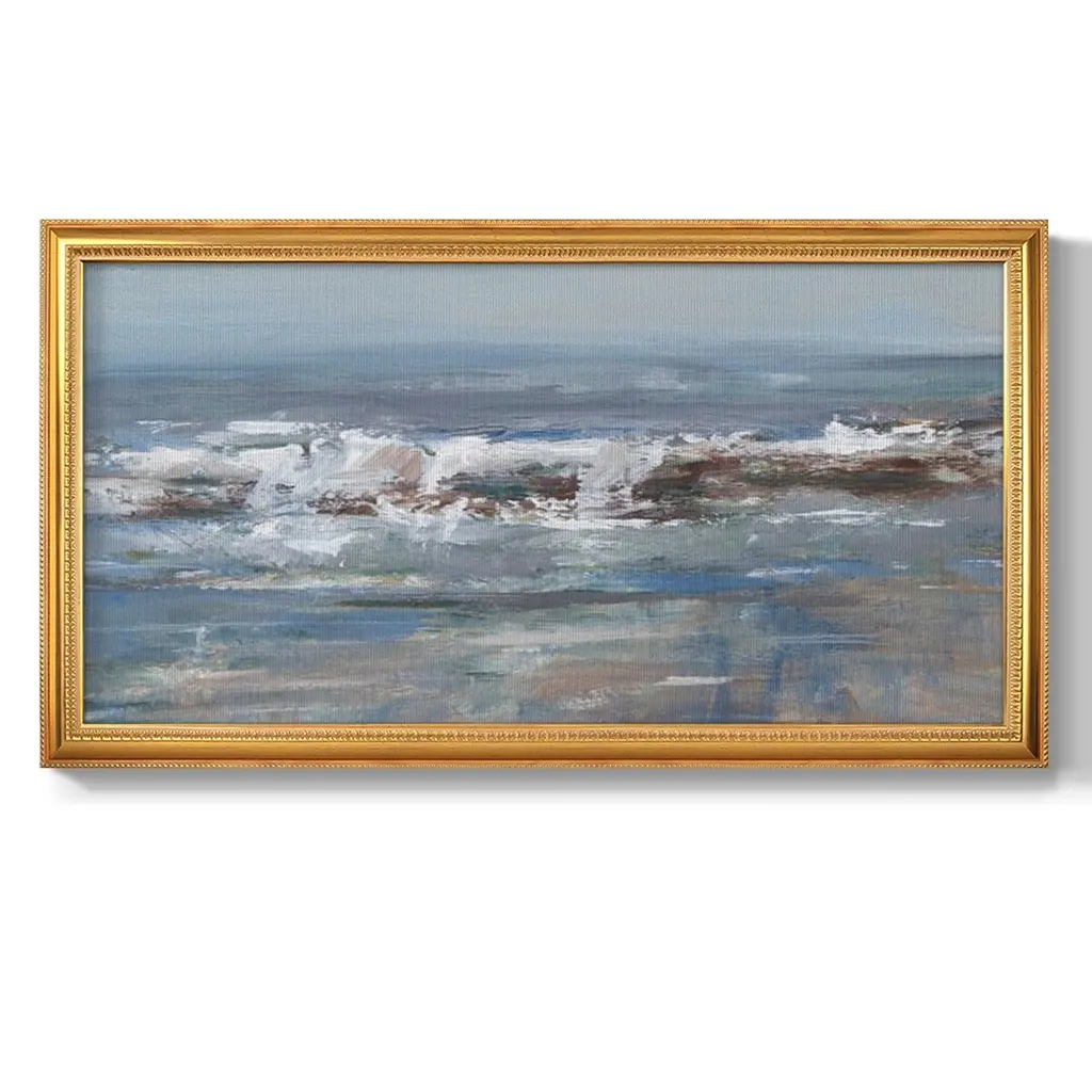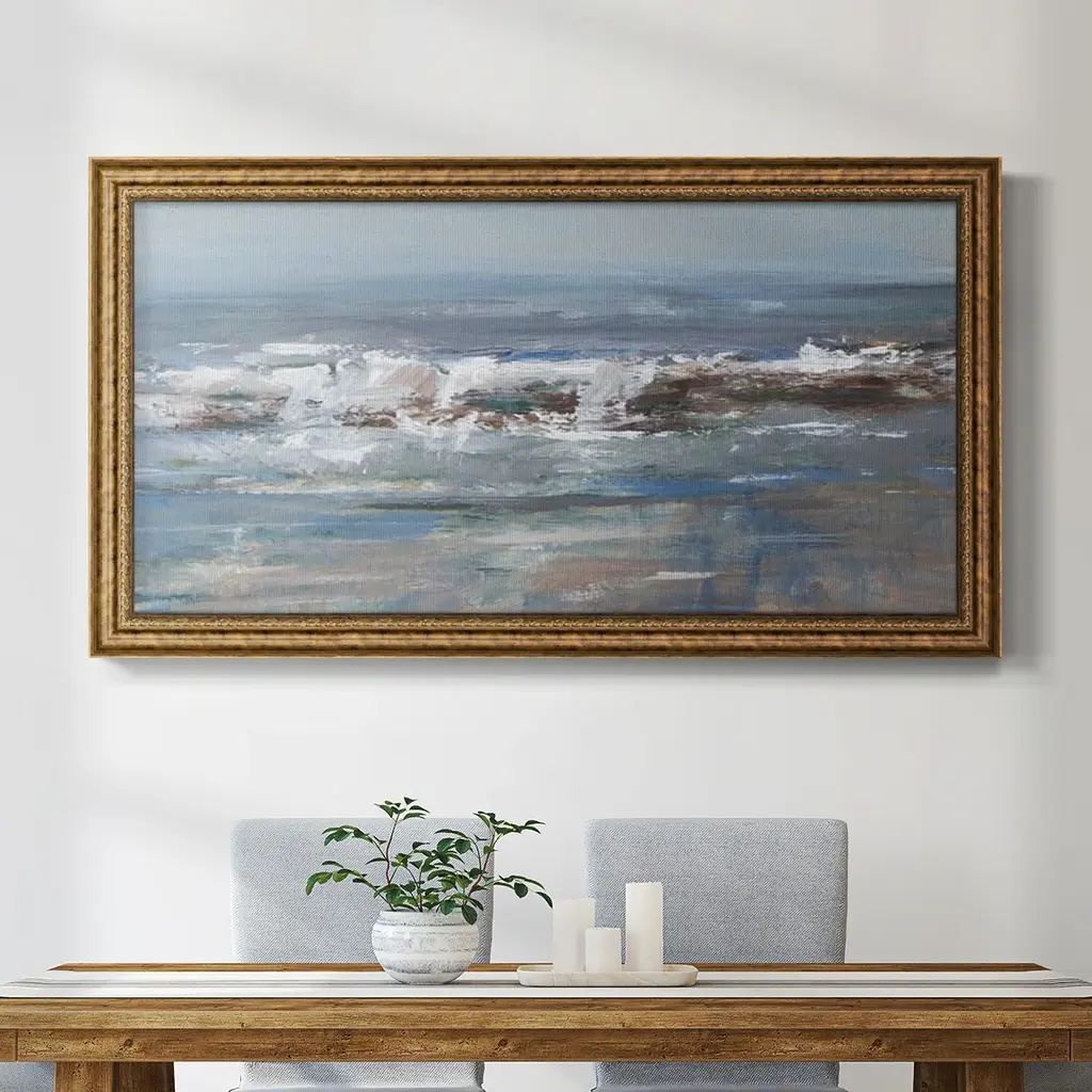 Overcast Tides I Premium Framed Canvas- Ready to Hang A Premium Framed Canvas created to last. Framed in distressed wood and available in an array of sizes and colors Featuring a beveled a solid wood stretcher bar, each piece comes ready to hand 3 SIZES AVAILABLE 21''X37'' - Overall Size 25''X45'' - Overall Size 29''x53'' - Overall Size Each piece is made to order. Each piece comes with hanging hardware. Made in the USA Ready to Hang Giclee Paper Print Acrylic Glass Beveled Matt Board