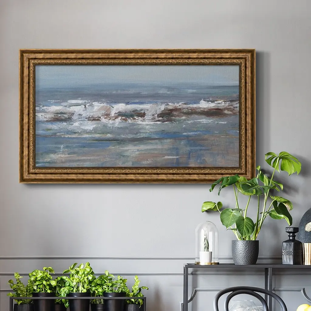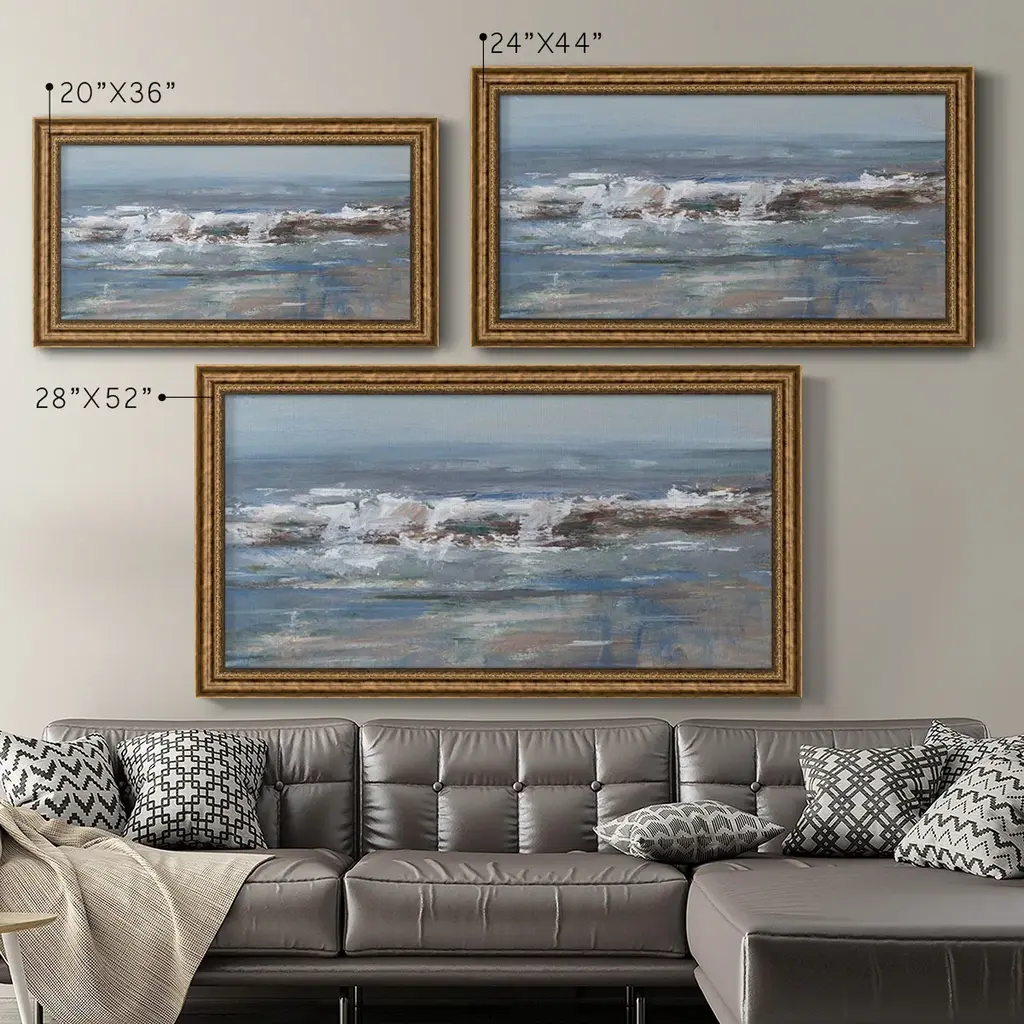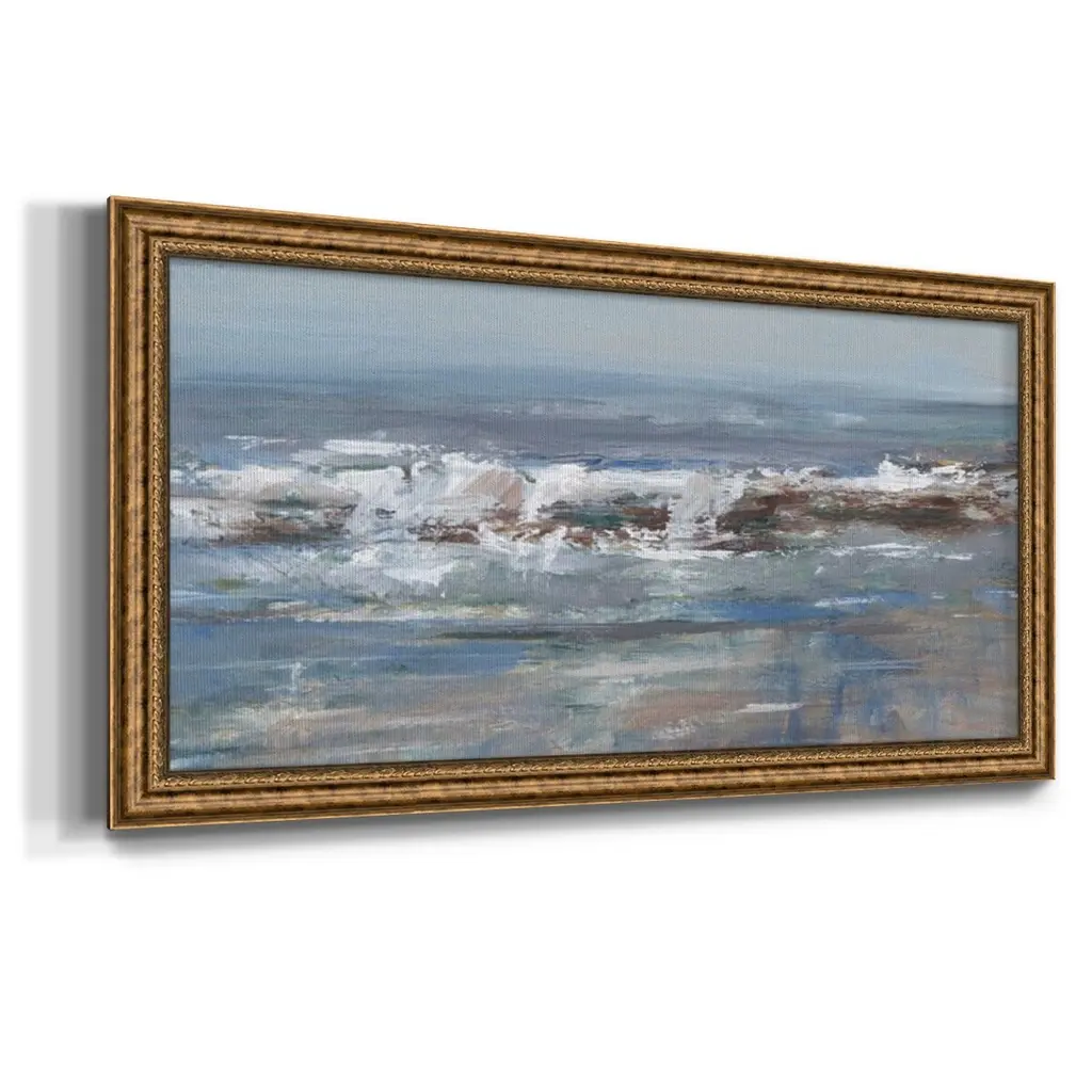 Overcast Tides I Premium Framed Canvas- Ready to Hang A Premium Framed Canvas created to last. Framed in distressed wood and available in an array of sizes and colors Featuring a beveled a solid wood stretcher bar, each piece comes ready to hand 3 SIZES AVAILABLE 21''X37'' - Overall Size 25''X45'' - Overall Size 29''x53'' - Overall Size Each piece is made to order. Each piece comes with hanging hardware. Made in the USA Ready to Hang Giclee Paper Print Acrylic Glass Beveled Matt Board