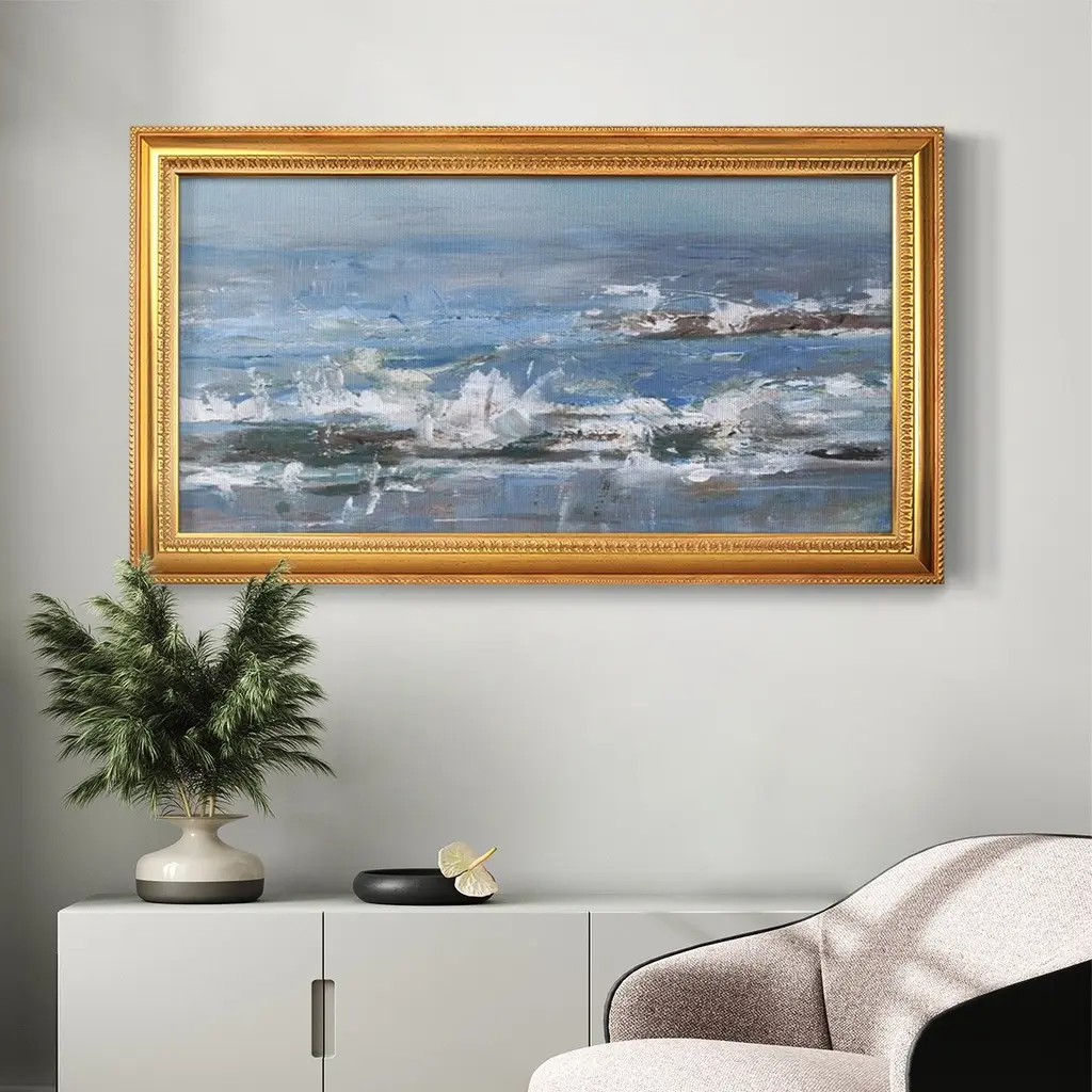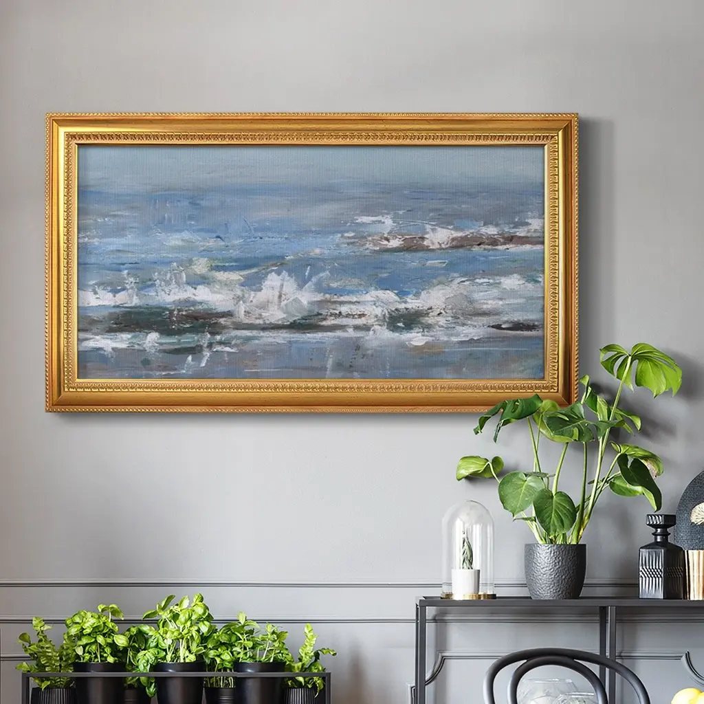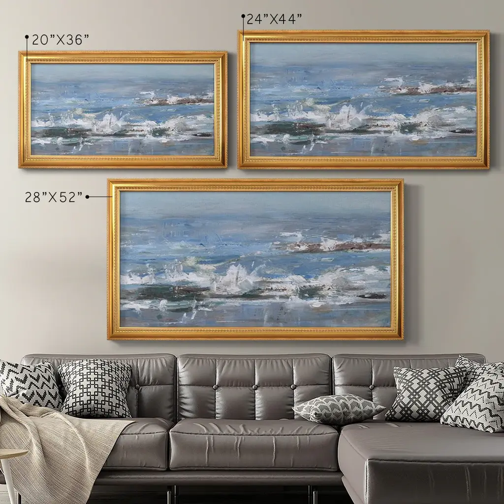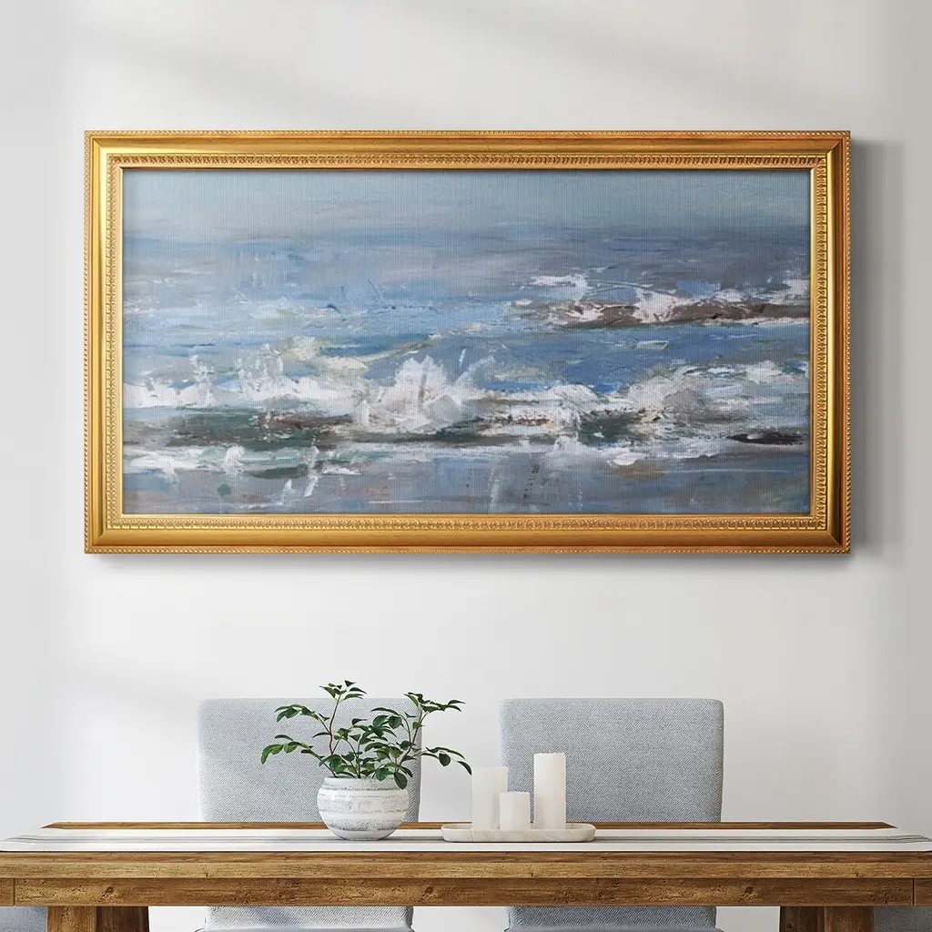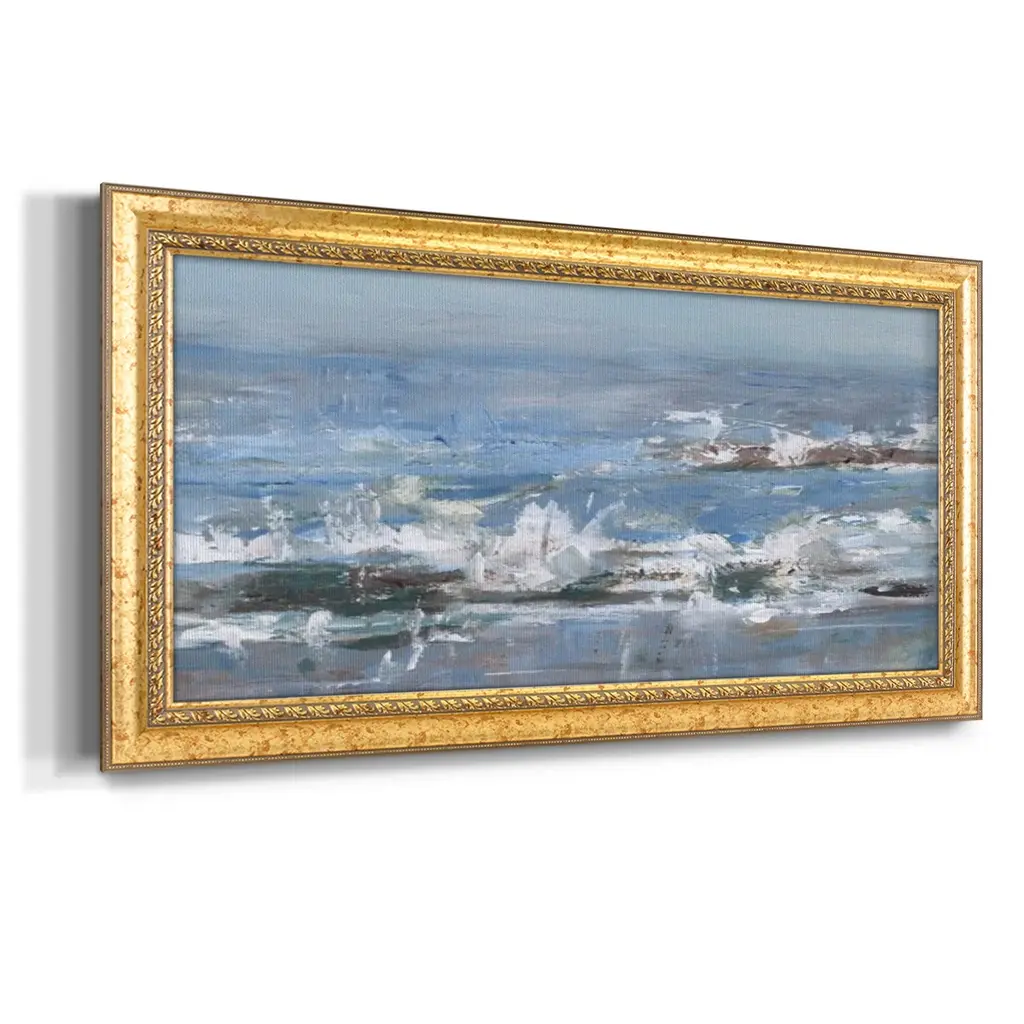 Overcast Tides II Premium Framed Canvas- Ready to Hang A Premium Framed Canvas created to last. Framed in distressed wood and available in an array of sizes and colors Featuring a beveled a solid wood stretcher bar, each piece comes ready to hand 3 SIZES AVAILABLE 21''X37'' - Overall Size 25''X45'' - Overall Size 29''x53'' - Overall Size Each piece is made to order. Each piece comes with hanging hardware. Made in the USA Ready to Hang Giclee Paper Print Acrylic Glass Beveled Matt Board